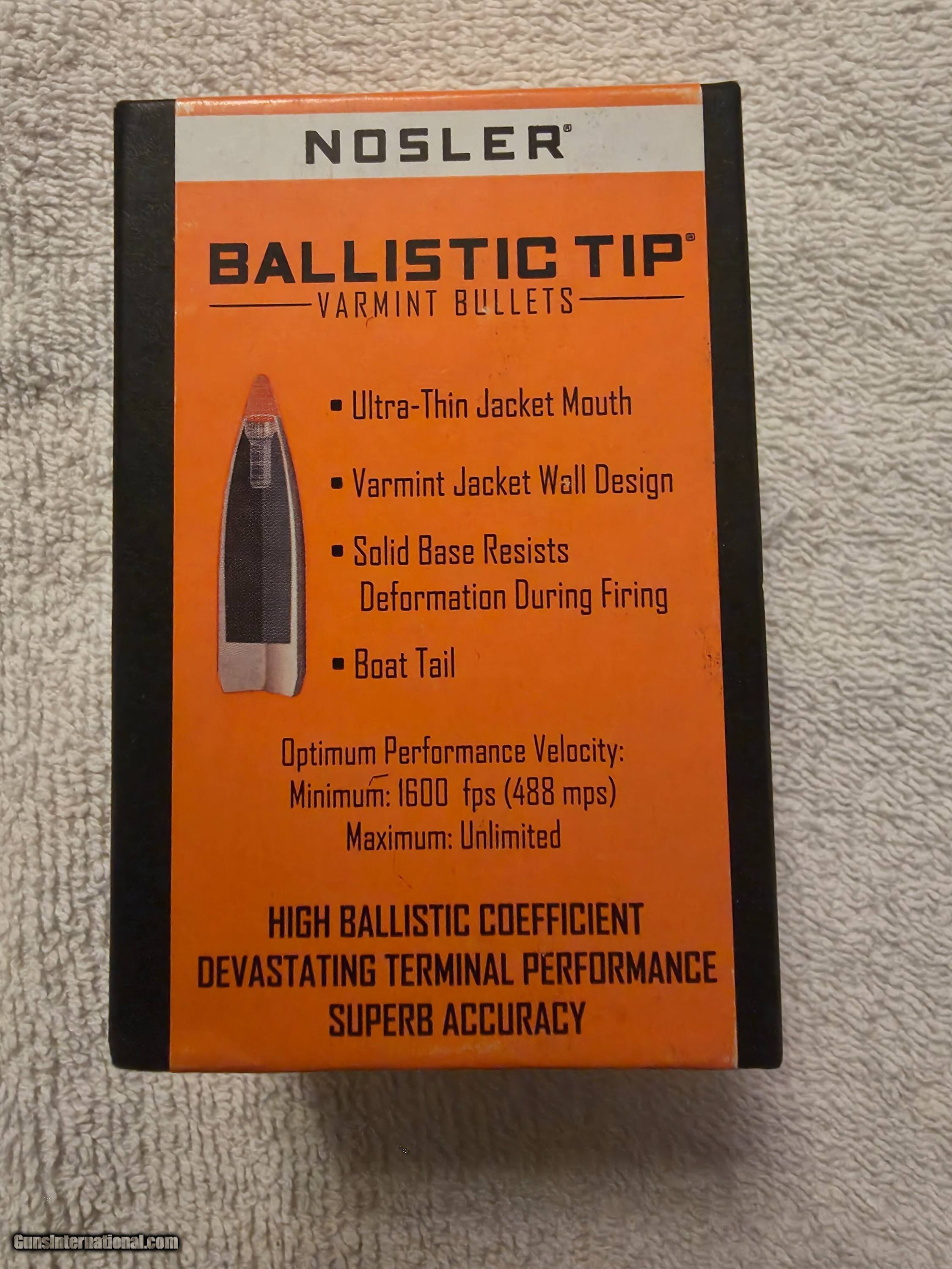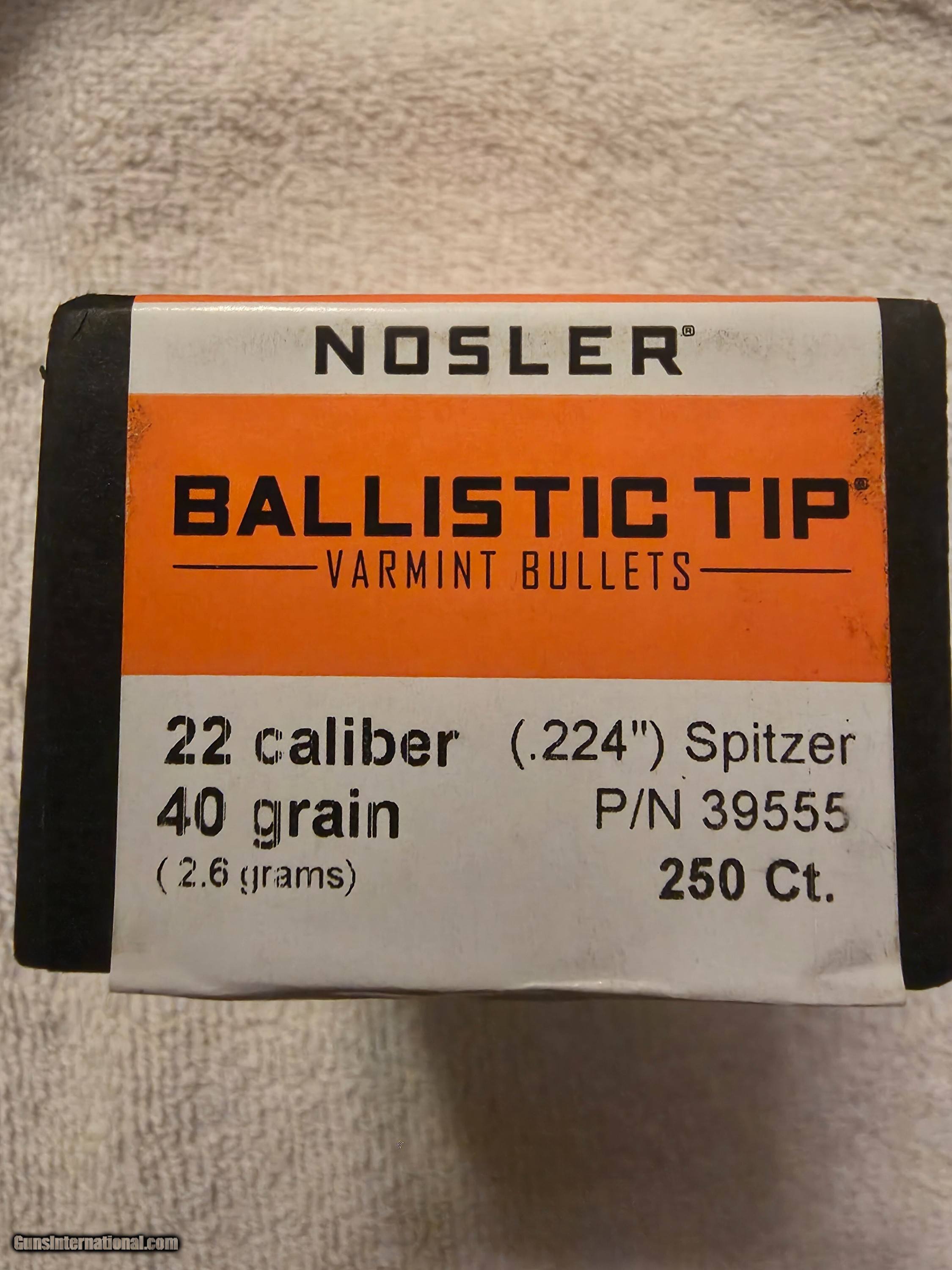 Description: New never opened box of Nosler .224 cal 40 grain Ballistic Tip bullets. 250 ct Buyer pays shipping Price: $72.00 Contact Seller |