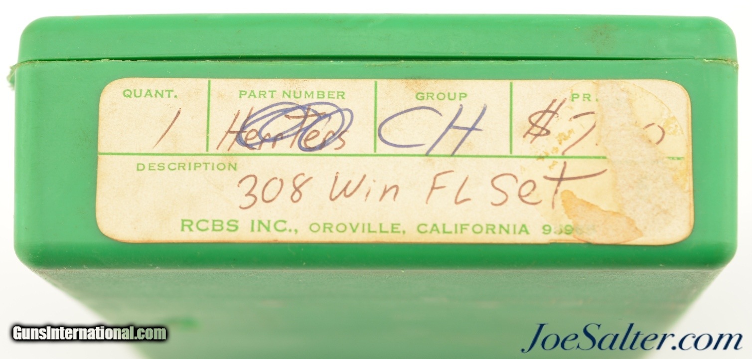 Description: This is a used, 2 die, FL set for the .308 Winchester. Housed in a non-matching RCBS green plastic case the used dies are in excellent condition and come with 6 spare de-capping pins.; SOLD |