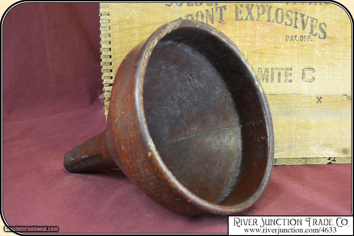 Description: If your into antique ammunition, powder cans, powder kegs here is something for your collection that is rare and hard to find. This is a Large "No static" powder funnel used to fill gunpowder kegs in the manufacturing of gunpowder (black powder). This funnel is in very good conditions, with only a tinny bit of flacking at the spout. It is about 11 inches tall, 8 inches wide on the large end and 1 1/8 inches on the small end. Otherwise as good as the day it was made. I have had many of the kegs but never found one of these. It is made of a kind of paper mache. Payment Cash, postal money order, cashiers check, personal & business checks. Can be ordered with a credit card or paypal at wxx.riverjunction,cxx just type in the number 4633 in the search box. SOLD |