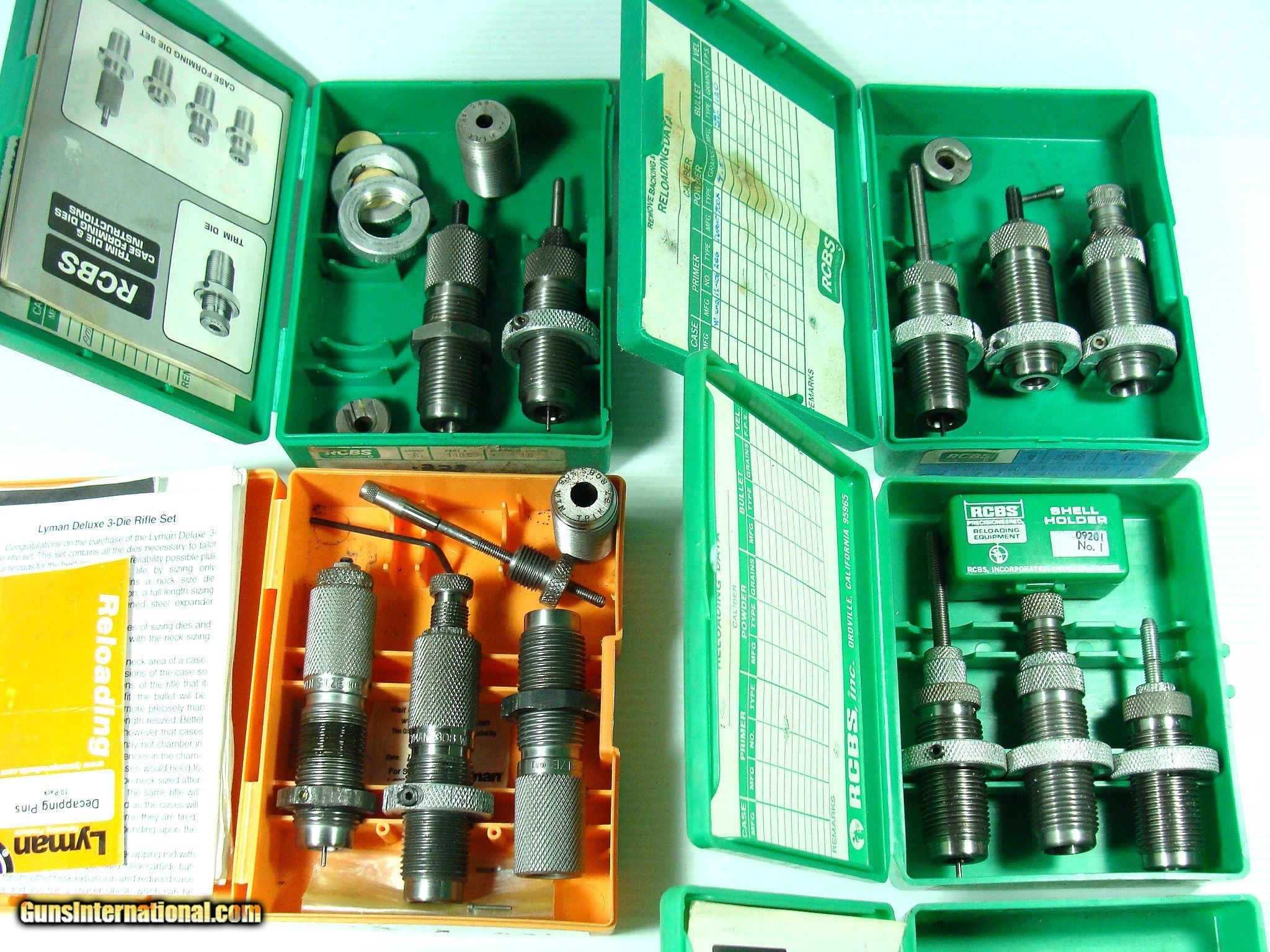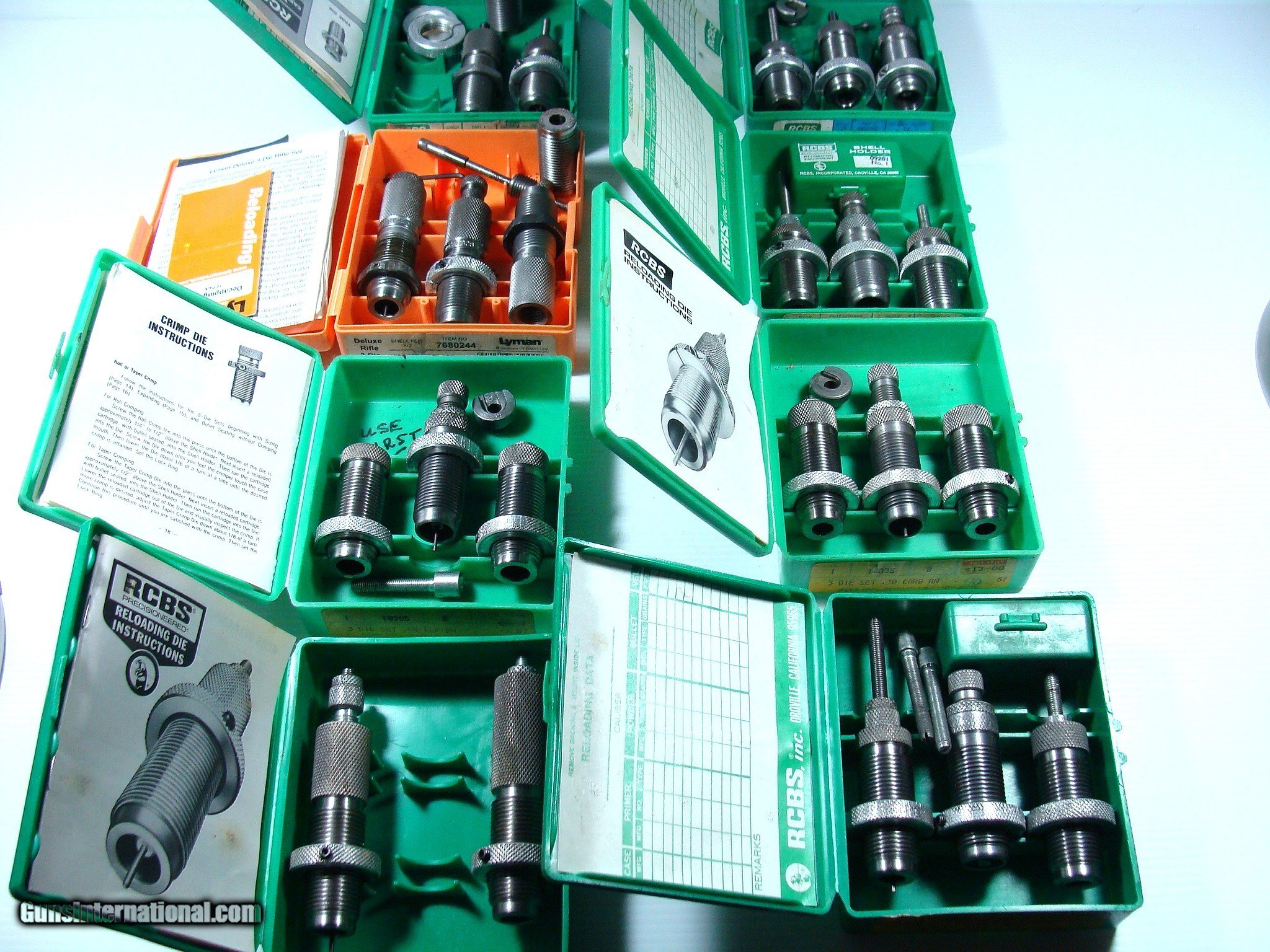RCBS RELOADING DIES IN EIGHT DIFFERENT CALIBERS IN THE BOXES COMPLETE WITH SHELL HOLDERS AND INSTRUCTIONS