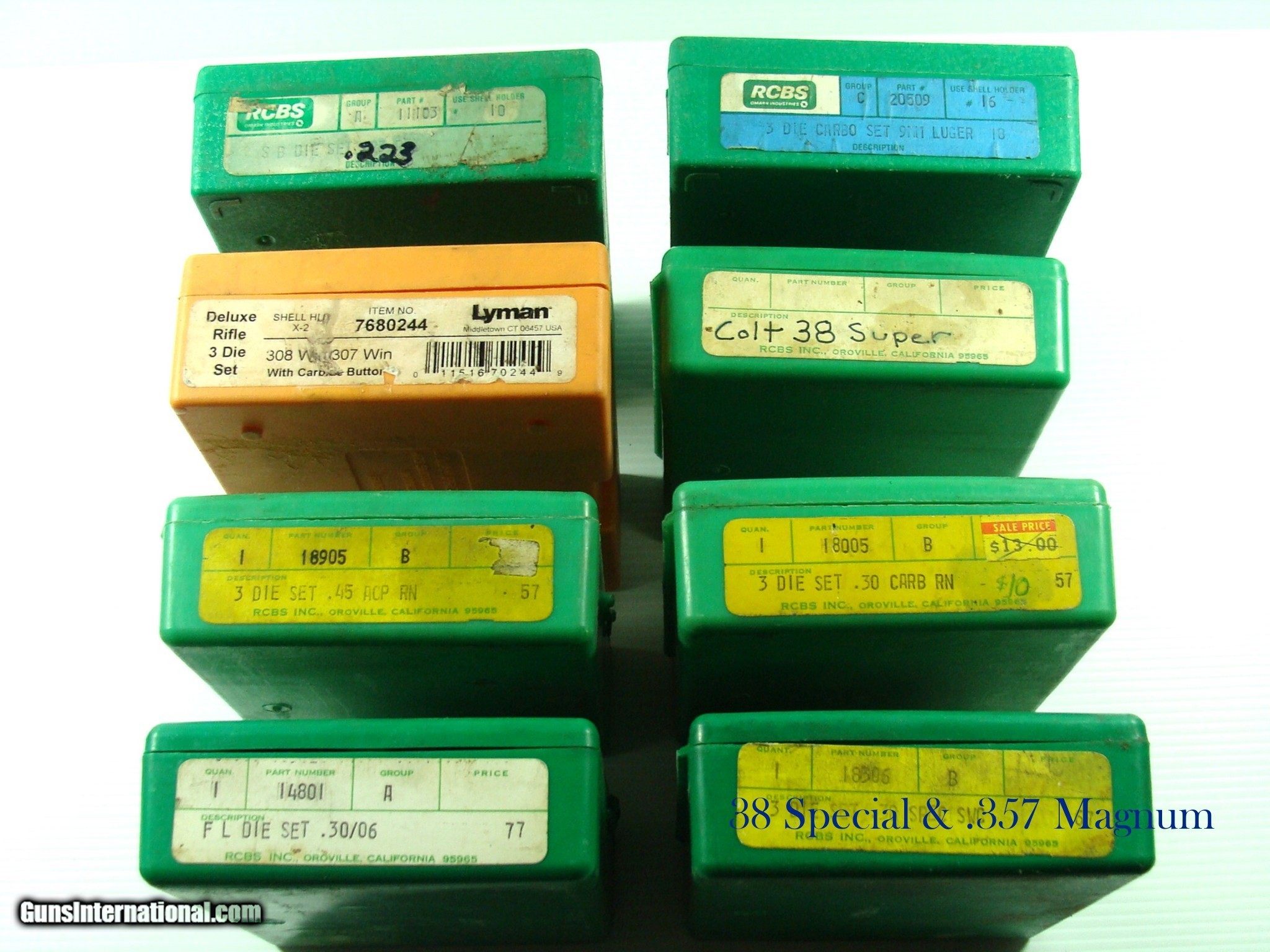 Description: RCBS RELOADING DIES IN EIGHT DIFFERENT CALIBERS IN THE BOXES COMPLETE WITH SHELL HOLDERS AND INSTRUCTIONS. . The calibers are: 30/06, 9mm Luger w/Carbide Resizing Die, .223/5.56 with Trim Die, .38 Super, 30 Carbine RN, .45ACP w/RN & Semi-Wadcutter Seating Plug, .38 Special/357 Magnum, .308 Winchester/7.62 Nato w/Trim Dye (Lyman Die Set). All are in excellent condition with no wear as brass doesn't wear down hardened steel. There is handling stains on the plastic containers. These eight sets were all purchased new by me. Never used for range reloading, just my average personal use. My age and health demands I give up reloading. I will also include a Lee Mfg. Auto Prime Kit with all necessary needed parts. Note! 30/06, 45ACP, and .308 Winchester all take the same case holder, only one provided for all three). To purchase these die sets new run $35-$60 each new. SOLD |