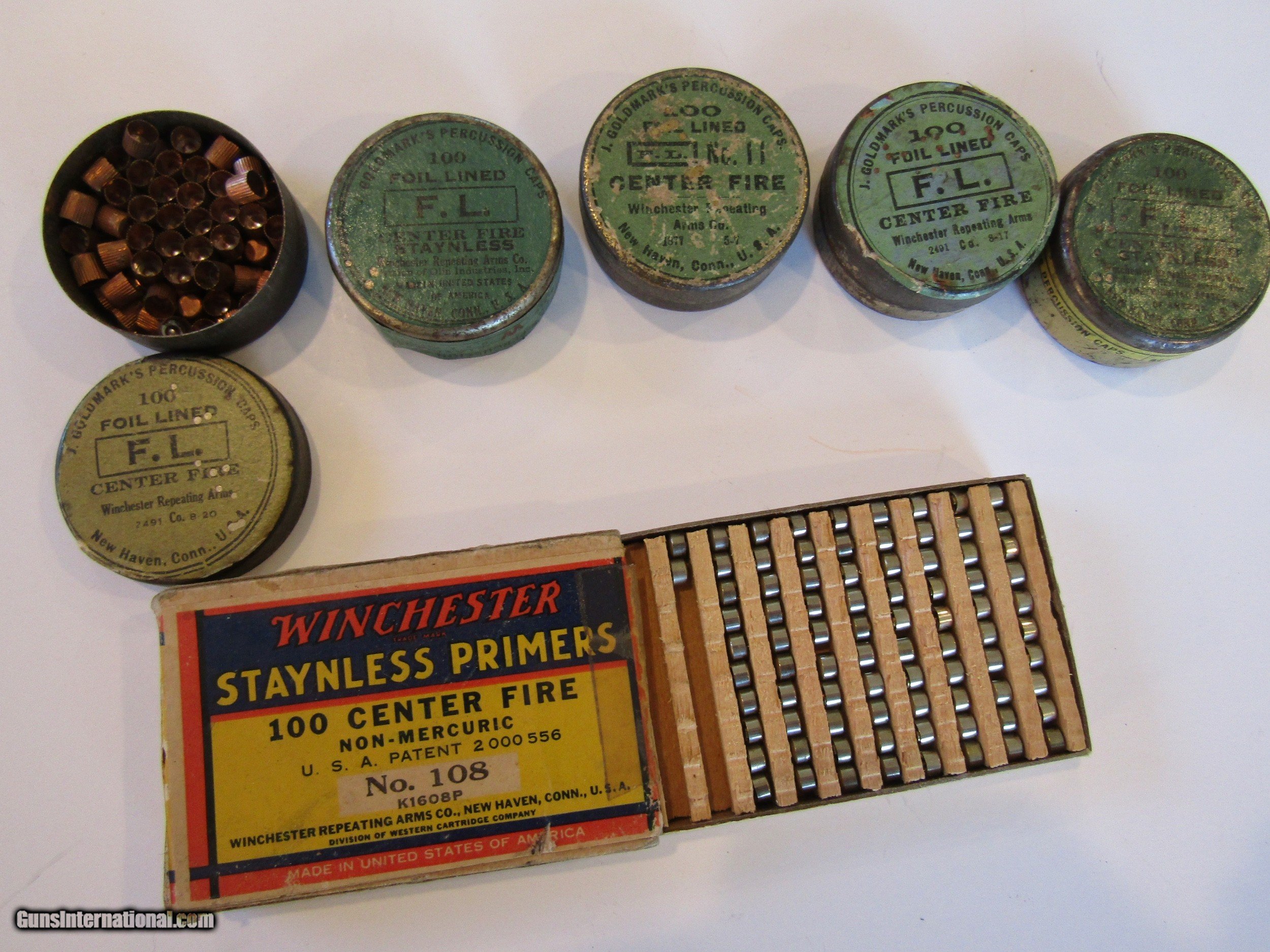 7 PERCUSSION CAP CANS, WINCHESTER REPEATING ARMS, ALL FULL BUT ONE EMPTY & ONE 1940 ERA STAYLESS PRMERS