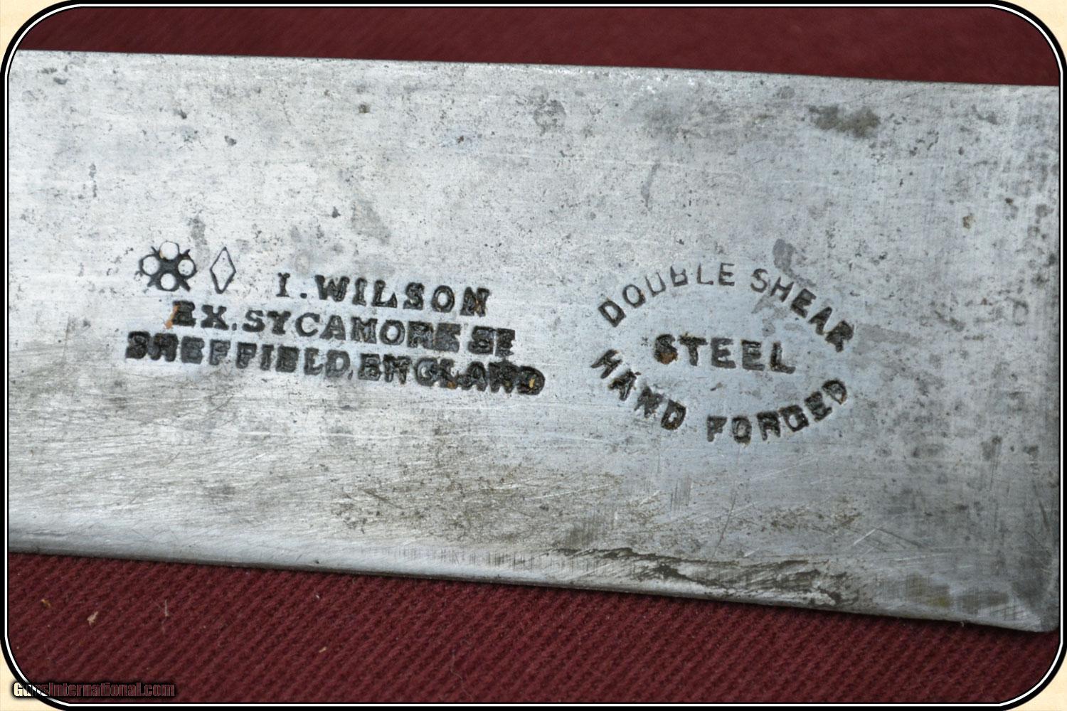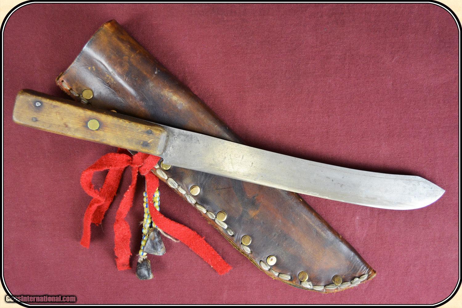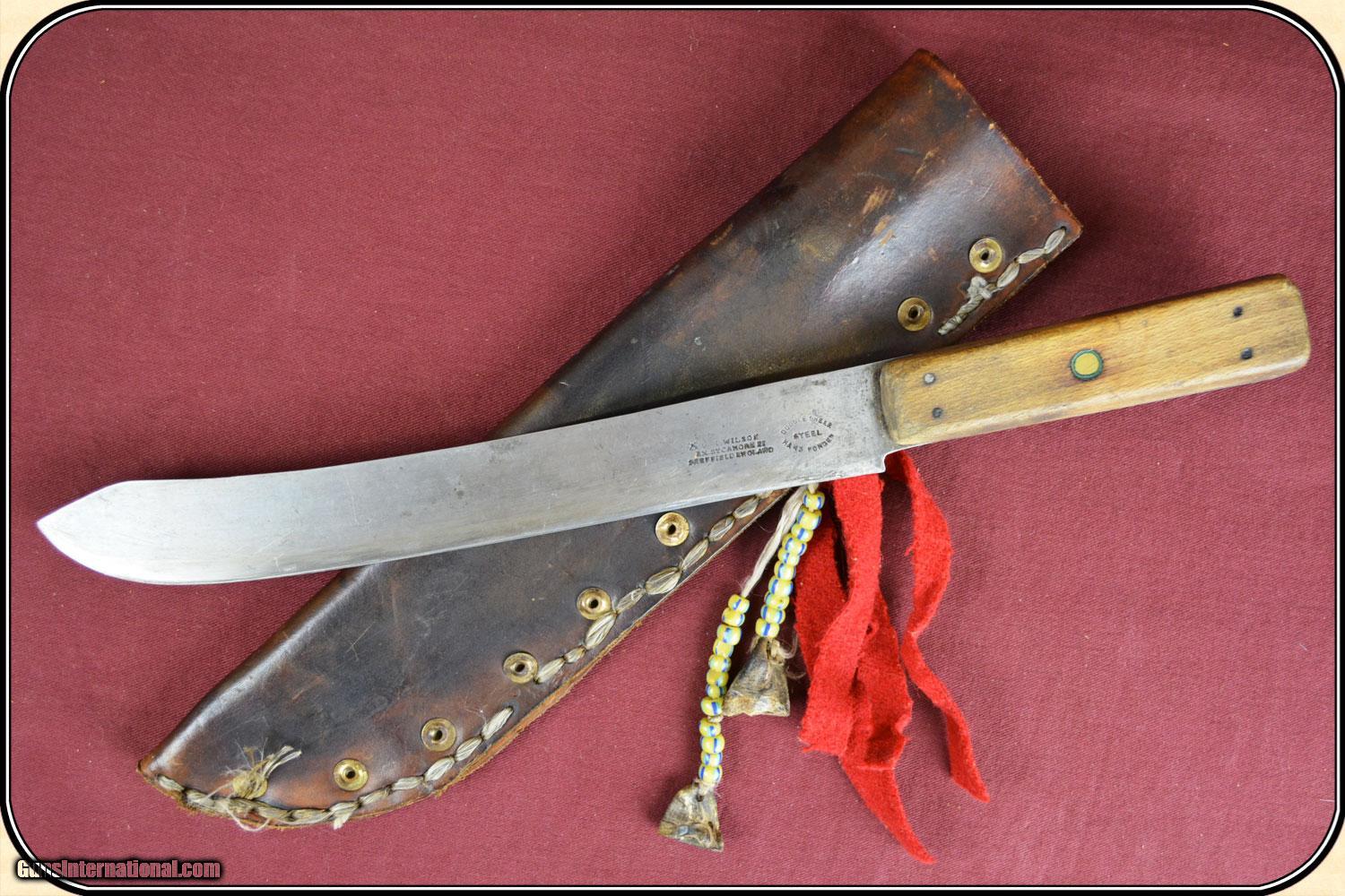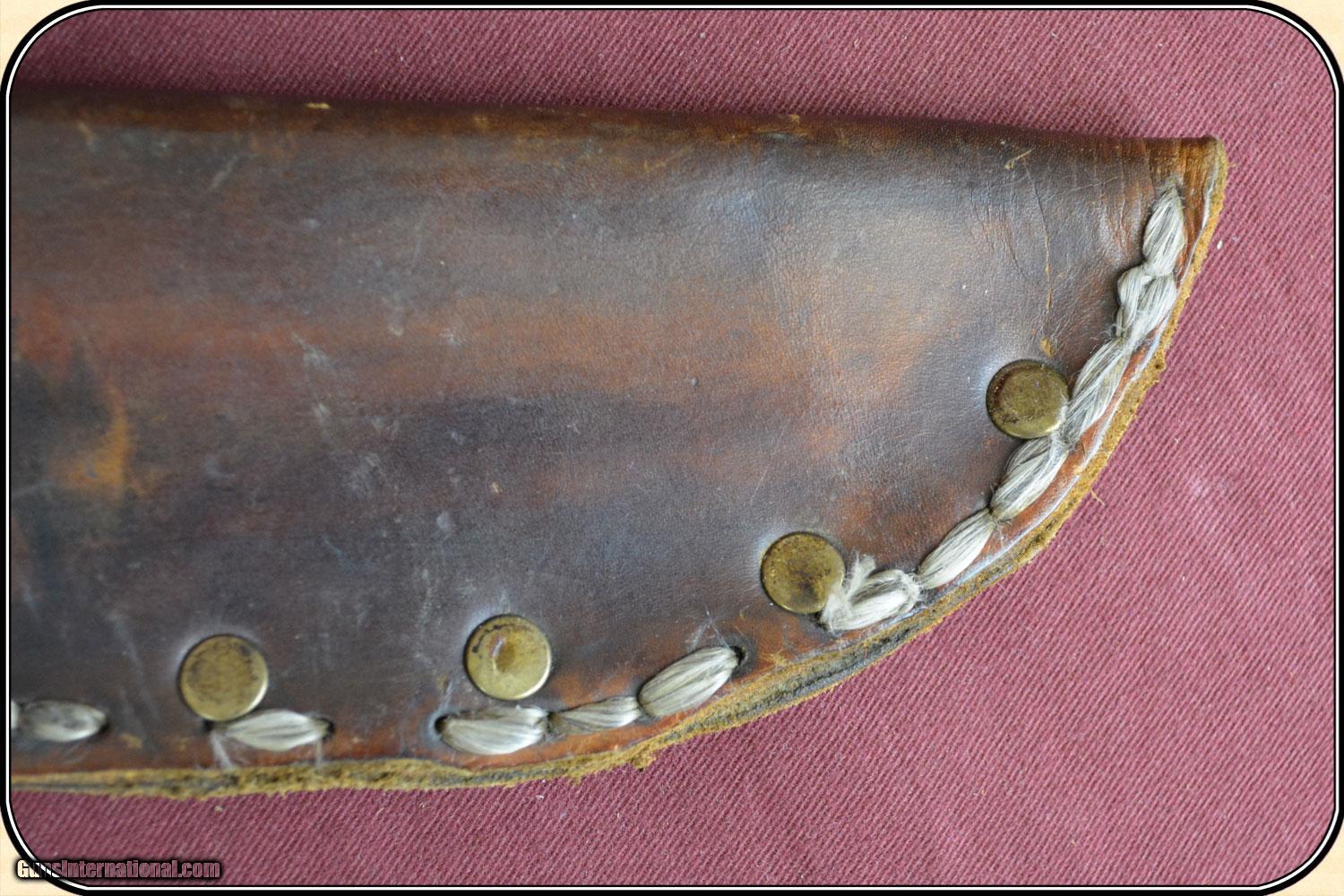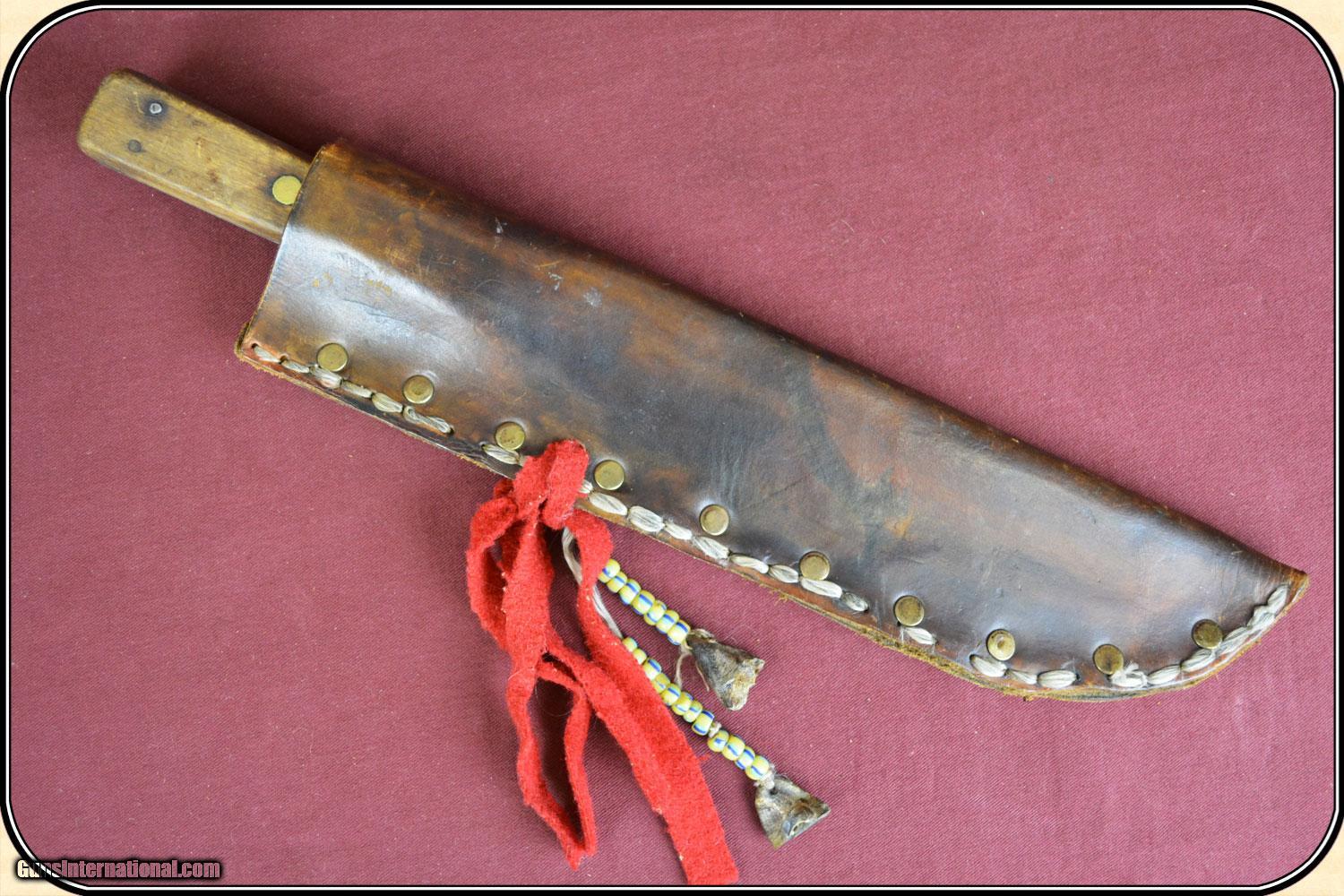 Description: I. Wilson knives migrated to the American frontier during the 1800s. Known for their “Sycamore Street” moniker, the shear-steel blades became a recognized presence among frontiersman, who needed rugged, utilitarian blades in their daily lives. “The vast majority of the knives sold through the fur-trade supply houses to the mountain men and Indians in the far west were imported from Sheffield, England. And of those knives, the brand that seems to have been most highly prized was ‘I Wilson.’ they were the cutting tools that actually tamed the western wilderness.“The demand for Wilson knives did not go away with the beaver trade, as many of the same frontiersmen moved on to hunting buffalo for their robes. Included is this leather sheath with old glass striped pony beads an dew claws. Payment Cash, postal money order, cashiers check, personal & business checks. Can be ordered with a credit card or paypal at wxx.riverjunction,cxx just type in the number 4520 in the search box. SOLD |