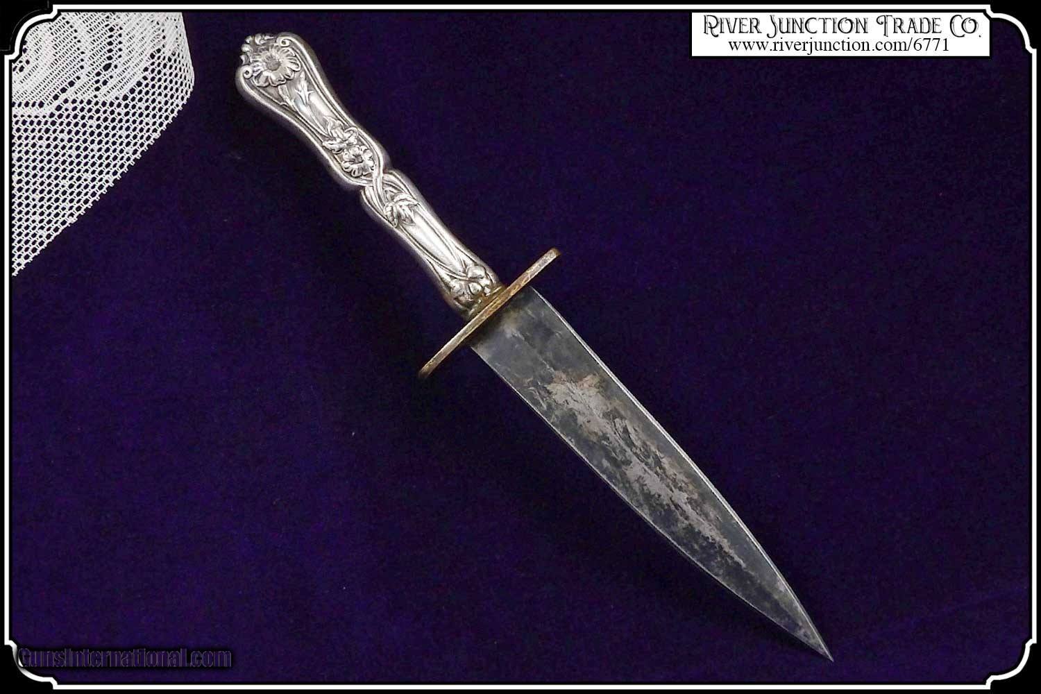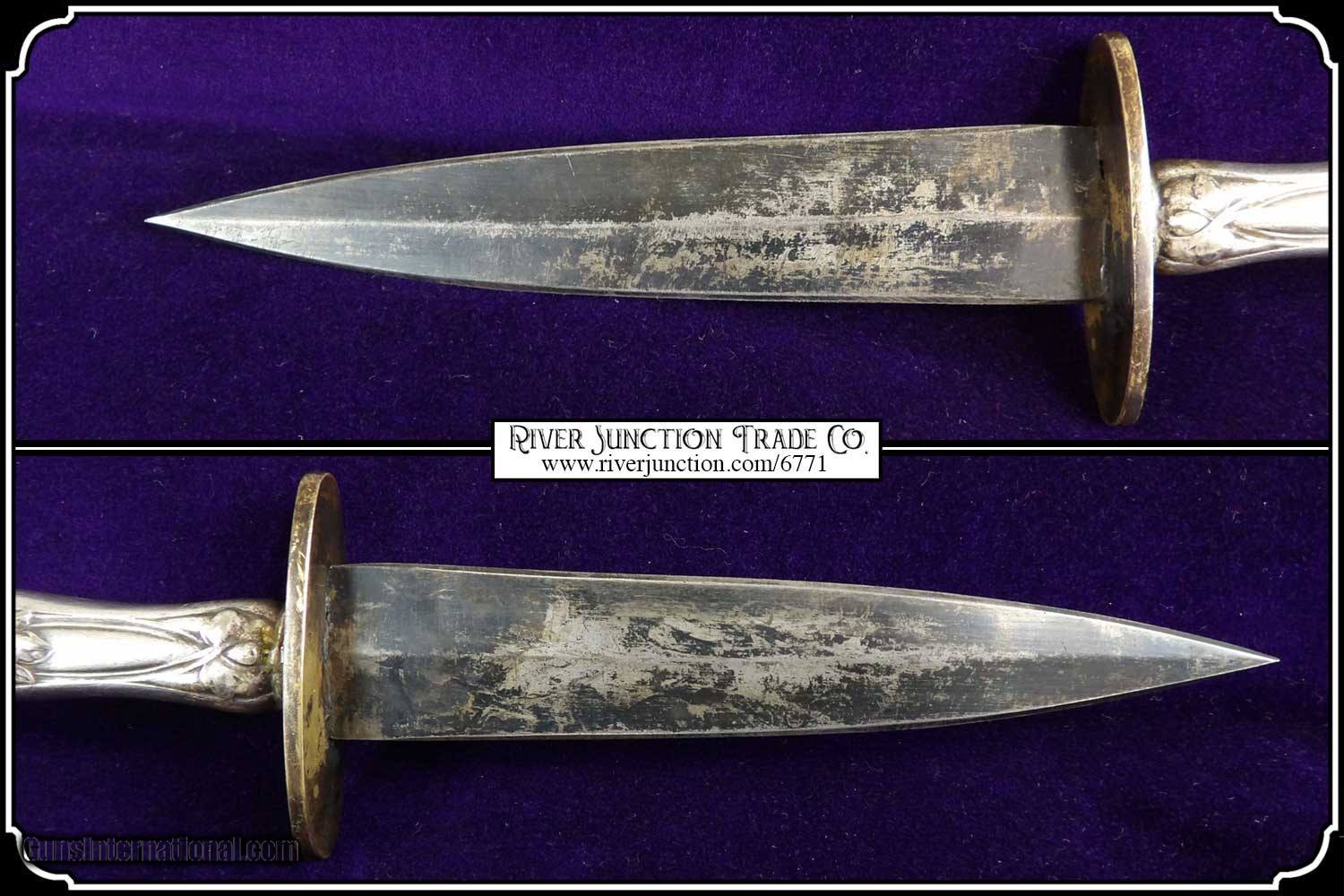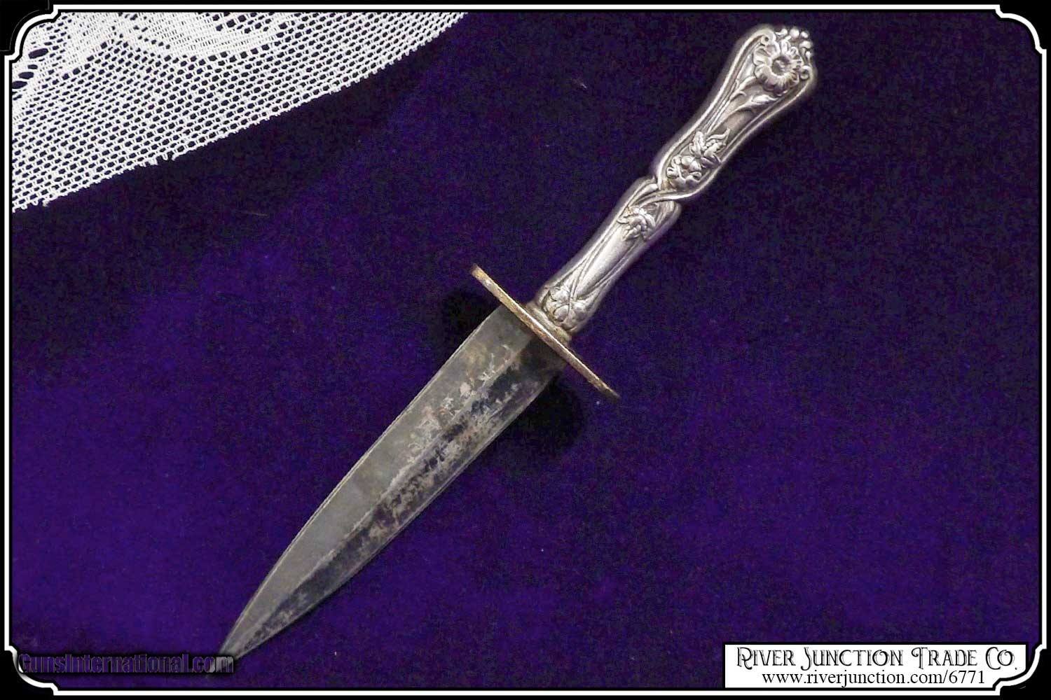 Description: Antique Unbranded “Prostitutes Dagger” , Whores Knife - Genuine Sterling Handled - No Breaks or Cracks - Brass Guard. Very Nice Overall Condition No Sheath - 7 3/8 inches overall - Approx. 4 1/4 inch “Blued” Blade with 50% original blue remaining. Rare and beautiful dagger circa 1860s to 1870s. This ornate blade was made in the mid to late 19th century in Sheffield. Owing to their smaller size and slim profile, this type of knife was easily concealed, and earned the nicknames, “Prostitute’s Dagger”. Ladies of the evening often wore them in a velvet sheath in their garters or other convenient places. The blade is in good condition with almost no corrosion. The point is sharper than a needle. This is a rare and interesting dagger it was often used like a push dagger (see pictures), not often encountered. Payment: Item, can be ordered on line with a credit card or paypal on our sight. Just Google (riverjunction) and type in the River Junction Trade Co. item number (6771) in the search box. Before you checkout you will see shipping cost and total. OR If you prefer: Pay by cash, postal money order, cashiers check, personal & business checks. We wait for checks to clear. We always answer questions and entertain offers. Have questions? Call me 563-880-4588. Jim SOLD |