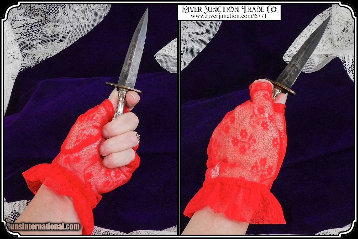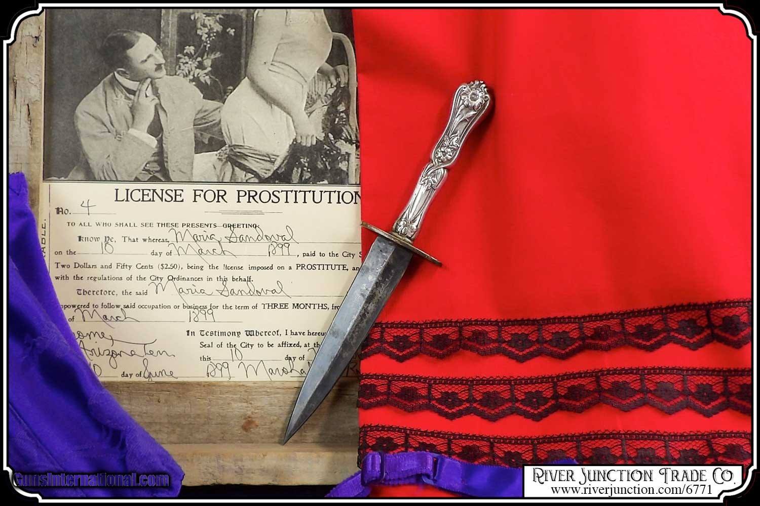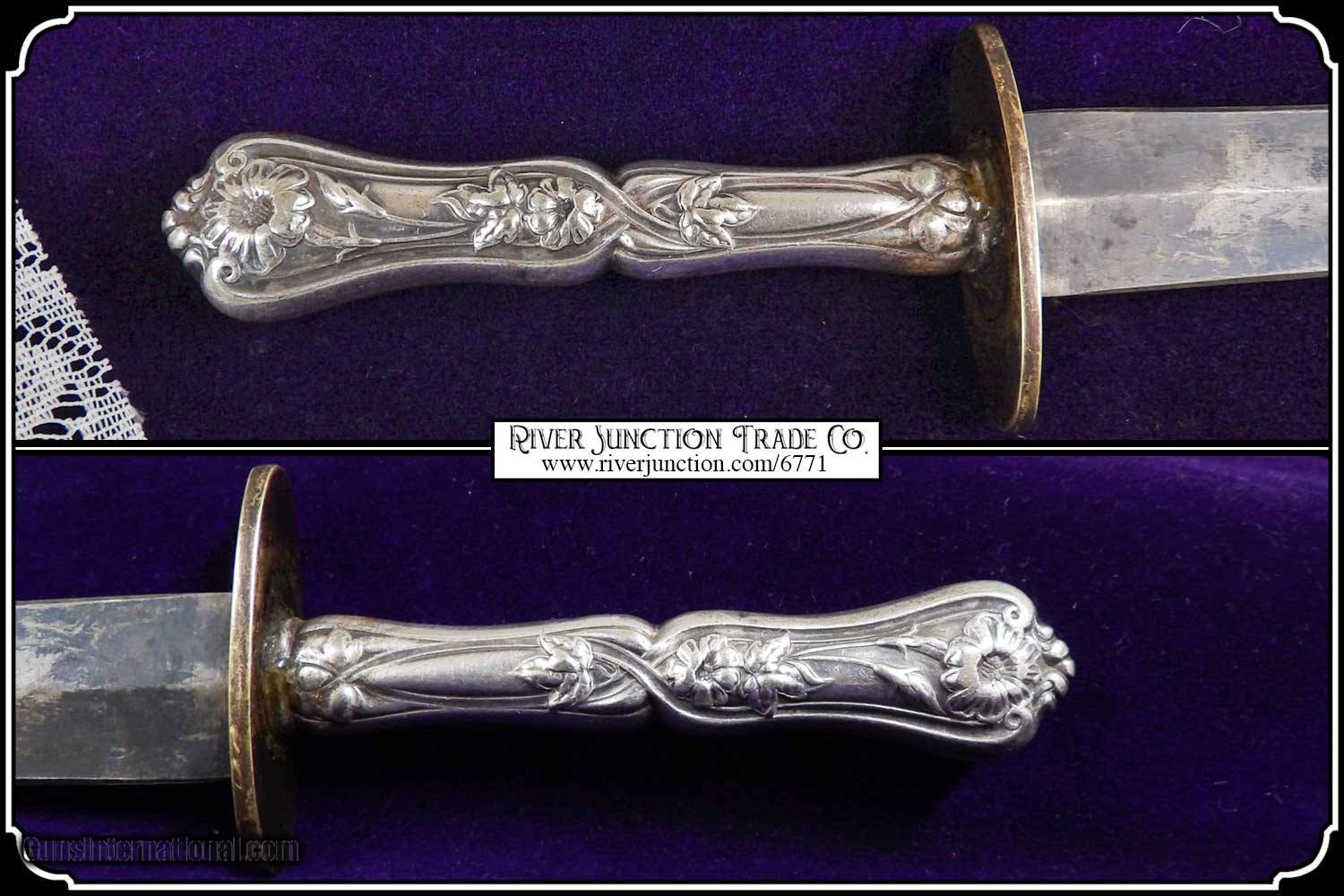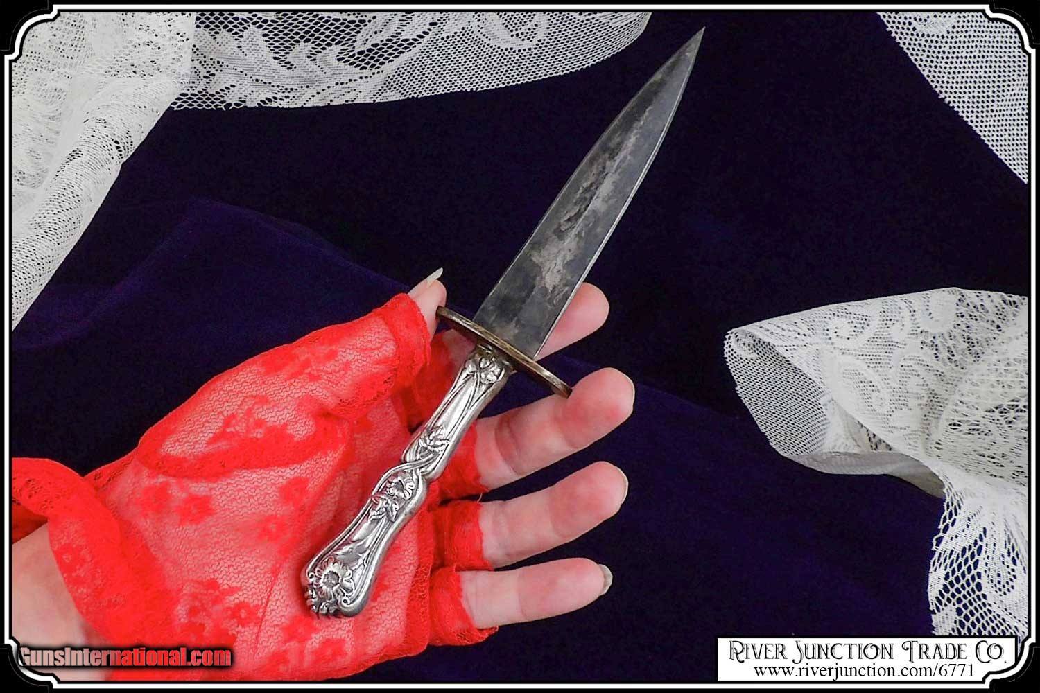 Description: Antique Unbranded “Prostitutes Dagger” , Whores Knife - Genuine Sterling Handled - No Breaks or Cracks - Brass Guard. Very Nice Overall Condition No Sheath - 7 3/8 inches overall - Approx. 4 1/4 inch “Blued” Blade with 50% original blue remaining. Rare and beautiful dagger circa 1860s to 1870s. This ornate blade was made in the mid to late 19th century in Sheffield. Owing to their smaller size and slim profile, this type of knife was easily concealed, and earned the nicknames, “Prostitute’s Dagger”. Ladies of the evening often wore them in a velvet sheath in their garters or other convenient places. The blade is in good condition with almost no corrosion. The point is sharper than a needle. This is a rare and interesting dagger it was often used like a push dagger (see pictures), not often encountered. Payment: Item, can be ordered on line with a credit card or paypal on our sight. Just Google (riverjunction) and type in the River Junction Trade Co. item number (6771) in the search box. Before you checkout you will see shipping cost and total. OR If you prefer: Pay by cash, postal money order, cashiers check, personal & business checks. We wait for checks to clear. We always answer questions and entertain offers. Have questions? Call me 563-880-4588. Jim SOLD |