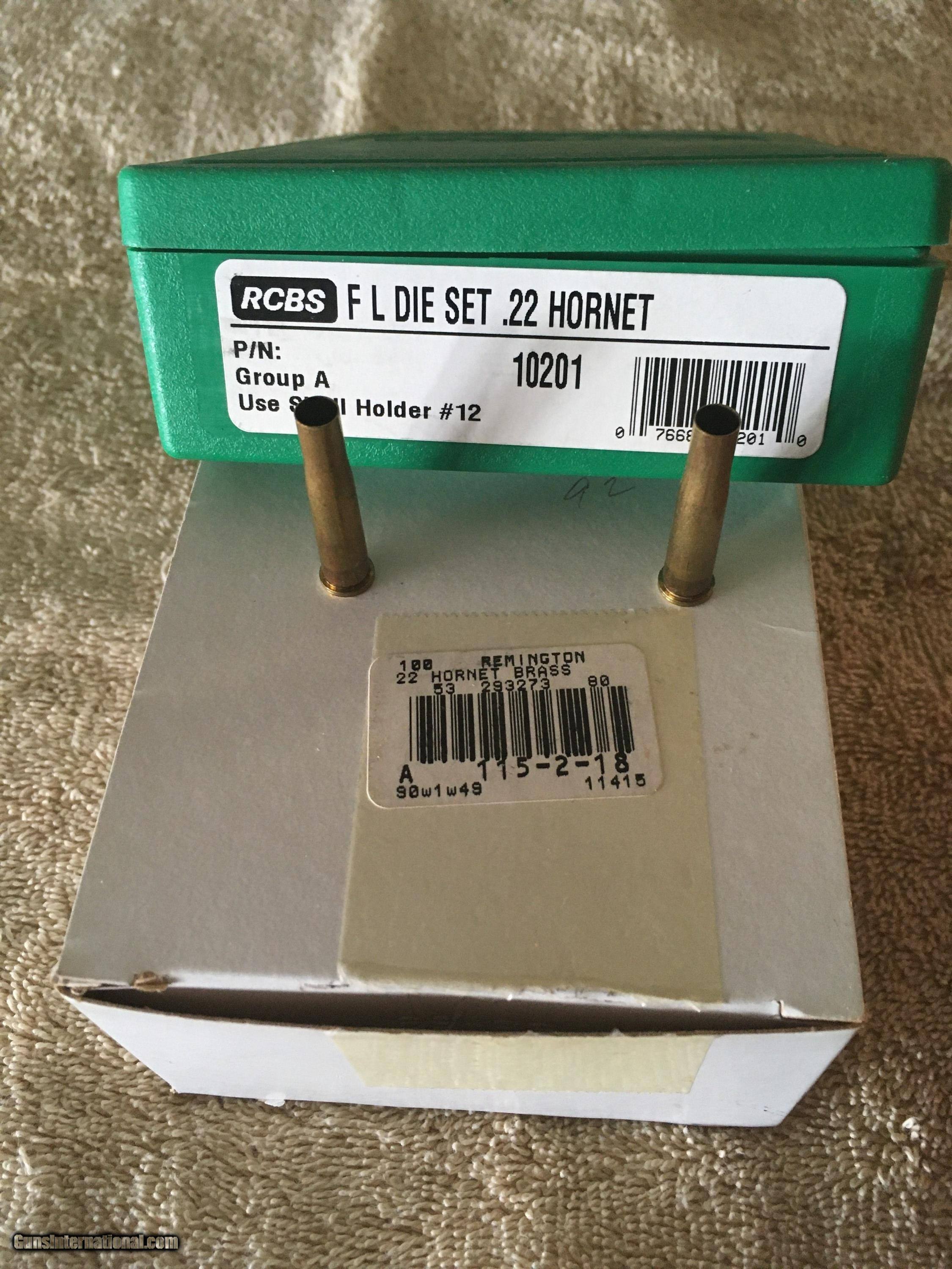 Description: New Remington .22 Hornet brass unprimed, 92 count, pair of RCBS .22 Hornet dies SOLD |