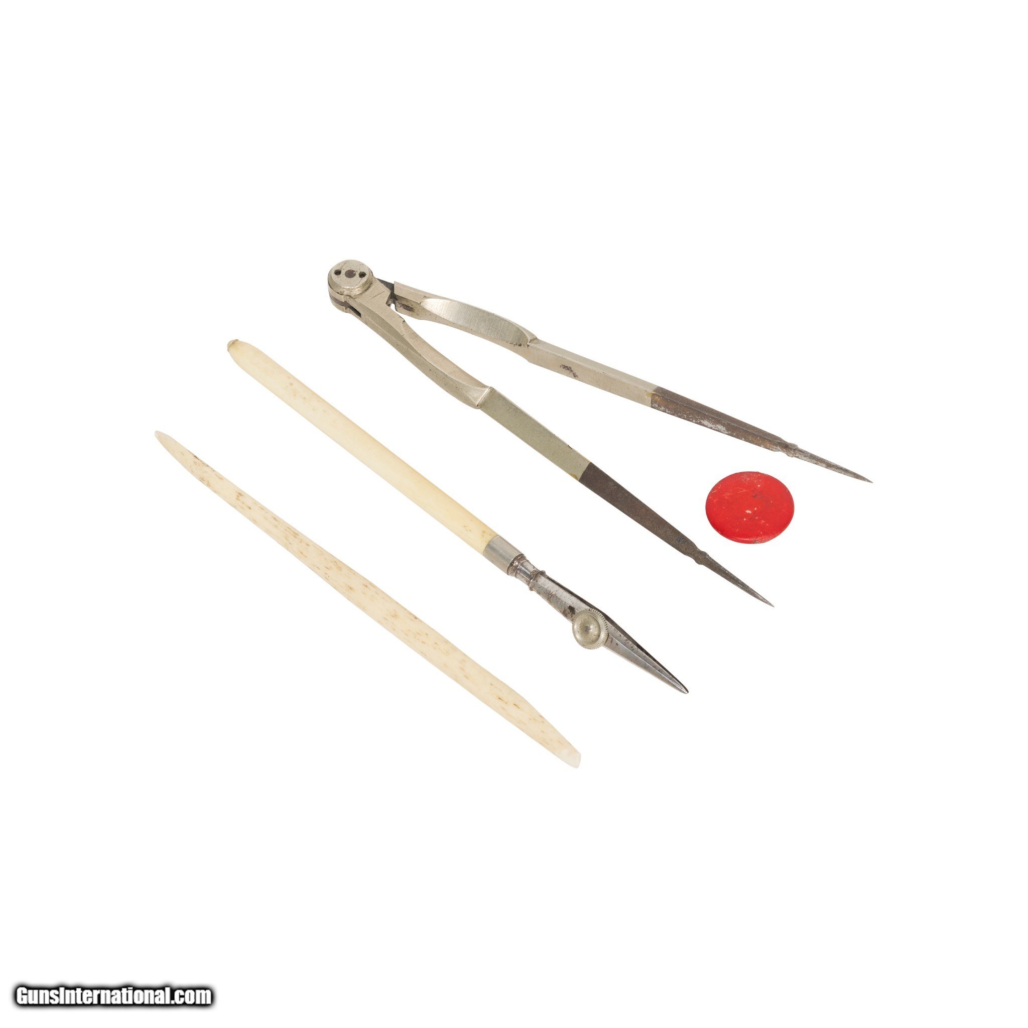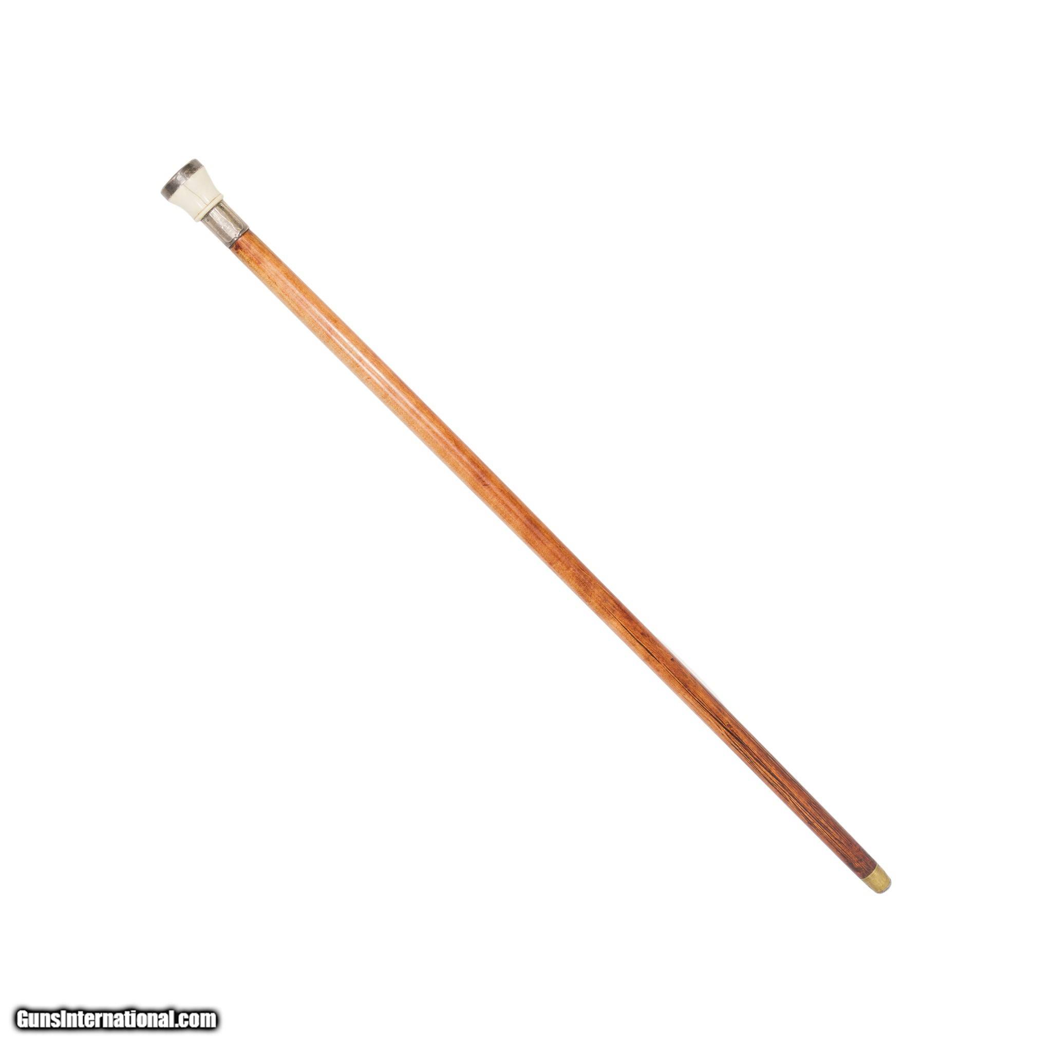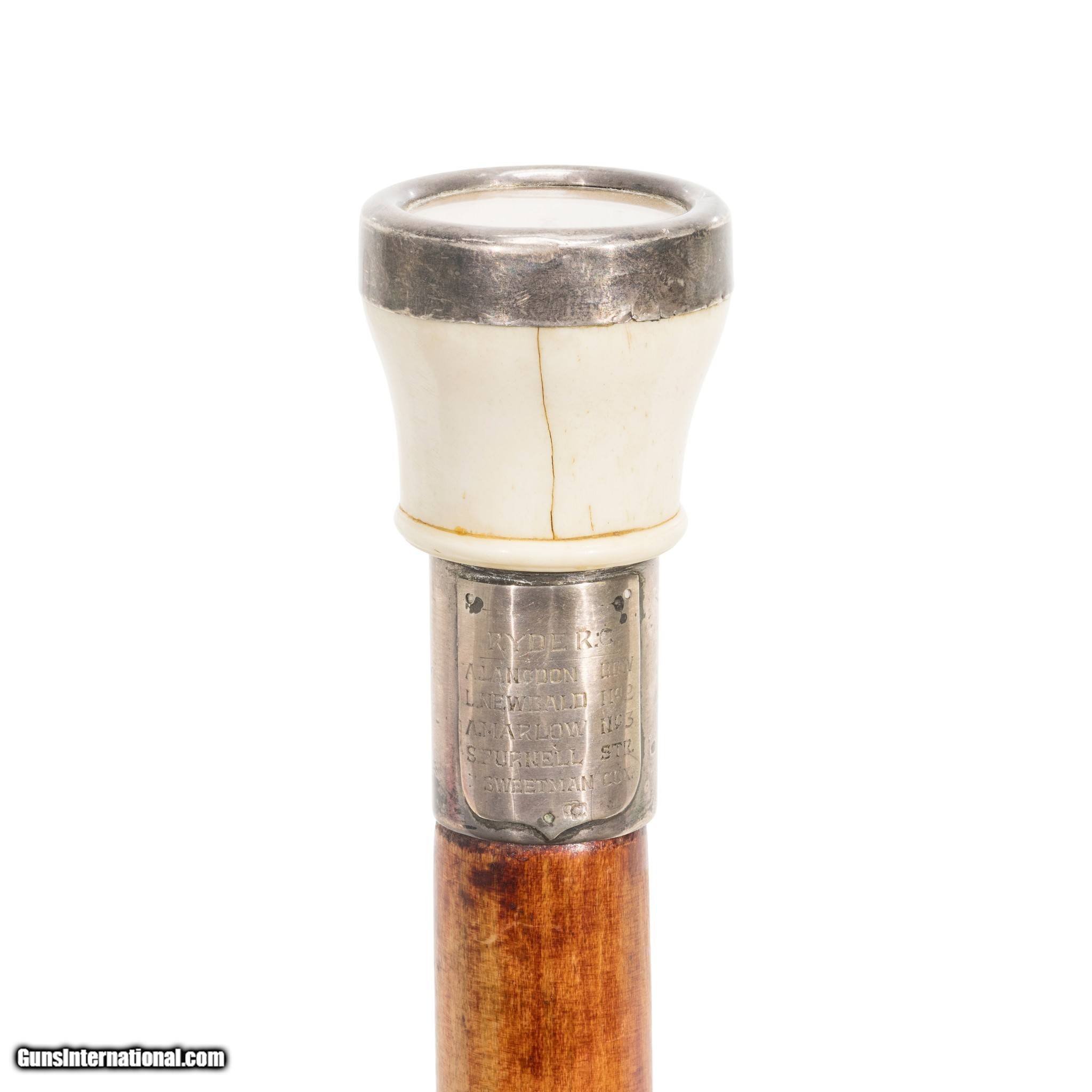 Description: 1898 Rolling Team presentation cane with compass. A gadget cane with functioning compass. Sterling silver collar with Birmingham hallmarks for 1898 encloses a functioning compass with paper dial, inner turned bone collar and hallmark sterling silver sleeve having applied shield engraved with the names of the Bow, No. 2, No. 3, STER & COX on hard maple shaft with aniline stained and brass ferrule. Container in a canister inside drafting/map making tools. Canister inside with drafting/map making tools. Plaque on front reads "Ryder C. A. Langdon 130W L. Newbald No. 2, A. Marlow No. 3, Spurnell STR., T. Sweetman Cox. 36 SOLD |