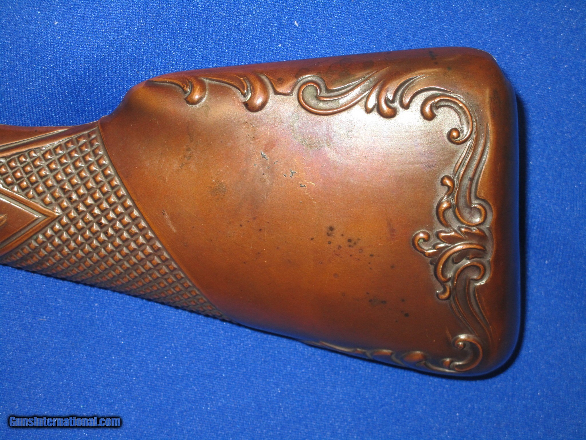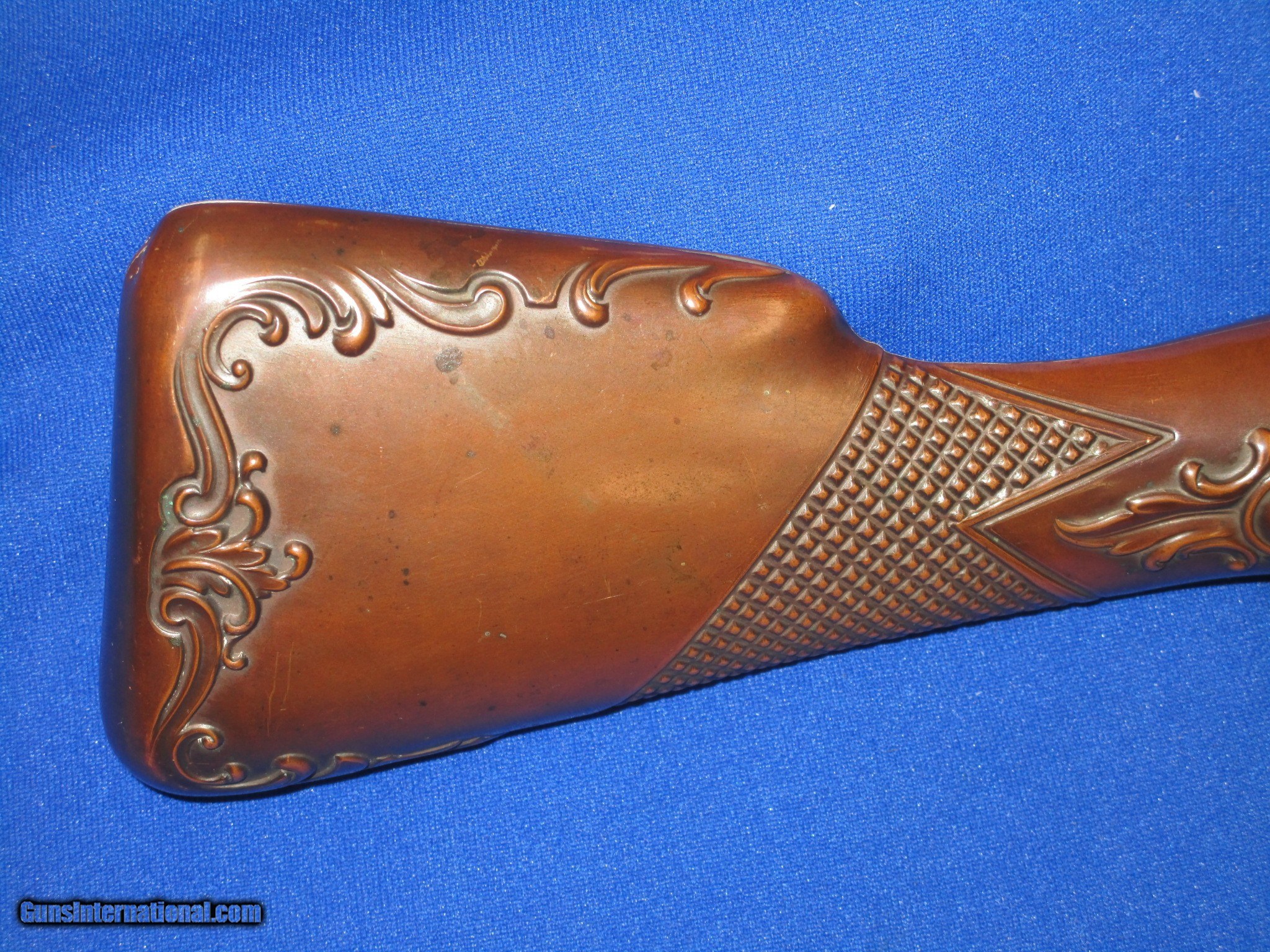 Description: A SCARCE CIVIL WAR LARGE 9 INCH GUN STOCK POWDER FLASK MADE BY "DIXON & SONS" IN VERY FINE UNTOUCHED CONDITION. ALL ORIGINAL AND COMPLETE. THE FLASK HAS AN EXCELLENT BODY THROUGHOUT WITH TIGHT SEAMS. THE BODY HAS VERY ORNATE DESIGNS ON IT. IT IS MARKED ON THE SPOUT "JAMES DIXON & SONS". THE BODY IS MARKED ON ONE SIDE TOWARDS THE TOP "J,C,7,3" IN A DIAMOND DESIGN AND "NO. 94923" IN A CIRCLE PATTERN ON THE OTHER. THE SPOUT IS MARKED "DIXON & SONS" THE BODY RETAINS MOST OF ITS ORIGINAL FACTORY LACQUER ON IT. THE TOP RING AND SPOUT RETAIN LOTS OF THEIR ORIGINAL GILT. THE FLASK OPERATES PERFECTLY. IT MEASURES 9 INCHES IN LENGTH. IT IS 3 INCHES WIDE AT THE REAR AND 1/ 1/2 INCHES AT THE TOP RING. THIS IS A VERY SCARCE & HARD TO FIND CIVIL WAR LARGE GUN STOCK POWDER FLASK IN WONDERFUL CONDITION! SOLD |