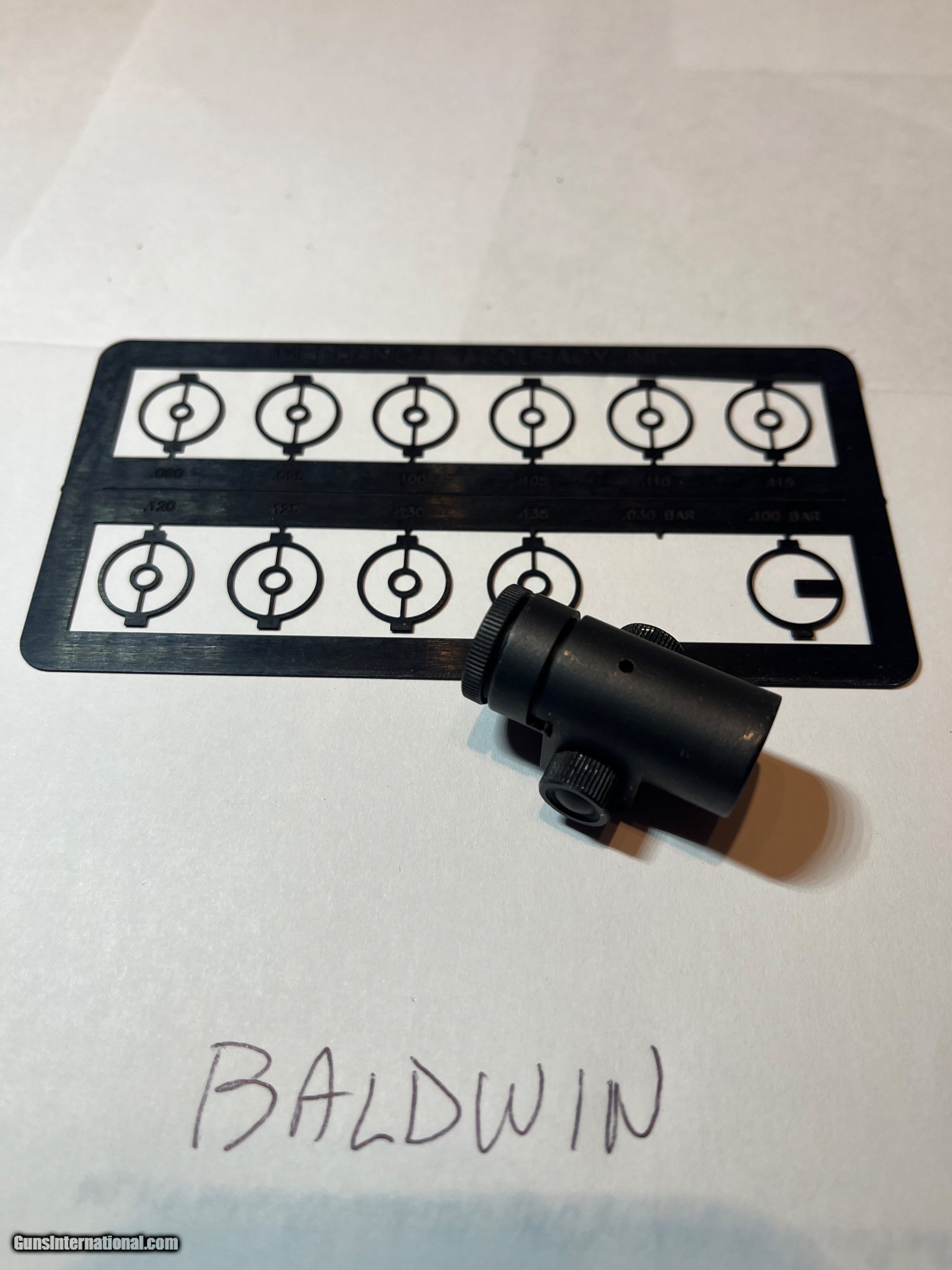 Description: Baldwin front sight with spirit level and apertures. 7/16 dovetail. In perfect condition. $65 includes shipping except Alaska and Hawaii. SOLD |