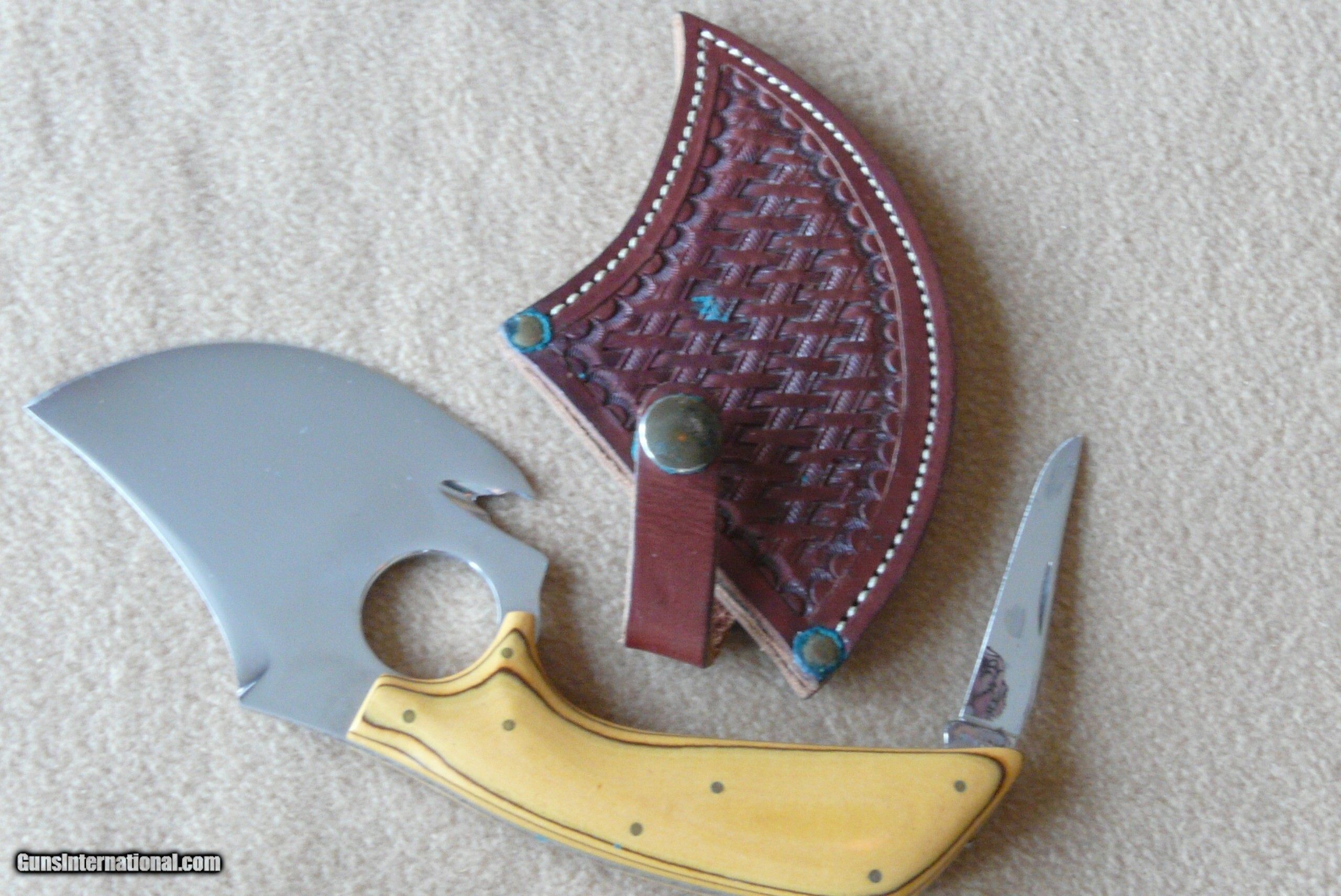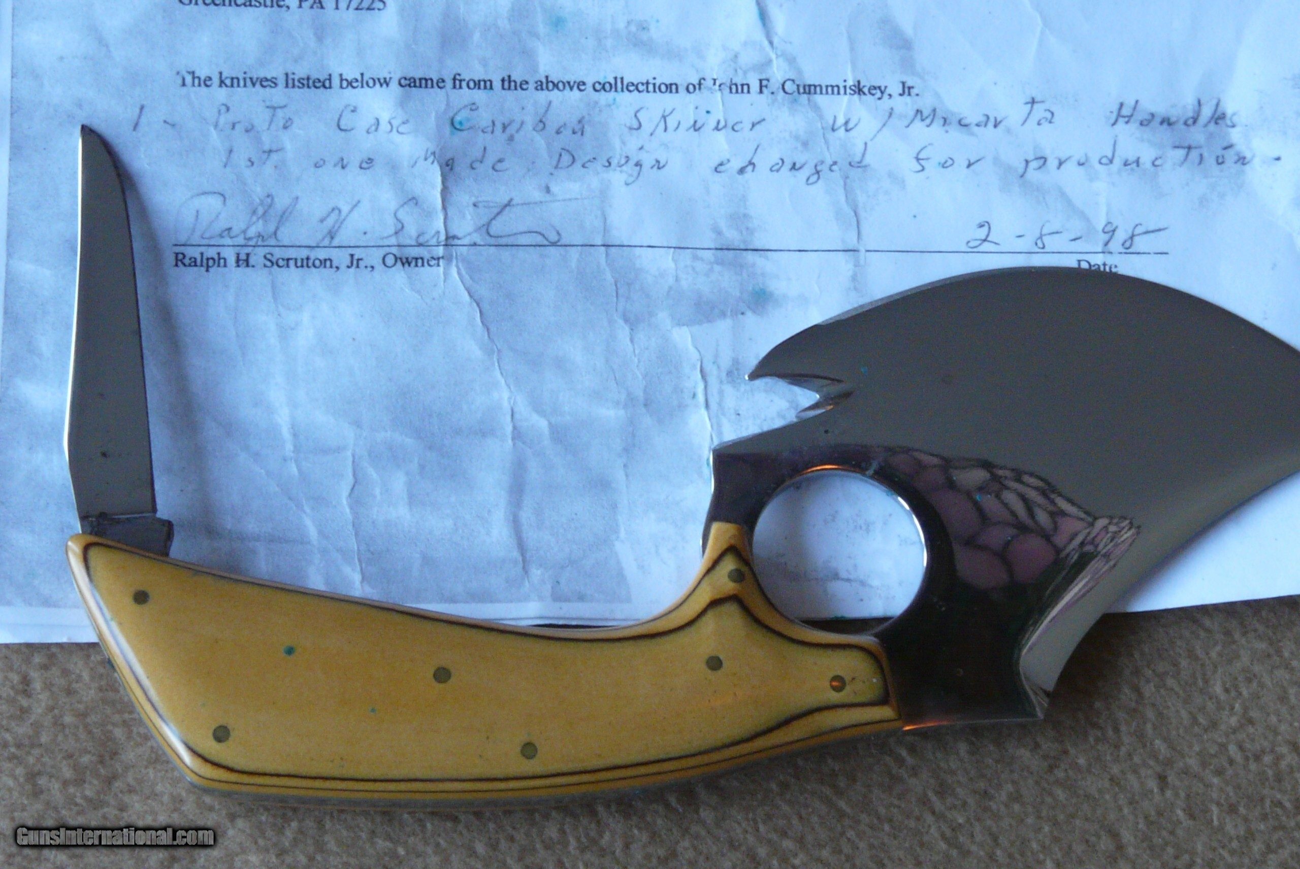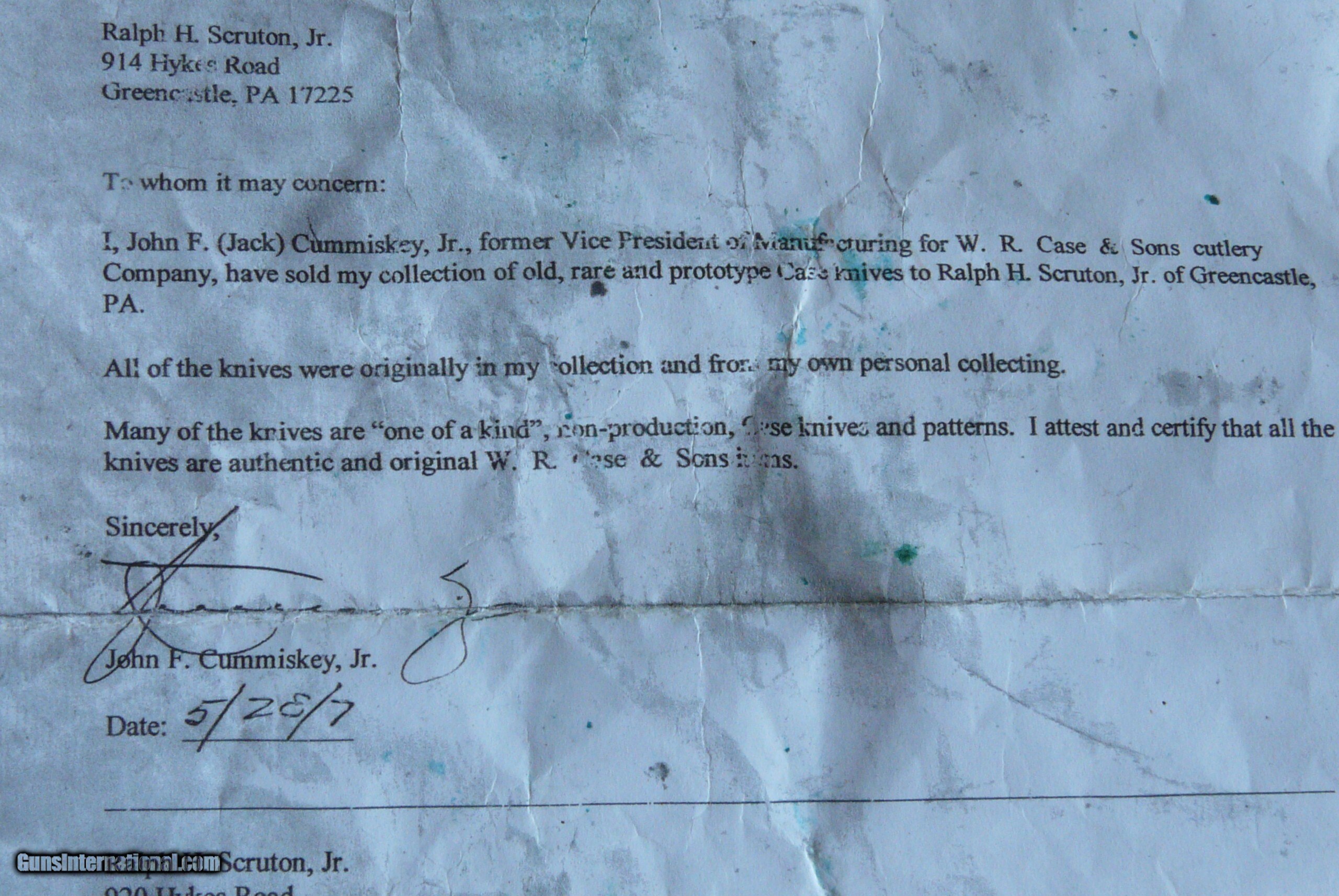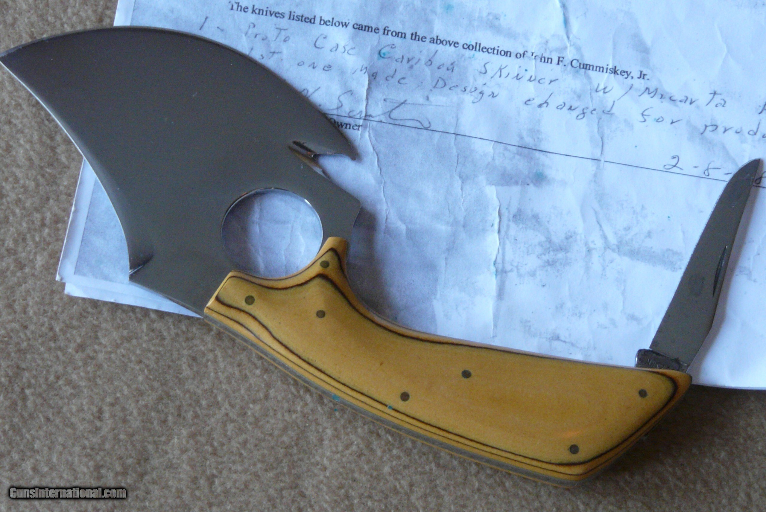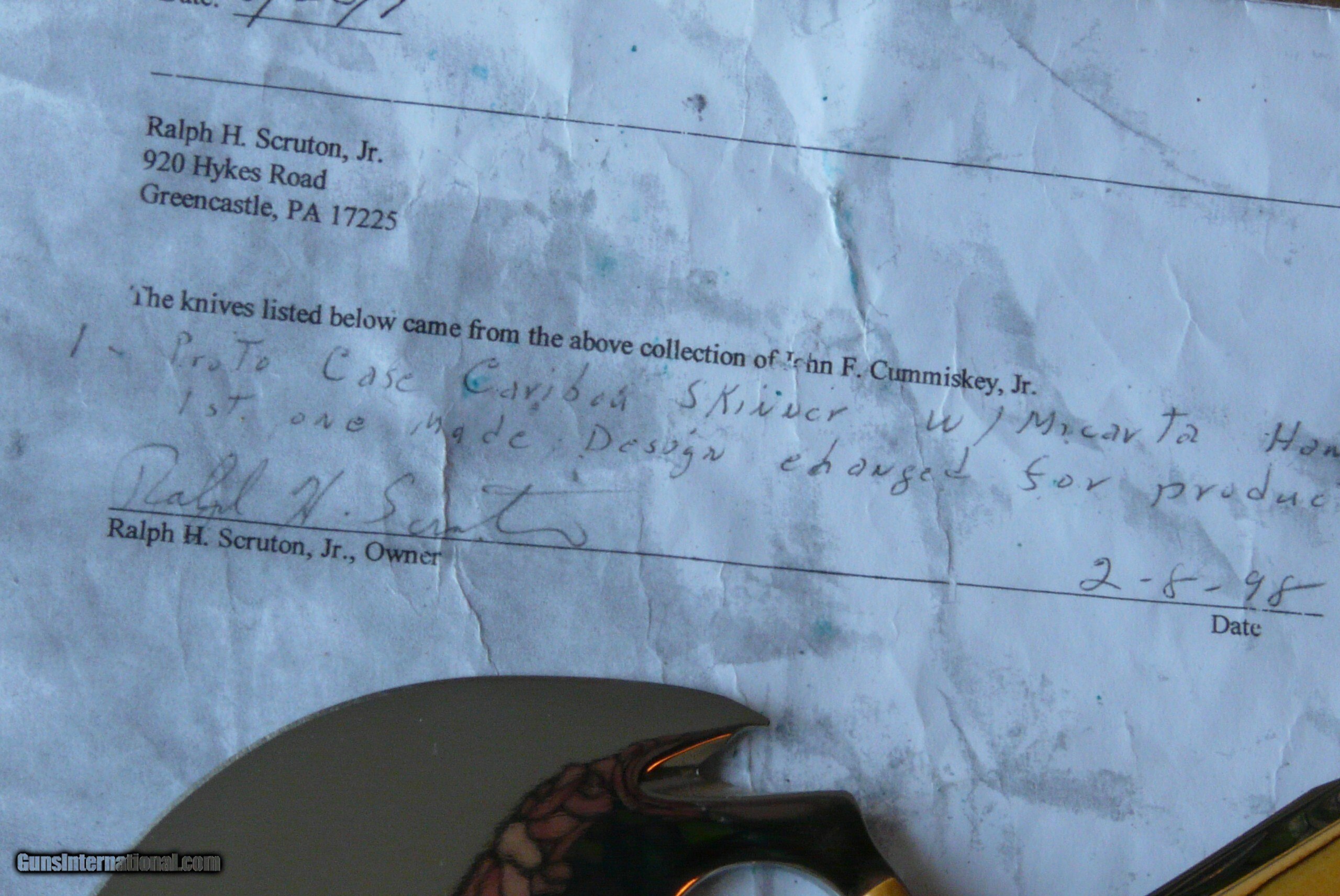 Description: This was sold to me by Ralph Scruton JR, Ralph had bought from Jack Cummiskey Jr, his collection of Case knives , Jack was Vice President of Manufacturing for W.R.Case & Sons, This Caribou Skinner was a Prototype made with a Blade attached, from a Case Muskrat knife, it was the first one made, as an experiment, and kept by Jack Cummiskey as a memoir . It is basically Mint orig condition, never used by me, to take care of any of my various Caribou trophys ! I was always afraid I woulkd lose it in my weeks of Hunting in Canada & Newfoundland !! Letter states that This "Caribou Skinner" was the first one made, this one with Macarta Handles and Muskrat Blade! this was the first, and design was changed for production ? Letter is dated May 19th 97 ! This is the "First one made" by Case ! This Mint condition Case is all by itself as a collector item for case collectors, it is time for other people to enjoy it ! (FREE SHIPPING) There is a shadow in some pics of my Typhany lamp above my table where I take pics, shiny blades act like mirrors, ignore those images please, as you can see Blades are mint condition ! Price: $950.00 Contact Seller |