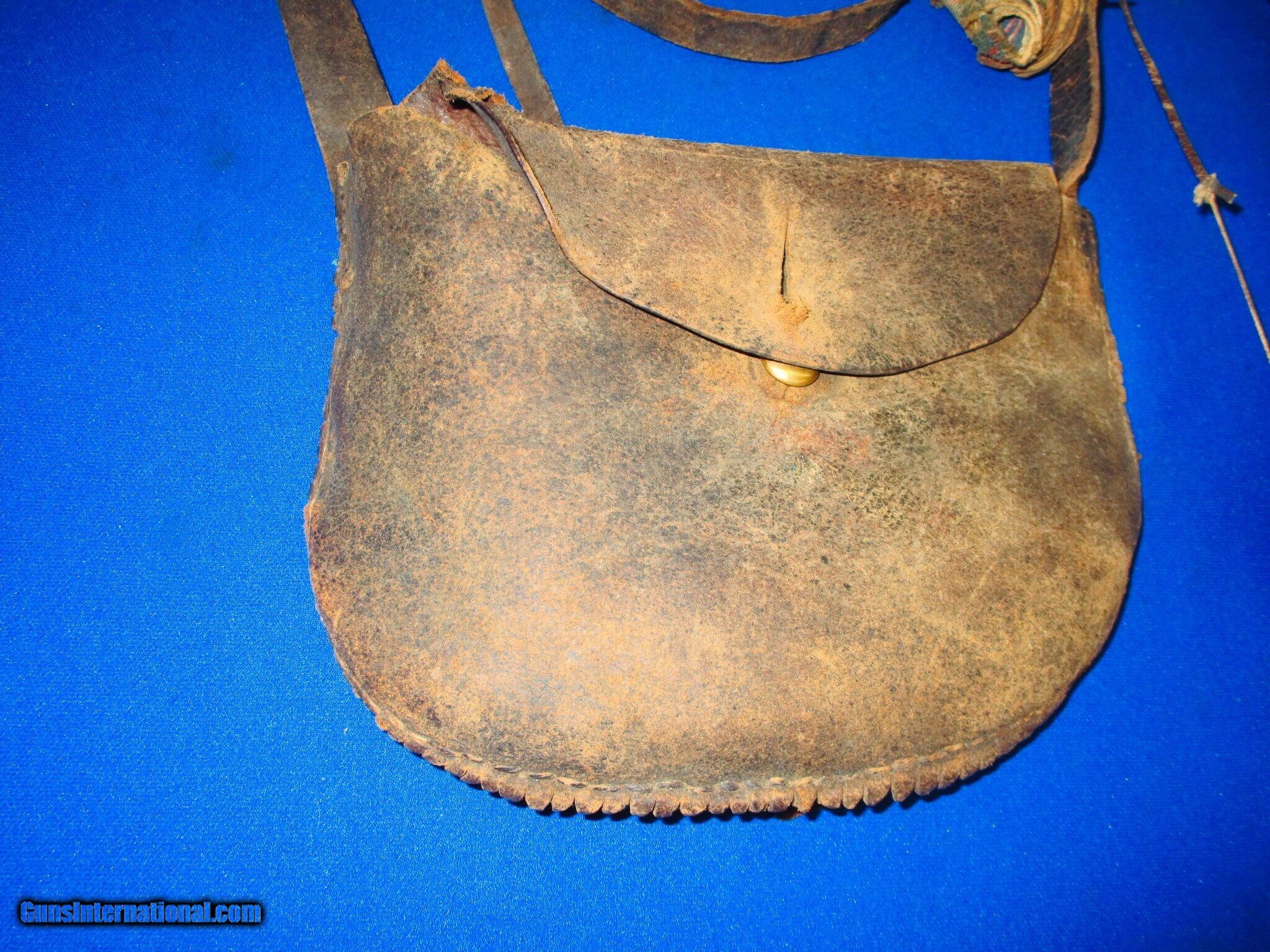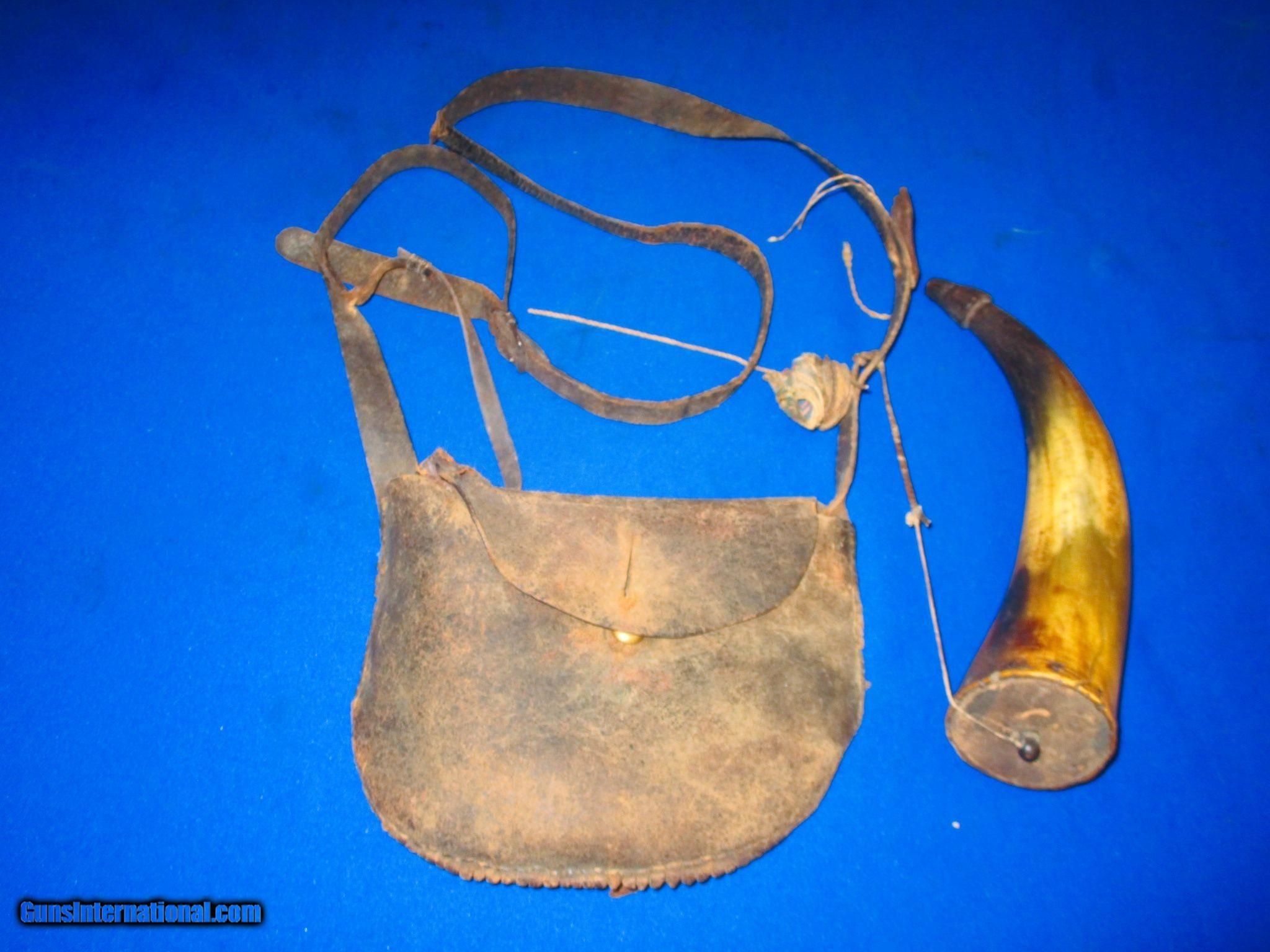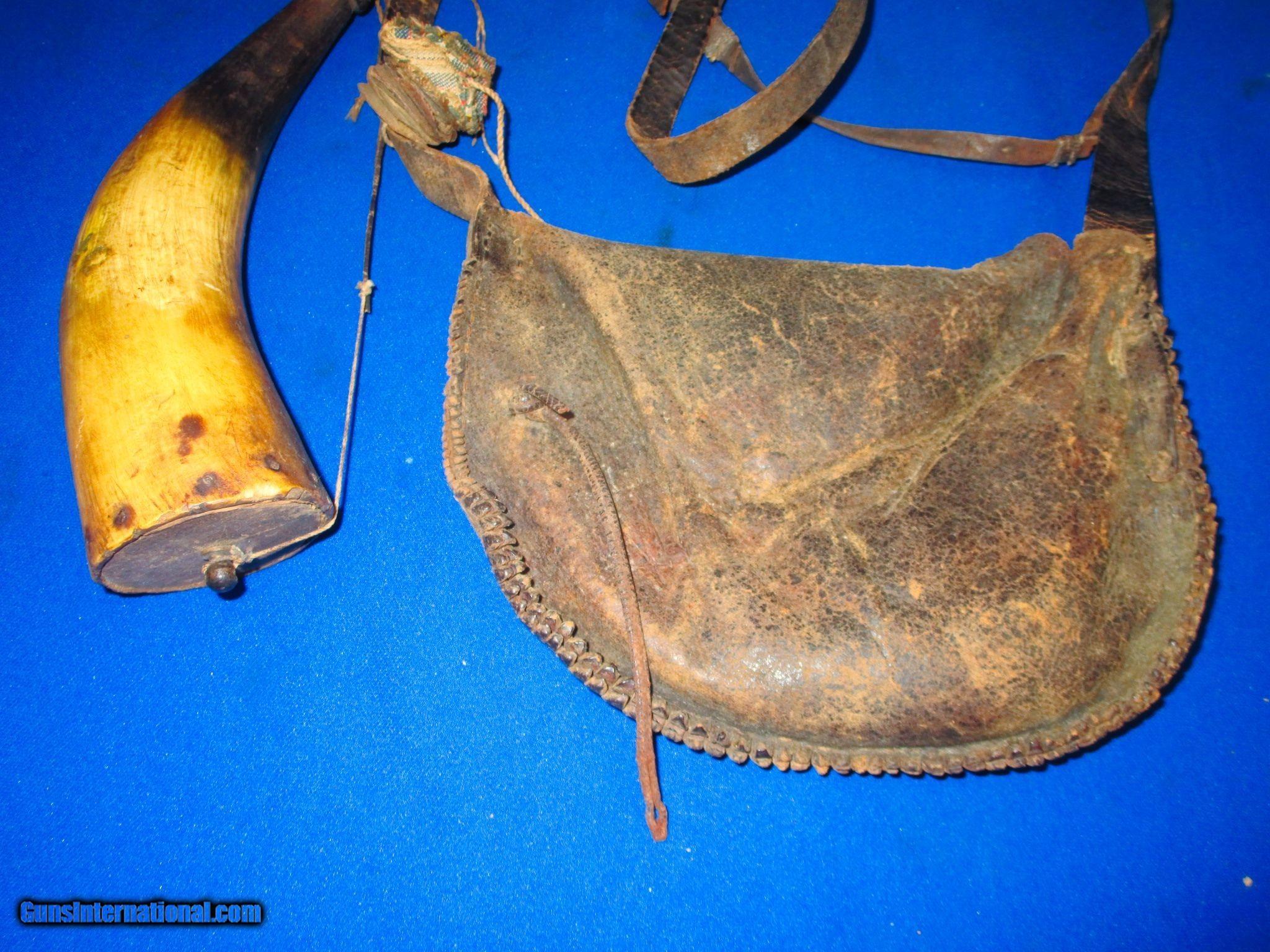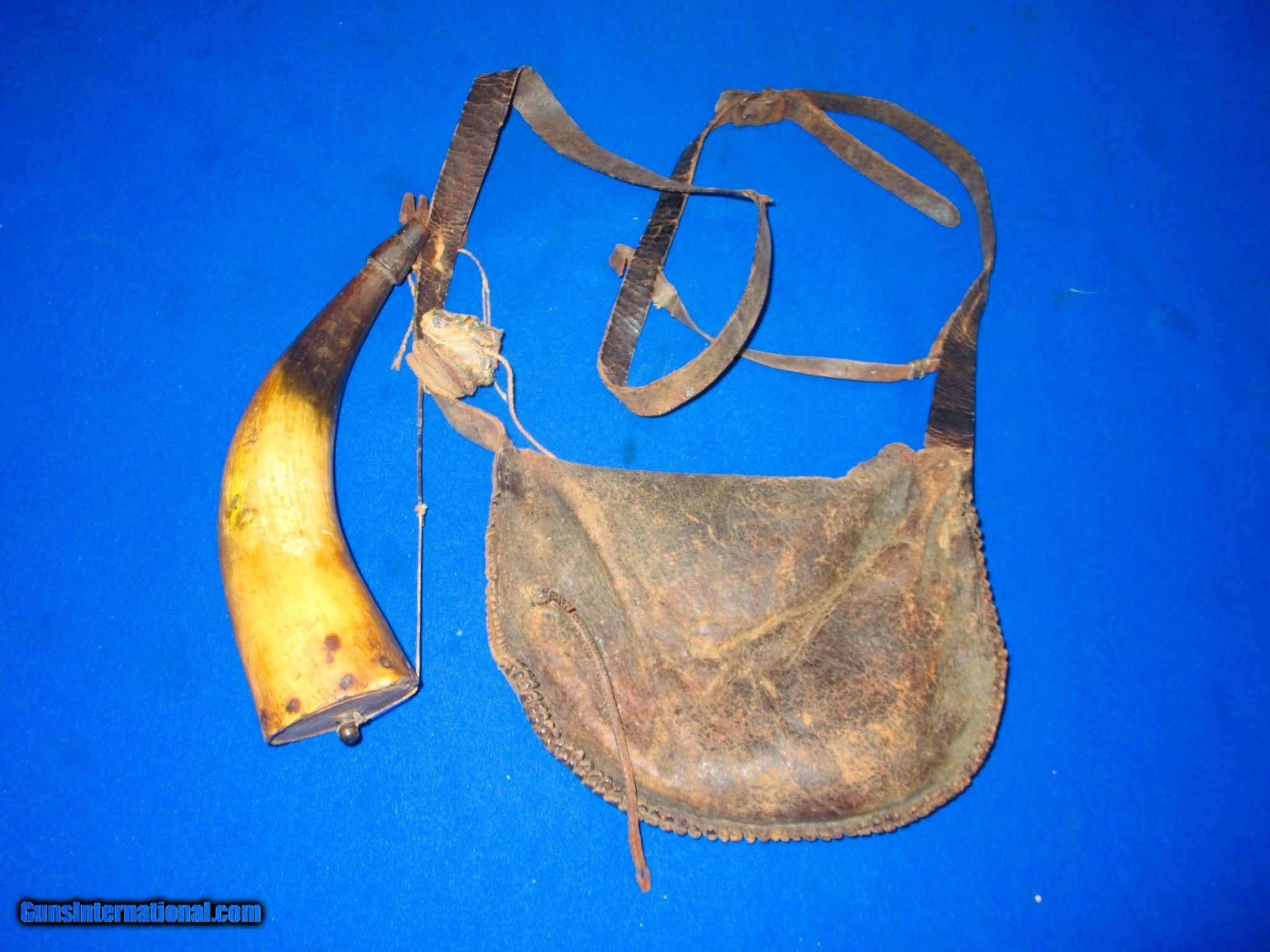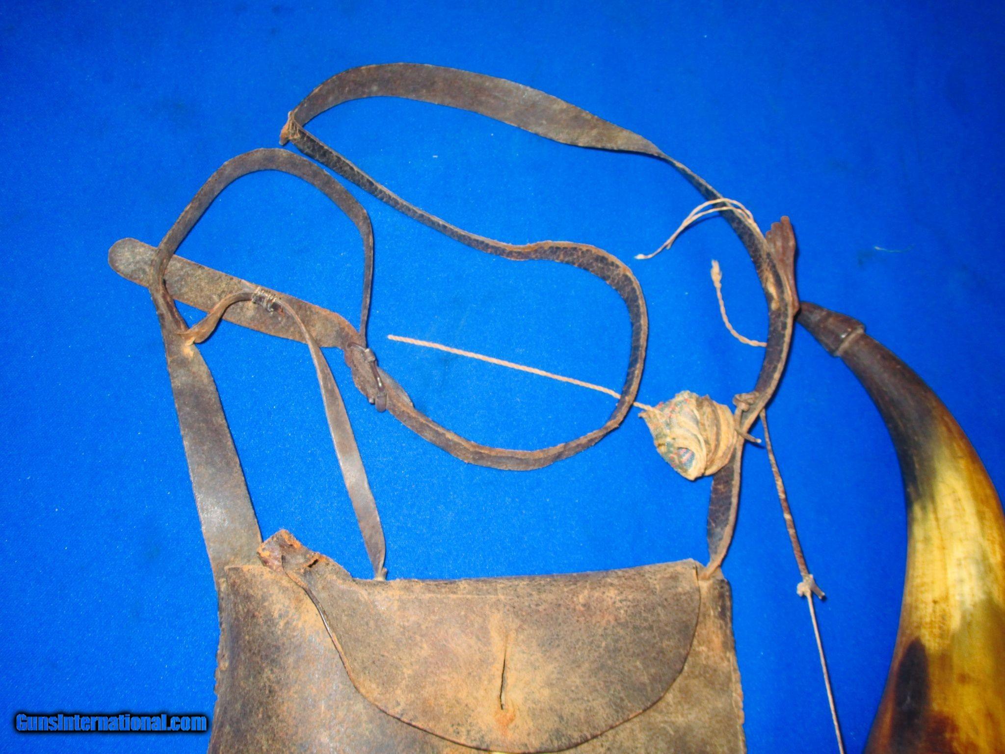 Early 1800's Original Frontier Powder Horn With Its Original Leather Shoulder Bag & Straps