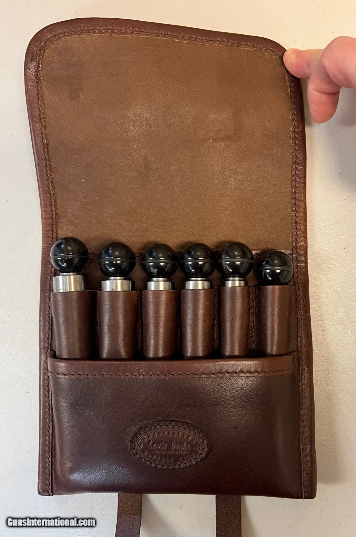 Description: Super cool gun room accessory made by Lewis Drake and offered by his renowned firm for a short period of time. This is a chamber gauge set for each gauge from 10ga thru 410ga and is designed for the most accurate measurements in each gauge. Gauges are deluxe with buffalo horn handles and fit snuggly in a full leather pouch which can be seen in the photos. Lewis was selling these for $395 new. No longer available. I'll take $150 for this set. Really a cool gun item and these are super high quality. Please don't hesitate to PM me with any questions or reasonable offers or call me at (704) 280-2382. SOLD |