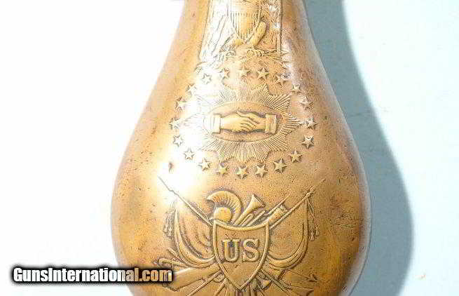FINE BATTY U.S. 1848 CLASPED HANDS PEACE POWDER FLASK. RILING #861.