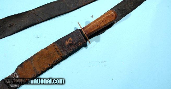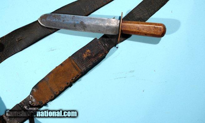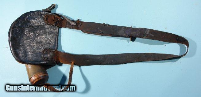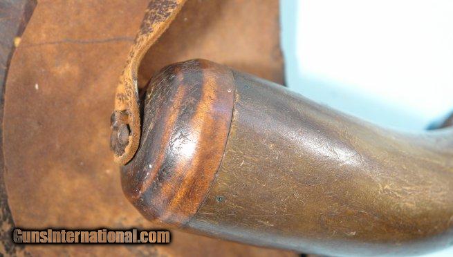 Description: FINE PENNSYLVANIA LONGRIFLE HUNTING BAG, HORN AND HUNTING KNIFE CIRCA EARLY 1800’S. 8”x6” bag composed of a cowhide back and deer skin front and flap. Original cowhide shoulder strap with scabbard and double edged hunting knife with brass guard and maple coffin hilt handle. Eastern Pennsylvania screw tip 12” horn with 3 piece nicely turned tip. Excellent condition for it’s age. Horn with nice patina. Extra nice bag with Pennsylvania gun maker family provenance. SOLD |