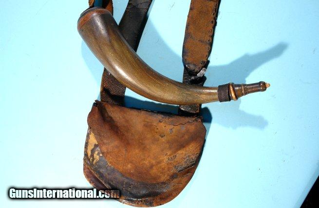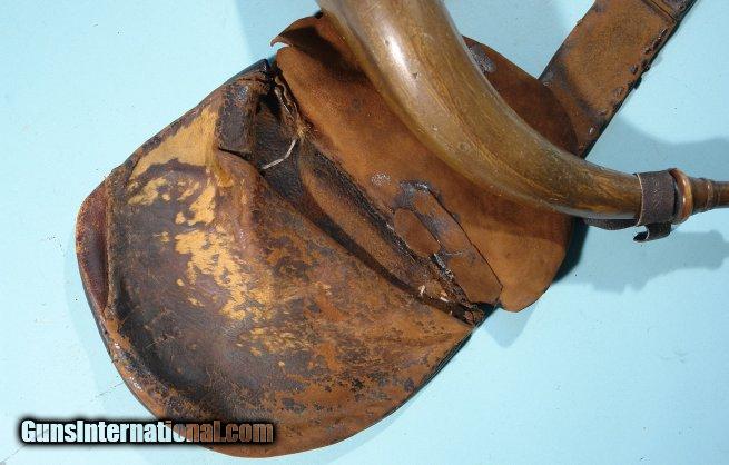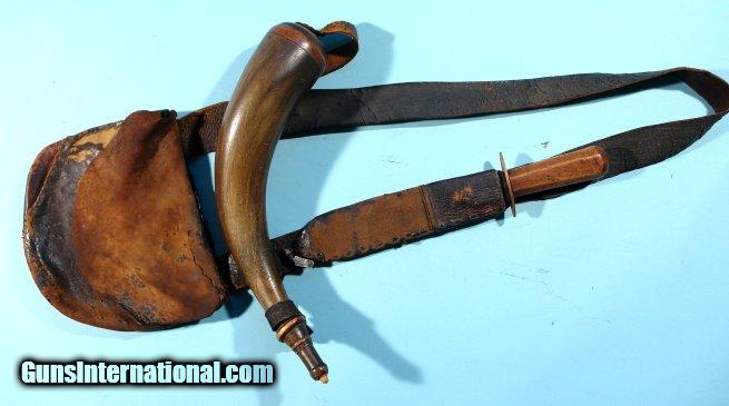 FINE PENNSYLVANIA LONGRIFLE HUNTING BAG, HORN AND HUNTING KNIFE CIRCA EARLY 1800’S.