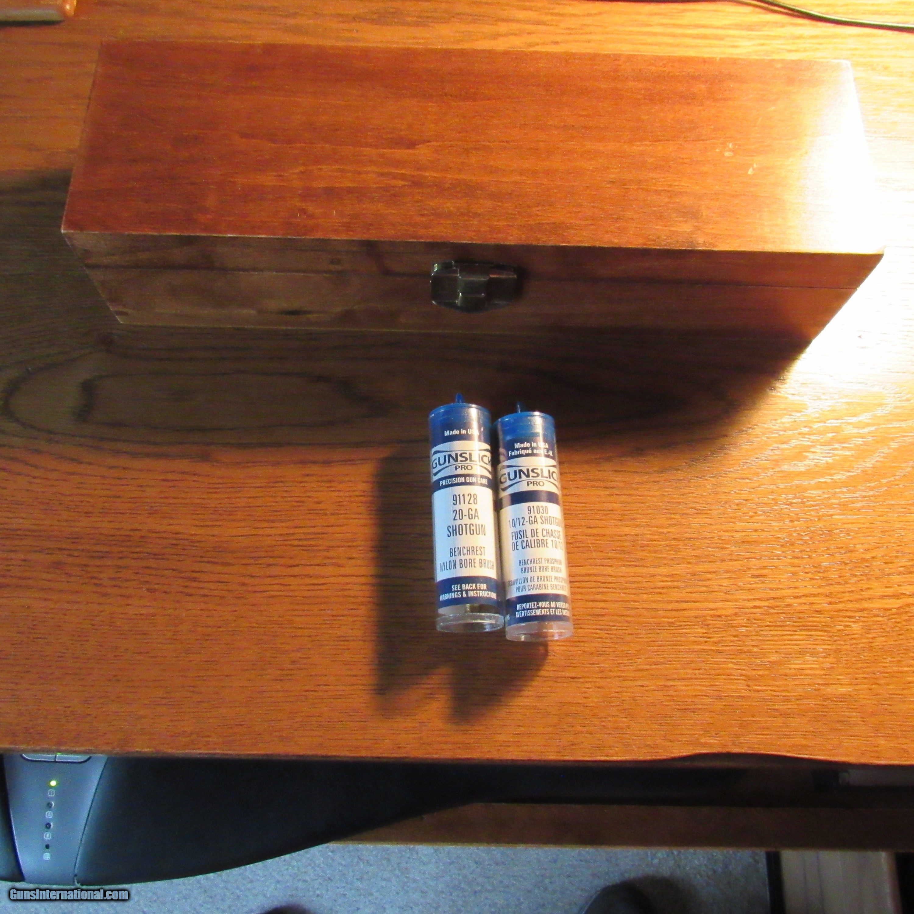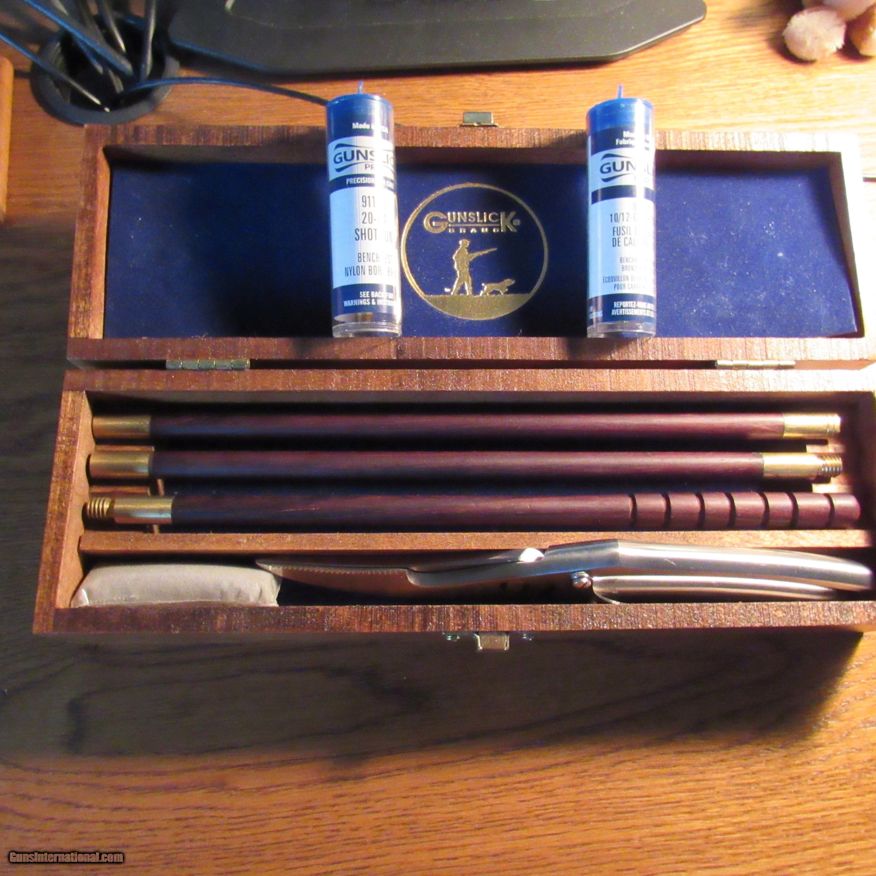 Description: Very nice wooden boxed shotgun cleaning kit with wooden cleaning rod with brass fittings, one 12 gauge brush, one 20 gauge brush, a cleaning cloth and an Orvis stainless steel bird shear (never used) SOLD |
