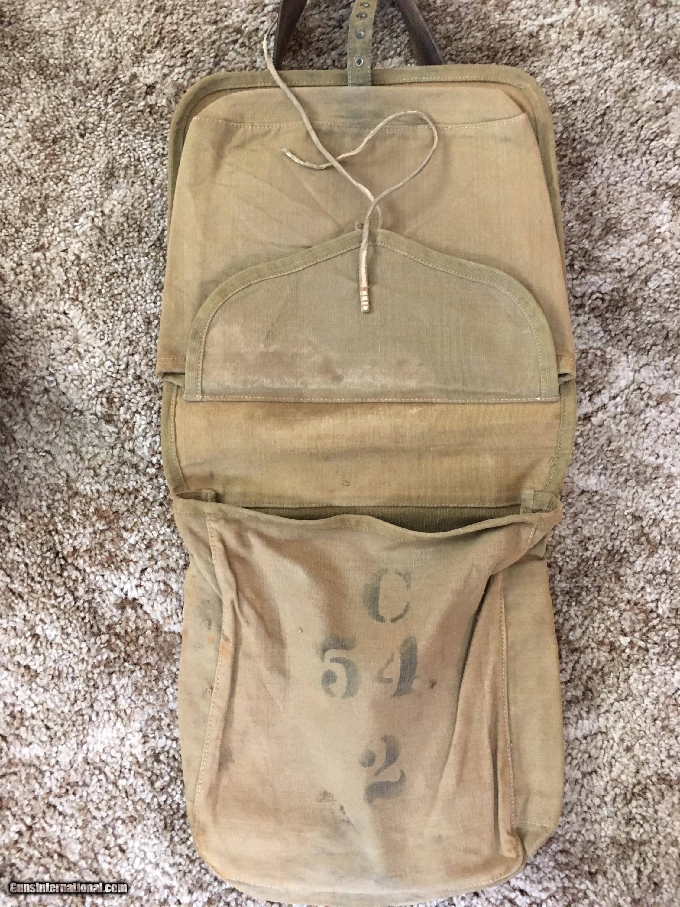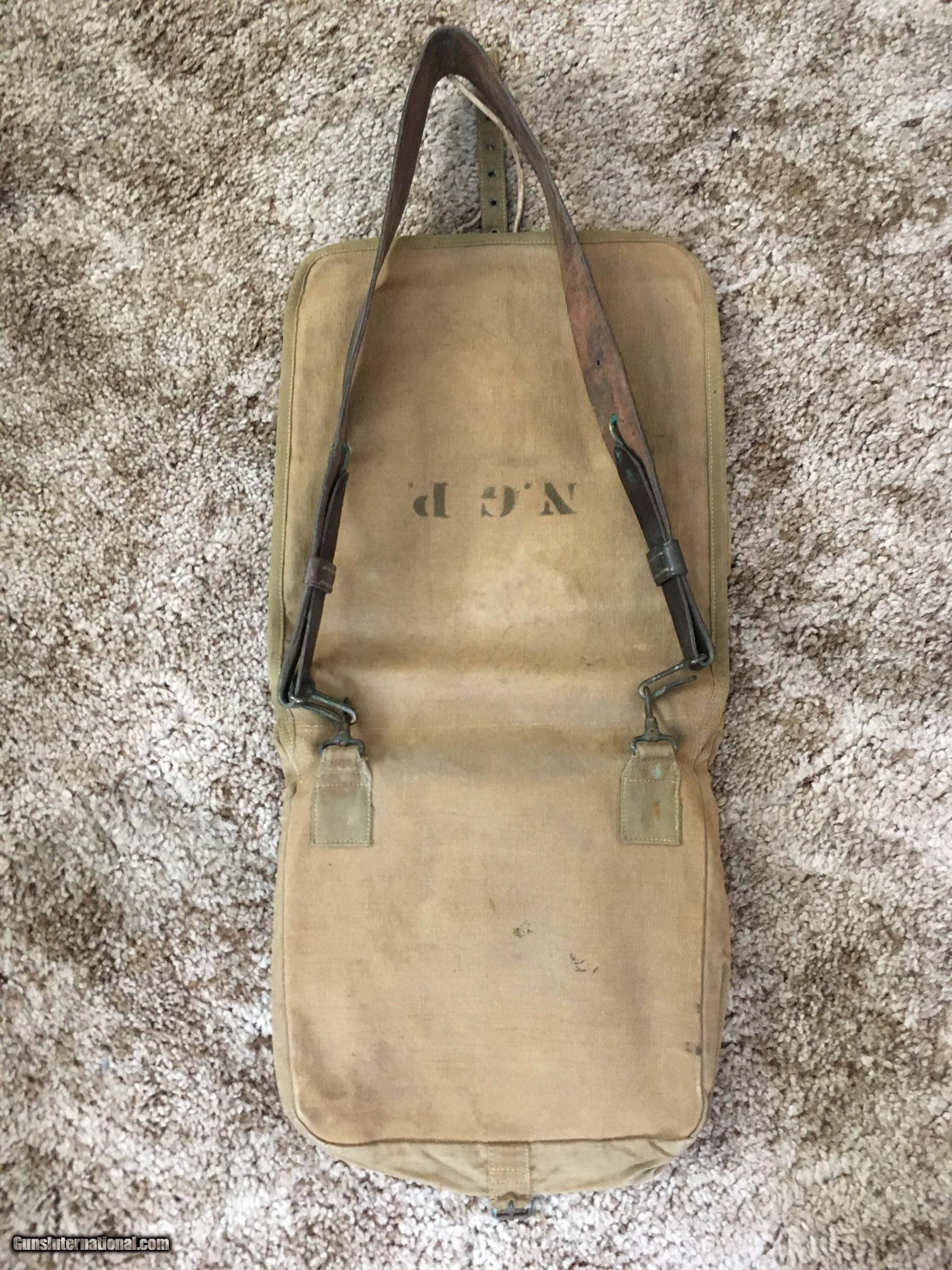Description: Haversack with leather shoulder strap and two canteens. Haversack in very good condition. N.G.P. marked. Most likely National Guard Pennsylvania. One infantry canteen with leather shoulder strap. Cork stopper and chain keeper intact but worn. One canteen with cavalry saddle hanger marker RIA 1904. Cork stopper and keeper chain intact but worn. All three pieces and free shipping, $350 SOLD |