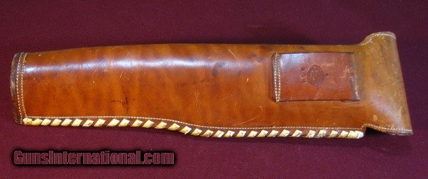 Description: Herman Heiser holster for scope with sidemount such as Griffin & Howe. Made from heavy oak tanned saddle skirting leather with rawhide thong wrapped stitched edge. Fully sheep skin lined. Oval makers mark dates this from 1919 to 1955. Overall length of 17" and width of 5" I have never seen another like this and not listed in Catalog #20. Also makes an excellent holster for a .22 Buntline pistol, SOLD |