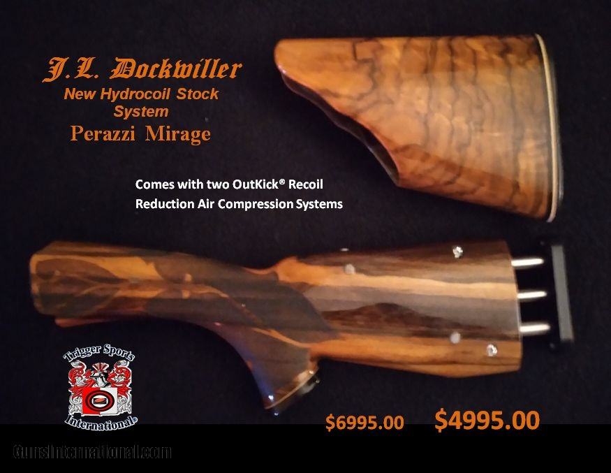 Description: New Dockwiller Exhibition Grade Hydrocoil Stock for Perazzi Mirage with Two New HydroCoil Units Last HC Dockwiller Stock Available! Trigger Sports International worked with Jack Dockwiller since the seventies generating the finest quality competition shotguns worldwide. See the DockwillerGunsmiths memorialsite for some samples of Jack’s work. This exhibition grade French Walnut stock was hand made by Jack to accommodate the original hydro-coil air compression unit to eliminate recoil. Trigger Sports has designed a new Air Compression unit that has an external air valve to allow easy access to recharging the unit with a manual or electronic pump. A $79.00 hand pump is included with the stock package. This stock is made for the Perazzi Mirage or like Perazzi shotguns. Two of the new OutKick® air compression units are included with the set free of charge. Jack Dockwiller priced the stock set at $6995.00. You can now purchase the set for $4995.00. Contact Trigger Sports for more information. 321-259-7365. TriggerSportsintl. We appreciate your business. SOLD Shotgun Gauge: 12 Gauge, 20 Gauge |