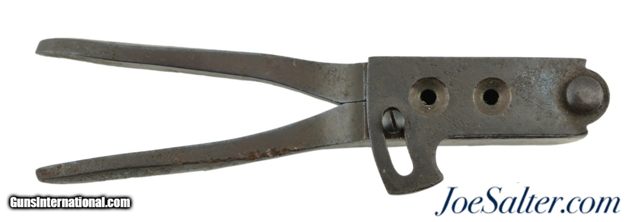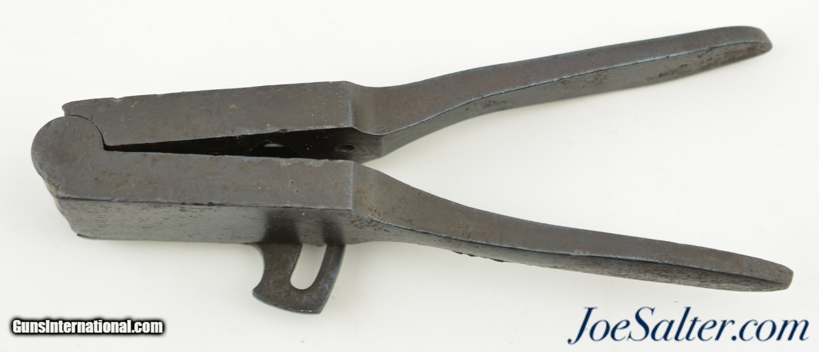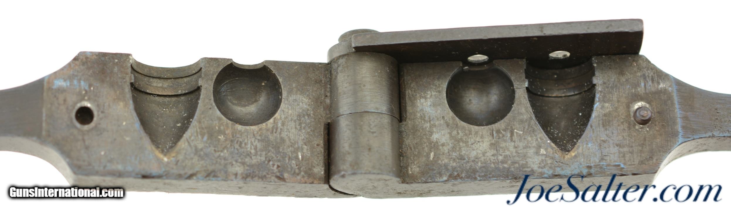 Description: Colt Model 1860 .44 Bullet Mold. It is the typical "straight-legged" blued iron, dual-cavity .44 caliber mold, which casts one conical and one round ball. The right side has the usual Colt caliber markings, 44H near the hinge. The original sprue cutter is in place on the top of the mold and is lightly marked in two lines: COLT’S / PATENT. Condition is very good as refinished, has heavy signs of use, light oxidation and pitting. The cavities are in excellent condition. A well used but taken care of example. This example is not military marked. ; SOLD |