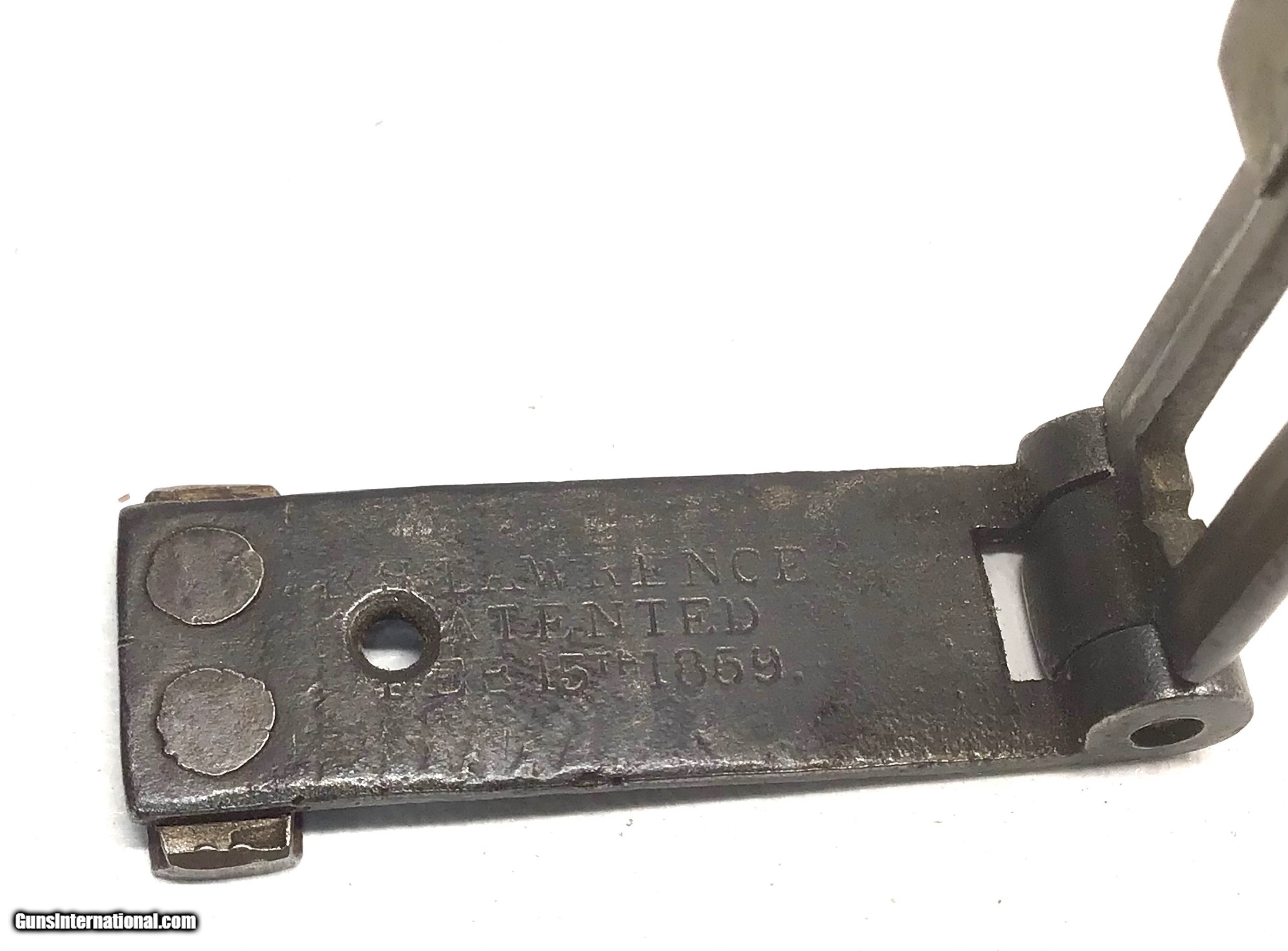 Description: Sharps Rifle/Carbine Rear Sight Details Overview This listing features a vintage, original rear sight from a Sharps rifle or carbine. The sight is marked "R.S. LAWRENCE PAT. FEB. 15TH 1859," indicating it was likely manufactured for a Civil War era carbine. Condition The rear sight is in good condition considering its age. The bluing has transitioned to a black-brown patina, and there is some light pitting along with surface rust visible in the photos. These signs of wear are typical for antique firearm components. Dimensions