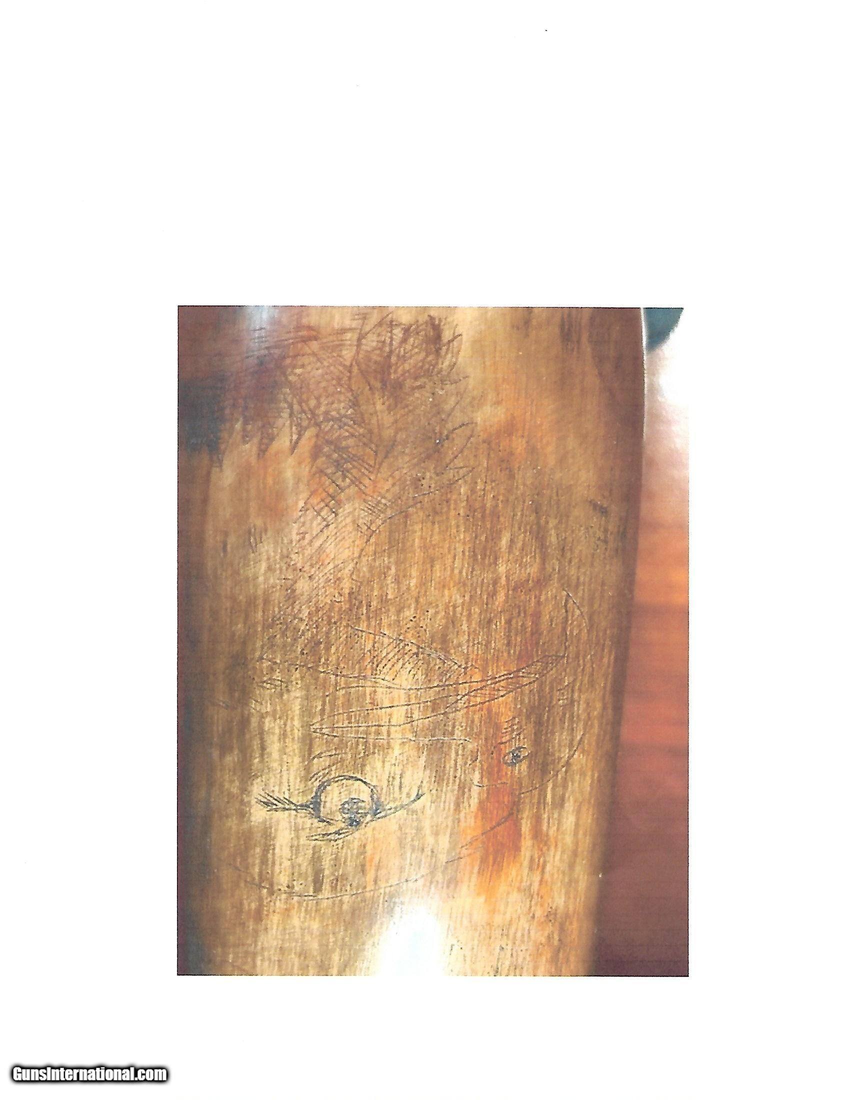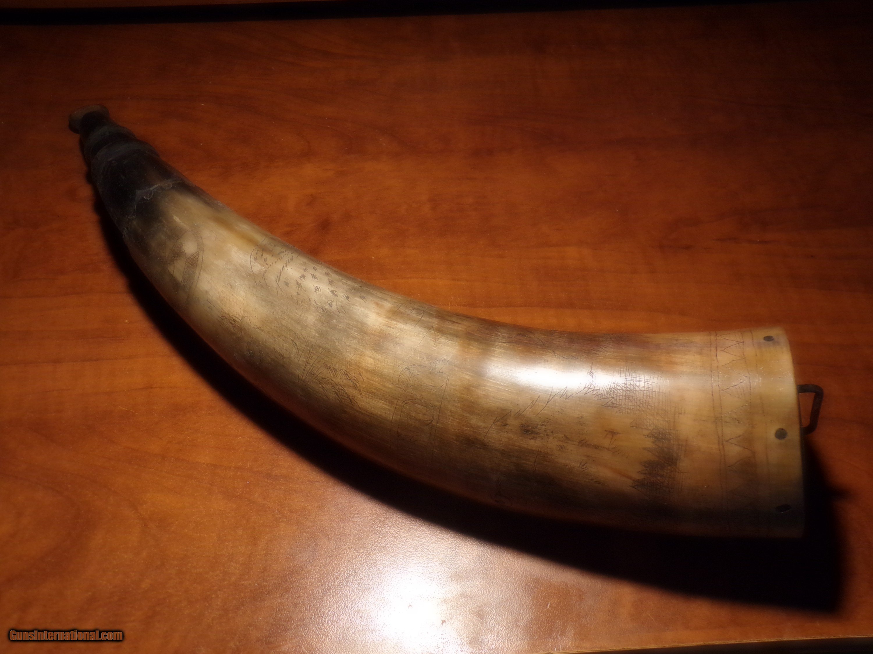 Description: This is an Antique 18" long American Recreated ca. 1757 Scrimshawed Eagle, Bison and other Animal Black Powder Muzzalloader Powder Horn. It is a perfect companion for your Flintlock Rifle. This Horn is hand carved and hand etched. It will be shipped to you in the U. S. after your payment clears using PayPal. SOLD |