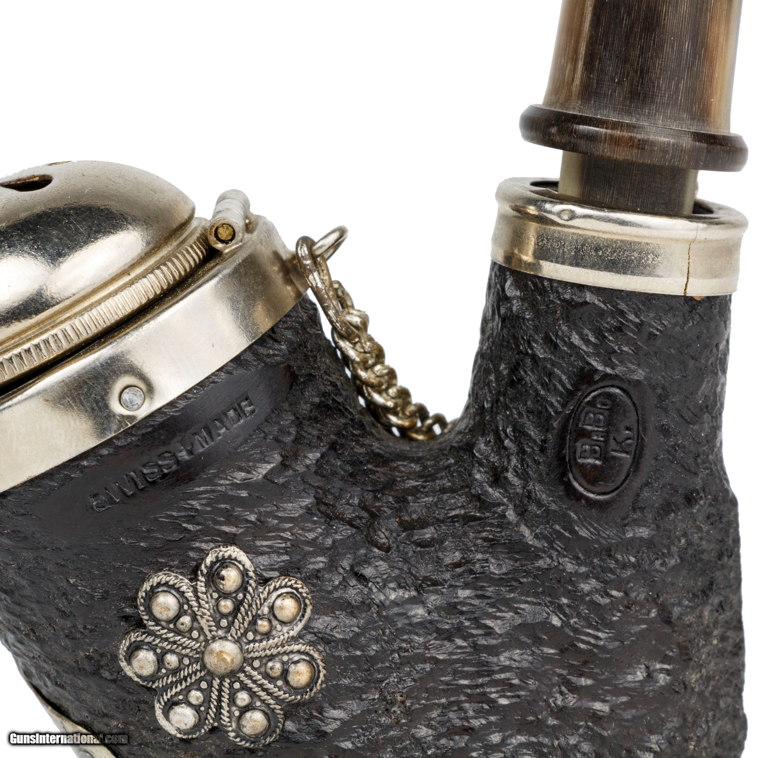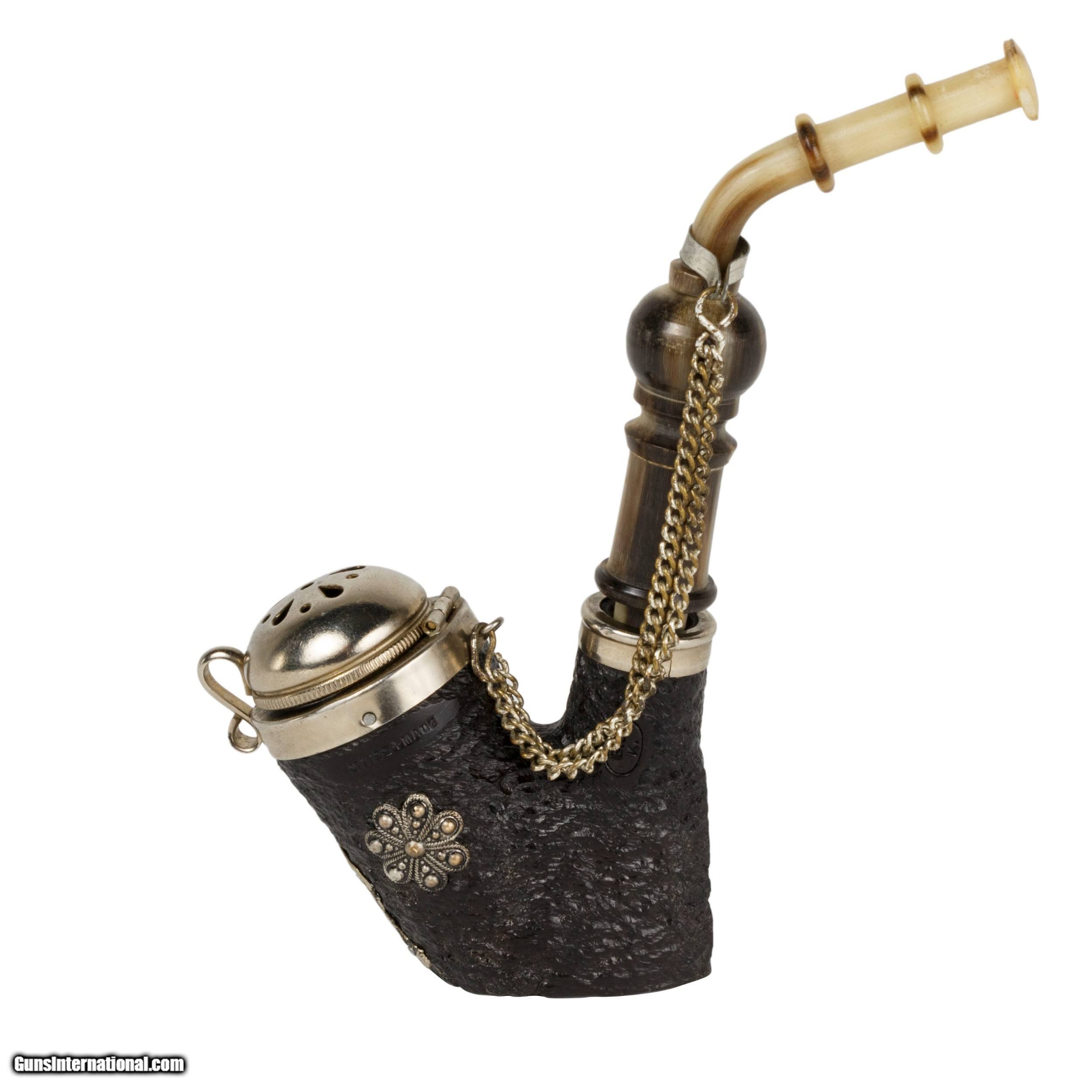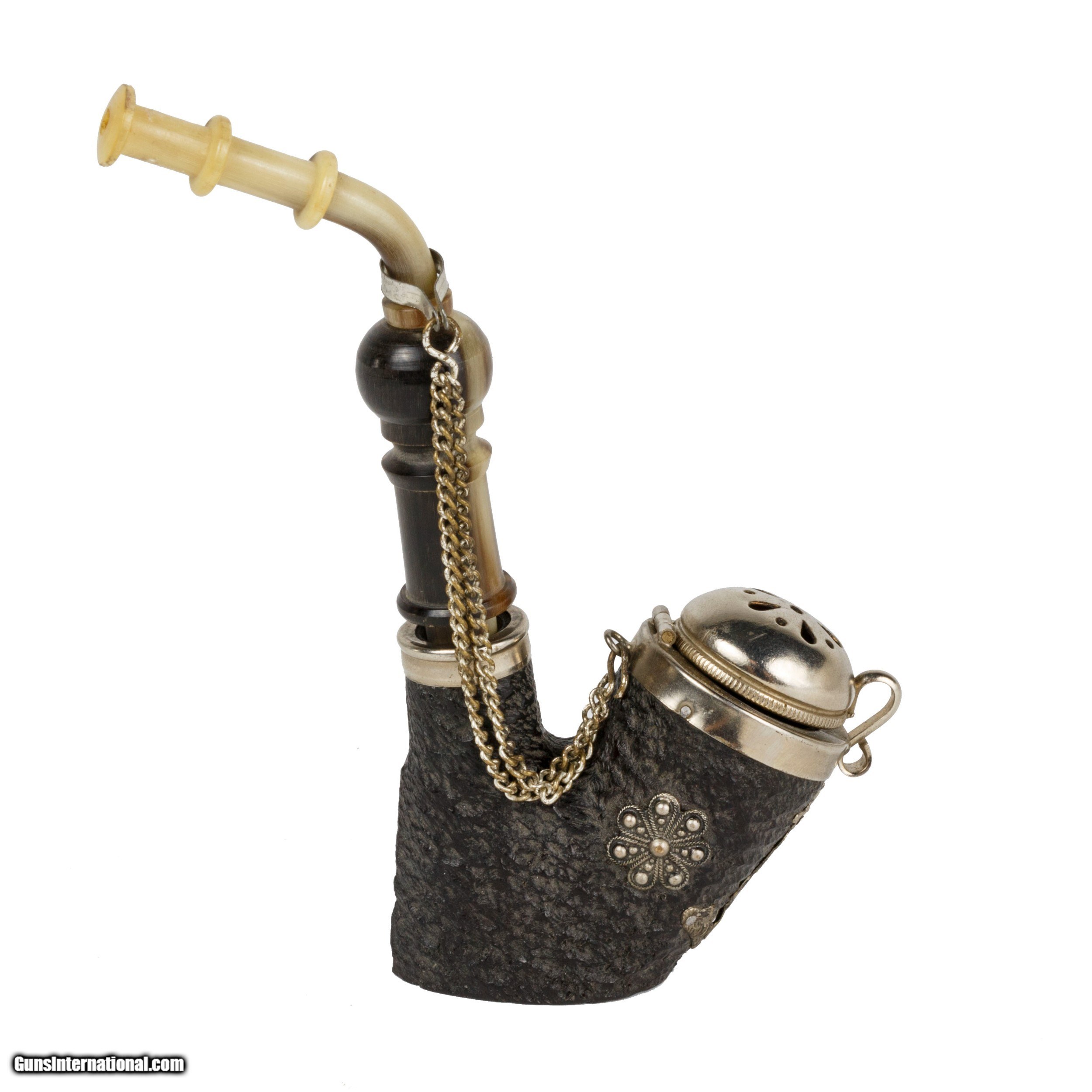 Description: Beautiful vintage horn stemmed pipe. Piece is swiss made and very decorative. Features a sterling filter with chain that attaches to stem. Piece also has sterling designs around bowl, featuring florets on either side and an elk or stag on the bottom of pipe. Piece is marked "B.P.M." on side. Measures 6" in length Inventory: A1056 SOLD |