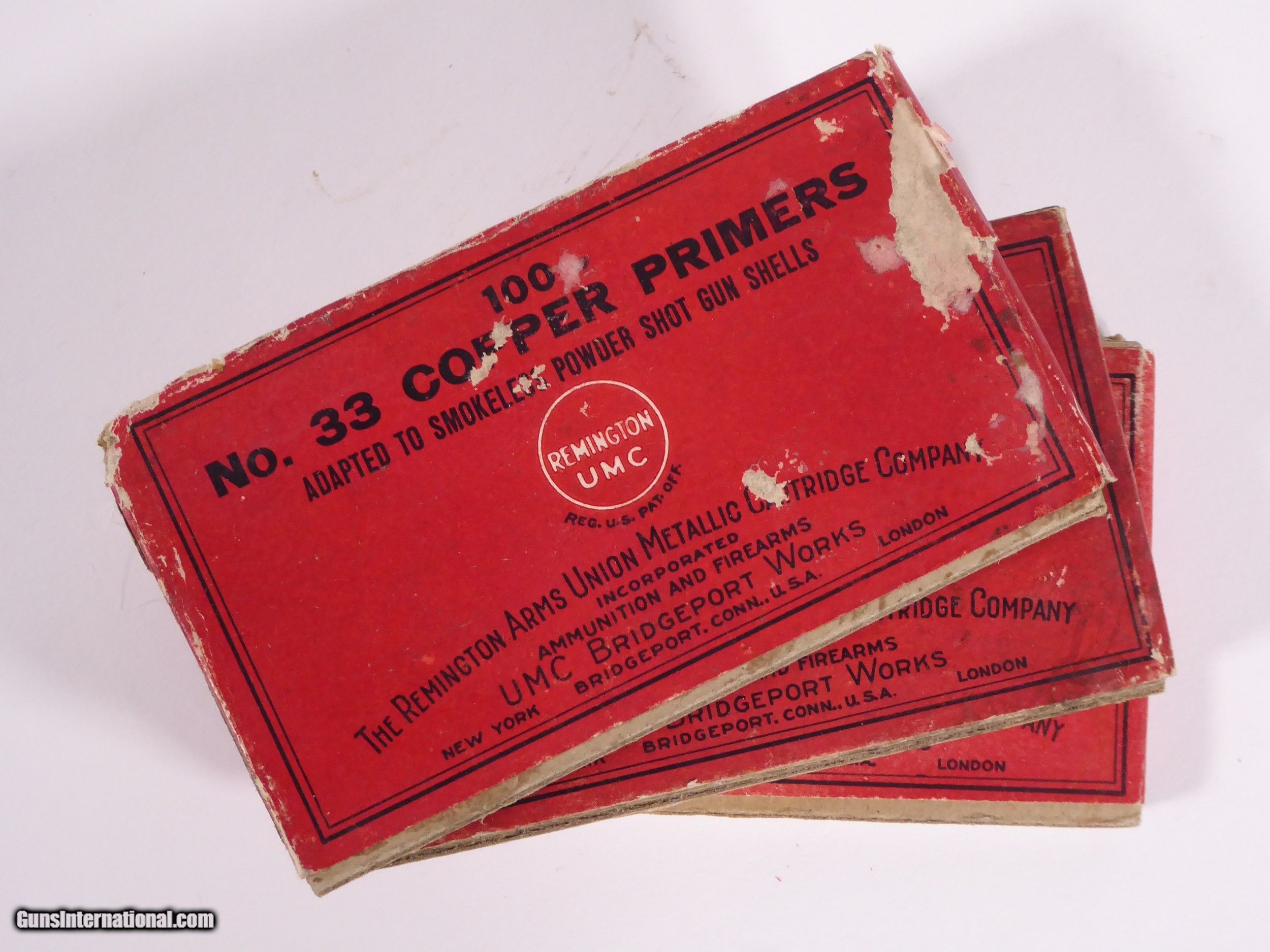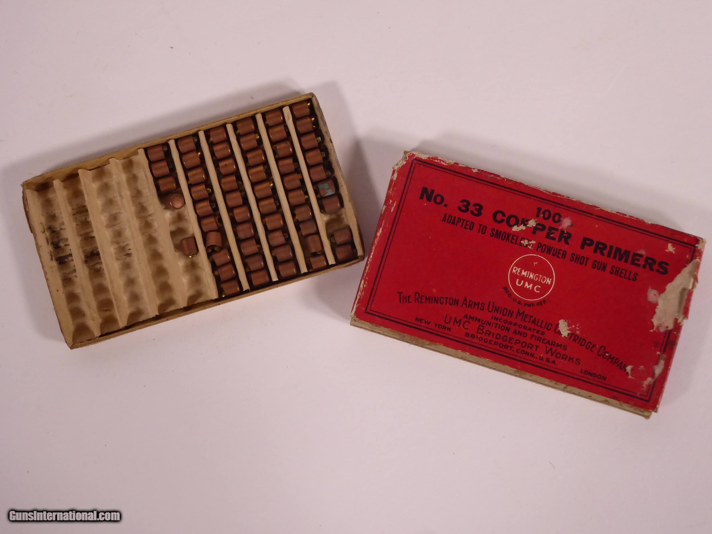 Description: Three boxes No. 33 Remington copper primers. Partially full. Wear and tear on boxes. Photos show boxes closed and open. SOLD |