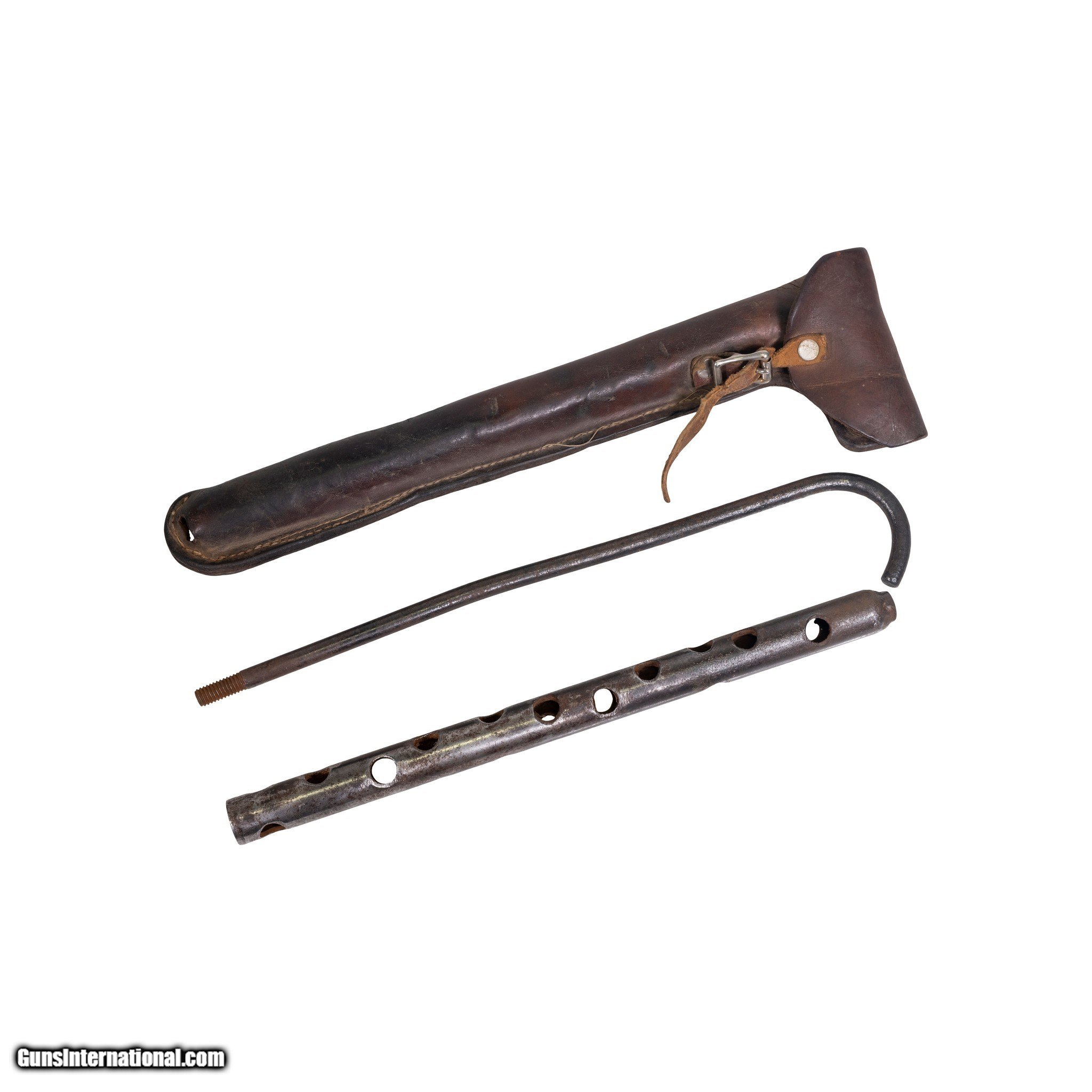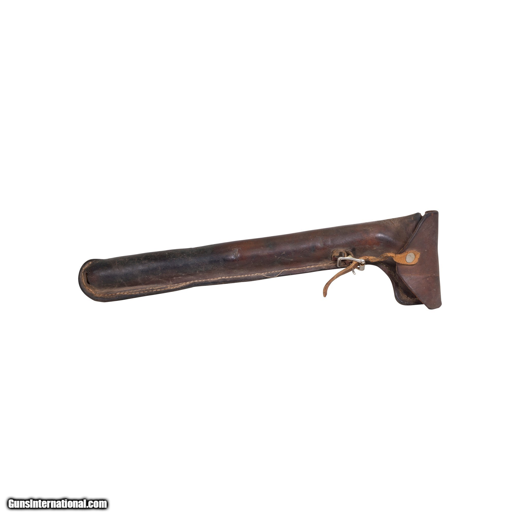 Description: Running Iron- the rarest of cowboy collectibles. Cattle rustlers running iron. A tool of professional rustlers in the west involved in the stealing of branded cattle and altering the brand. In the very early west cattle rustling was almost accepted as a way to build one's herd of livestock which is how many cattle ranches got their start. Stealing an unbranded calf who was not following their mother was not even looked upon as rustling, but as the cattle barons decided it was hurting their pocketbooks cattle rustling began to be seen as a serious crime. There are two types of branding irons. The stamp iron which included the full brand, and the running iron which had a tip that could be used to change or make any brand. The running iron was the favorite tool for the cattle rustler. Being caught by a vigilante group with a running iron in one's possession could mean certain death by hanging if the law wasn’t around. This one works by unscrewing the iron from the tube handle then re-screwing it in the other end before heating the brand. It was small and easily concealed. This iron is 24" Long when assembled. When put away into the leather scabbard it is 13" Long. Widest is 2". Comes with original scabbard that has seen much use. Note burn holes in bottom from putting in hot. SOLD |