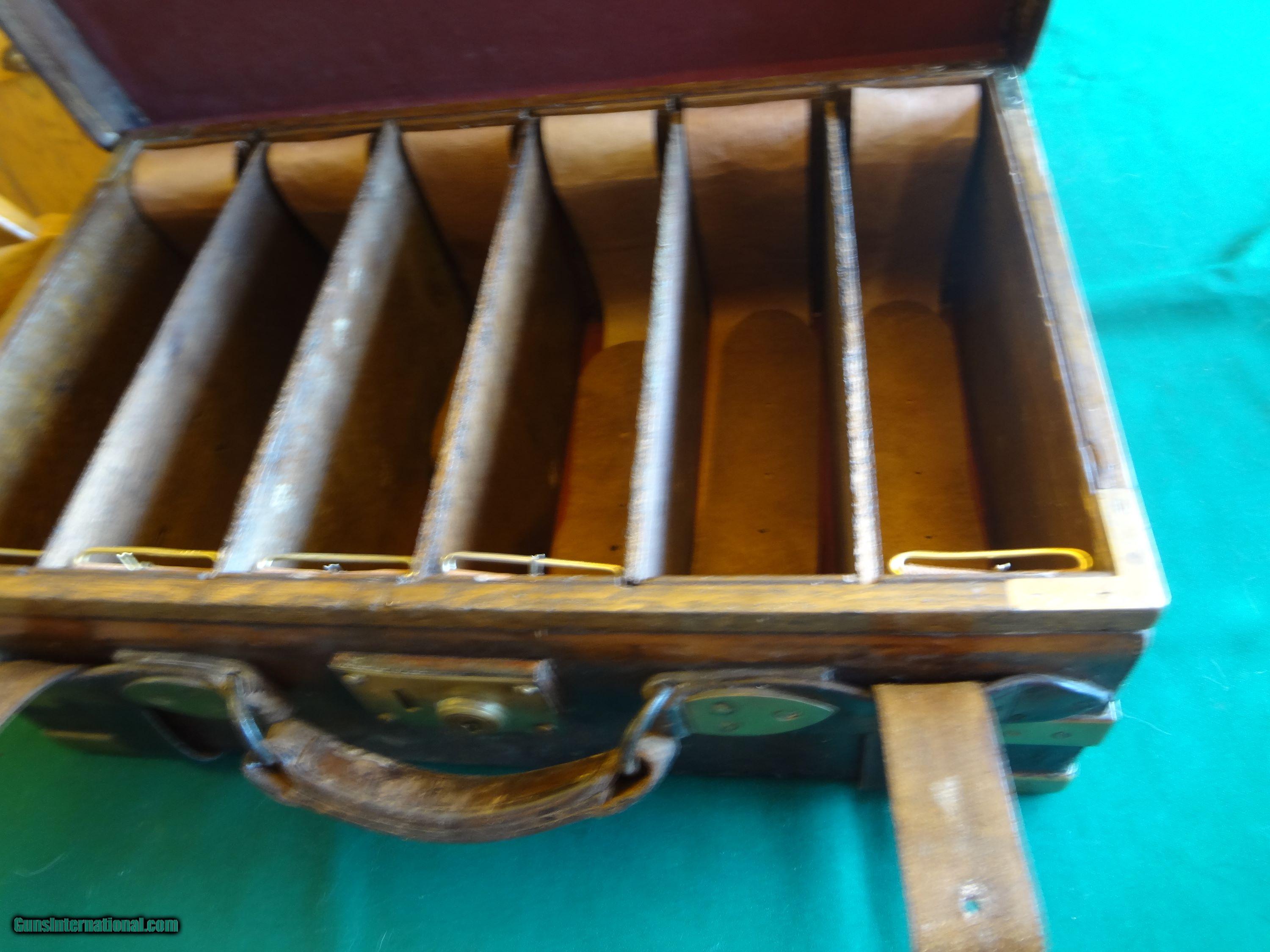 Description: A Cogswell & Harrison Brass bound Oak and Leather cartridge magazine for 300 12 ga. shells. Very strong and sound case with a Oak frame reinforced with Brass corners and brass bindings. Nice strong leather with a good handle and replacement case straps. The brass lock works fine but there is no key, as usual. All 6 compartments have removeable dividers and pigskin lifter straps secured with brass buckles. This is a great looking vintage case and will look super on display and it is very useable at your next Vintage shoot. Please email or call 760-497-7836 if you have any questions. We are also open to trade offers for quality arms. Thank you for looking and good shooting. Raff SOLD |