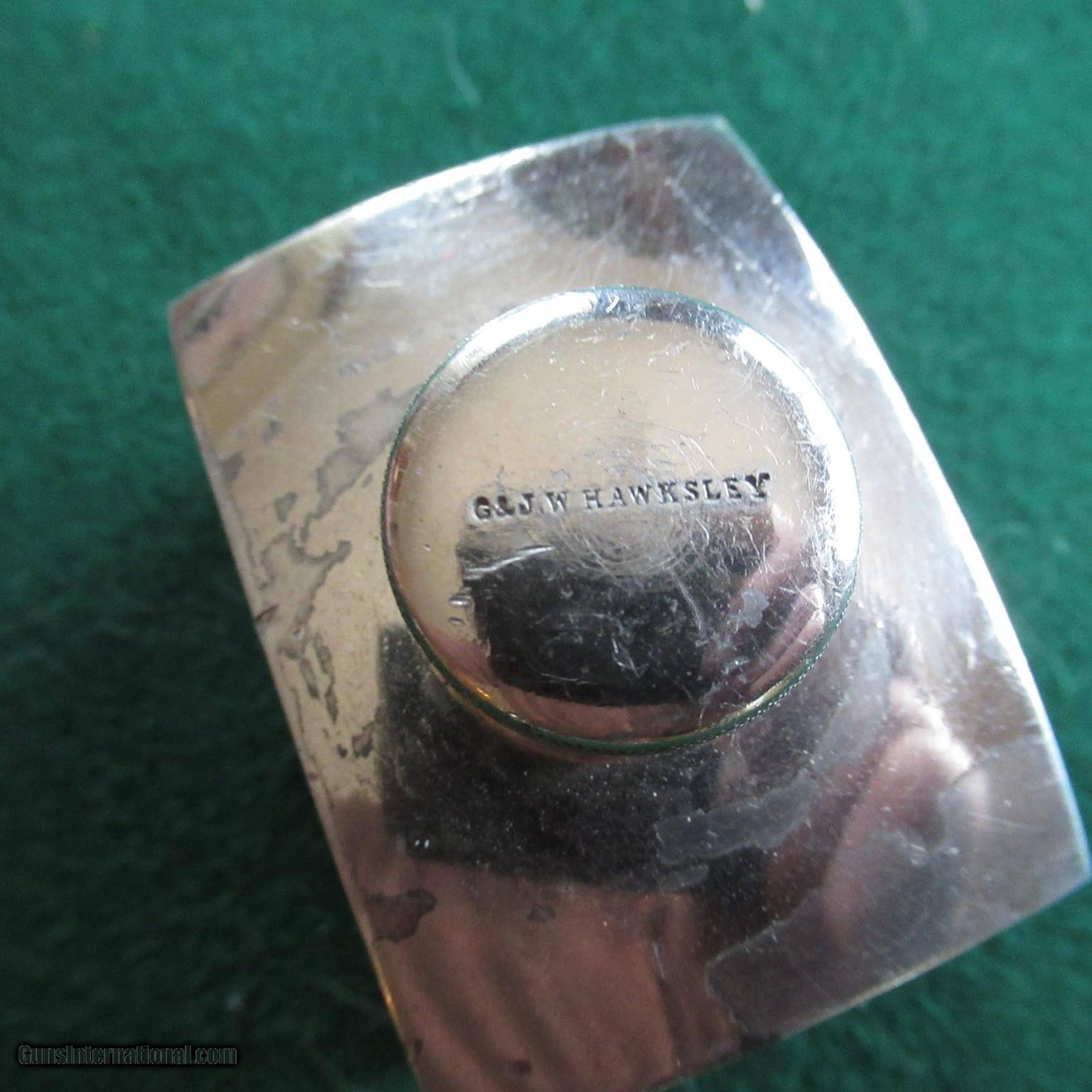 Description: A antique G & JW Hawksley oil bottle dating from 1890 or so. Nickel plated over brass. Lid threads on snugly with original feather. The plating is worn in a couple places as you can see in the photos. Hawksley name on the lid is well struck and clear. It is 2 1/4" L x 1 3/4" W x 2" tall. This will make a nice accessory to fill out your gun case or just for display. Please call Raff at 760 497 7836 if you have any questions and thank you for looking. SOLD |