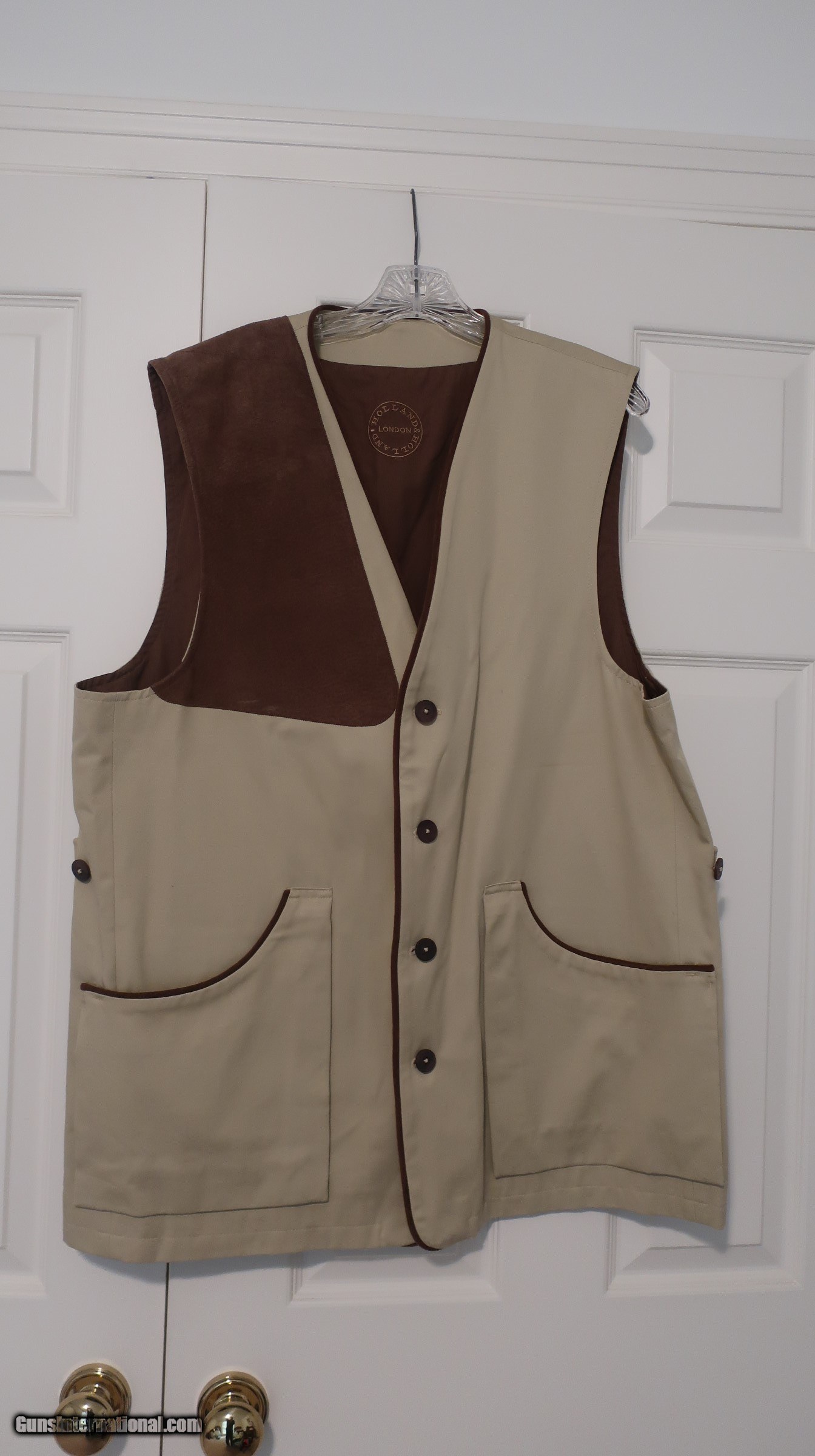 Description: SALE PENDING. Used but not worn. H&H cream-colored gabardine cloth vest with brown trim and leather shoulder patch. 2 outer pockets and 2 inner pockets with button closures. H&H logo embossed on top of back. Made in France for H&H. Size 58, which translates to about size 46-48 US. EMAIL CONTACT IS BEST. THANK YOU. SOLD |