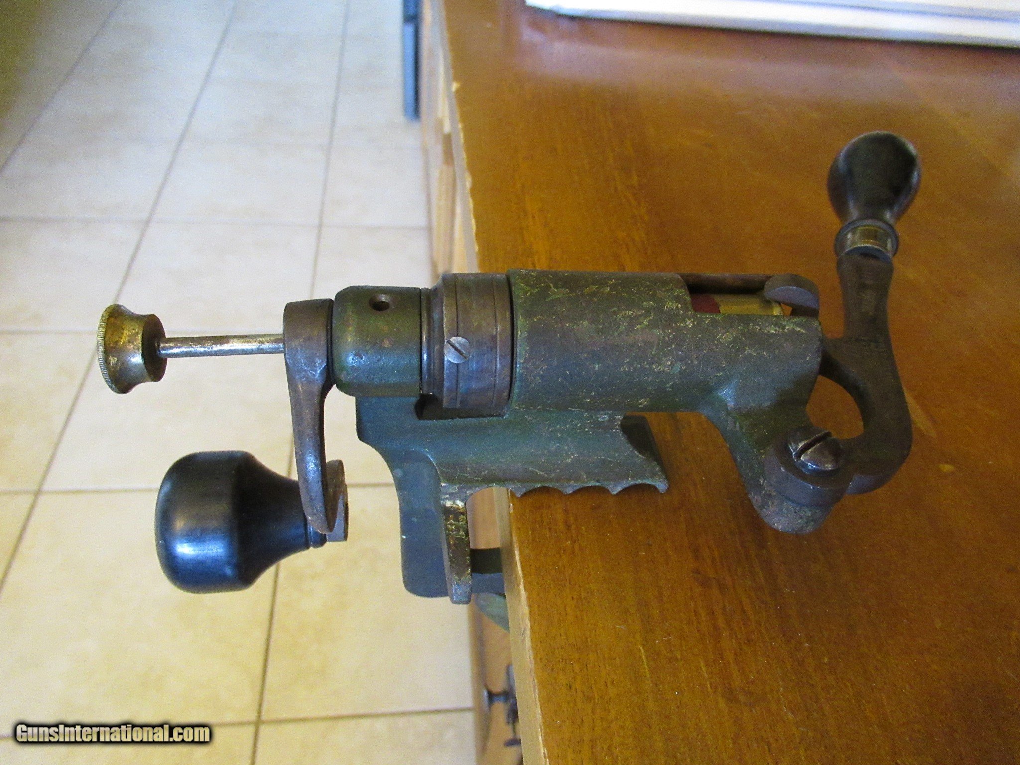 Description: Antique roll 12 bore roll crimper by James Dixon & Sons, Sheffield, England. Made in the 1880's or just after. This is their catalog # 5119 and is listed as "Double clip for bench work". Fully complete and excellent working condtion. 85% original Olive Green paint and 50%+ color caase hardening remaining on the lever. This has not seen a lot of use. It turns out perfrect roll crimps on paper and plastic shells. It does round ball slugs well. Please email or call Raff at 760-497-7836 if you have any questions Thanks for looking and I am always interested in trades or your offer. SOLD |