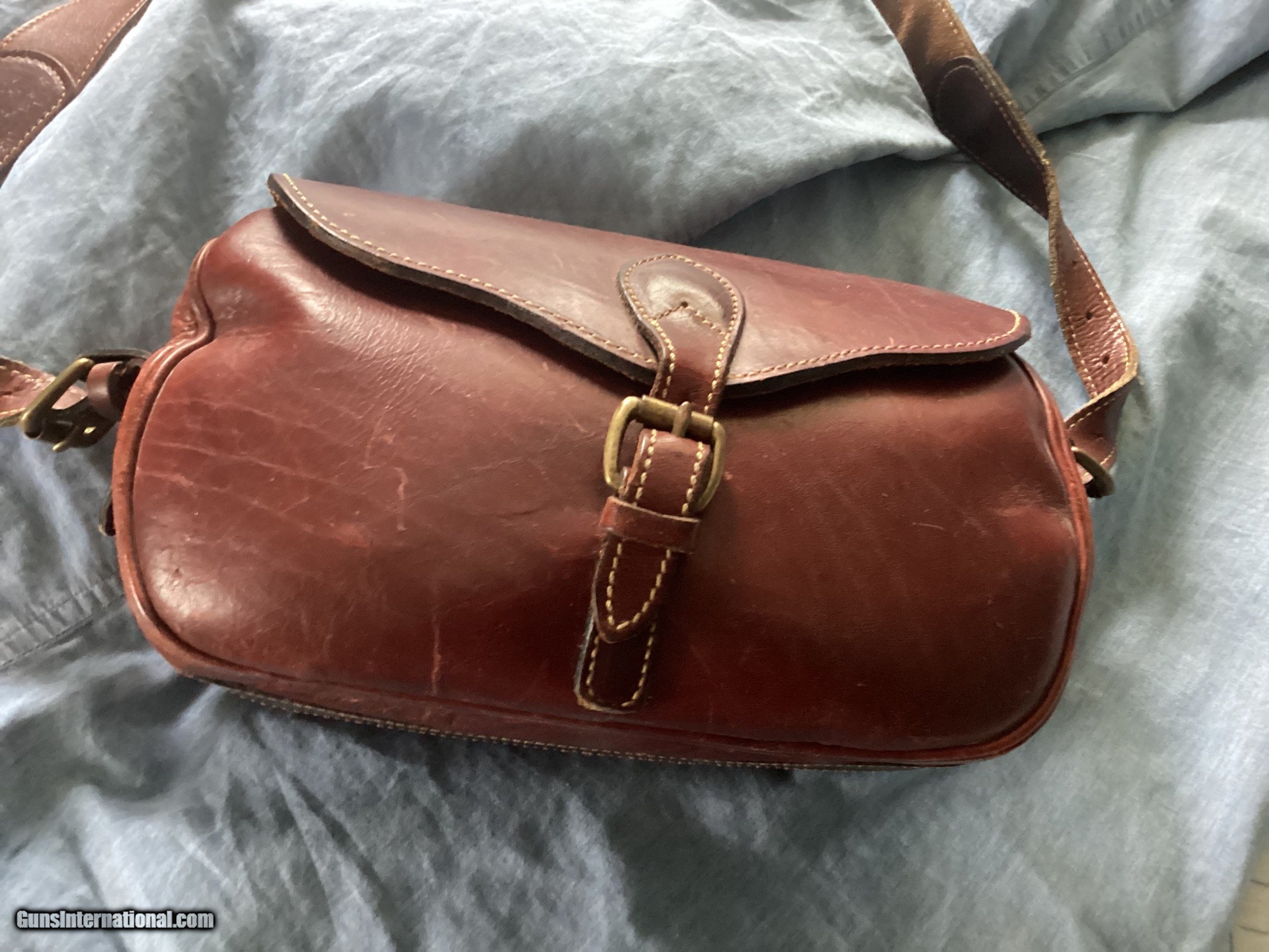 Description: A nice leather cartridge bag that will hold 100 rounds, like new SOLD |