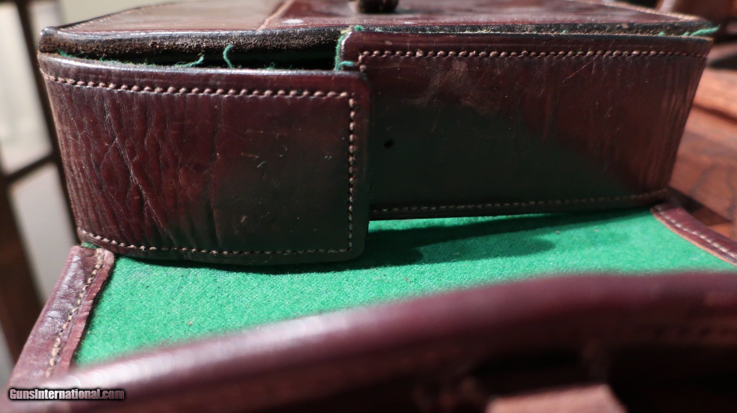 Description: This British-made case is stunning and unique. It features squared off edges and a wonderfully rich deep patina to the dark brown leather. Green baize lining and adustable partition. Set up to accommodate up to 30-inch barrels. Handle is in outstanding condition. Prior owner initials. SOLD |