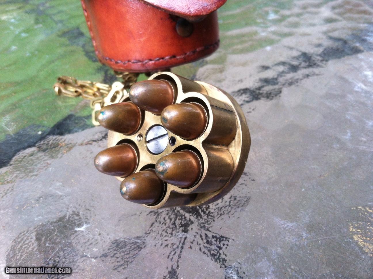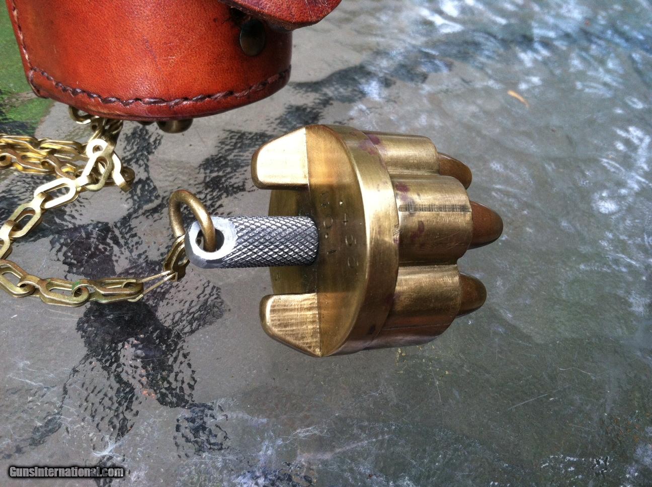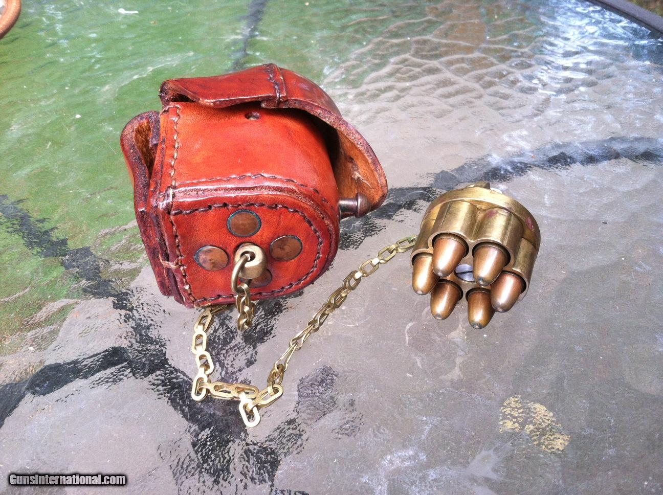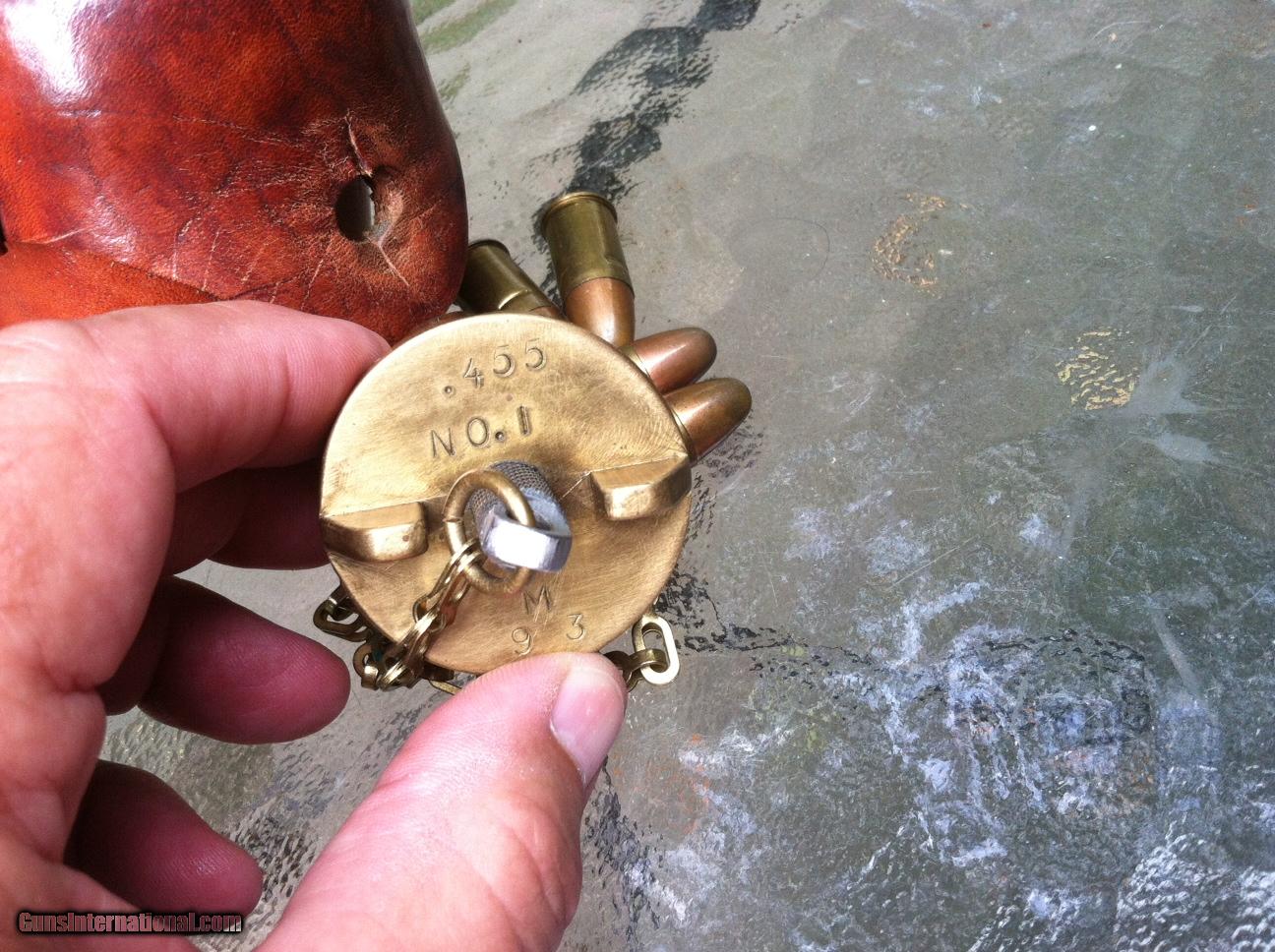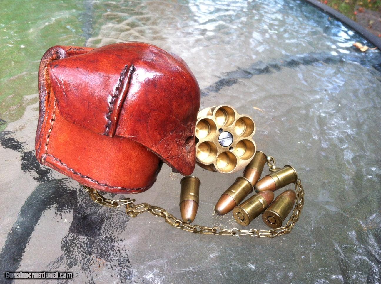 Description: This is a very well made copy of the Major Arthur Watson .455 webley revolver cartridge speed loader .These were used with the Webley Fosbery and the Mark's and the W.G. W.S. 6 shot break open's.. It is a faithfull copy of the original Watson Loader made by a very talented machinist. It's a excellent working piece just like the original and is machined very professionally. It works very well and is heavy and strong. It has a leather belt pouch with a metal liner to hold the loader when in the pouch. I dont ever recall seeing an original for sale. So its rare to find even a copy of the Watson Loader. The pictures will show the Quality. Call with any questions, Tom 612 859 5673 SOLD |