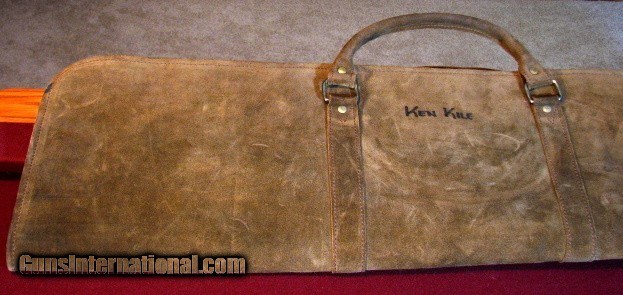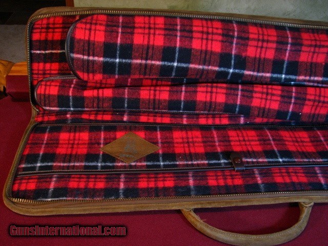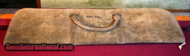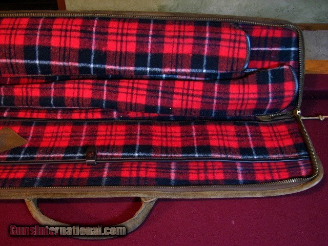 Description: Leather takedown shotgun case for barrels up to 30" with heavy flannel canvas interior. Seperate compartments for barrels and reciever. Outer leather is a heavy suede. Zippered closure. Excellent condition with previous owner's name in marker on one side. Very good quality. SOLD |