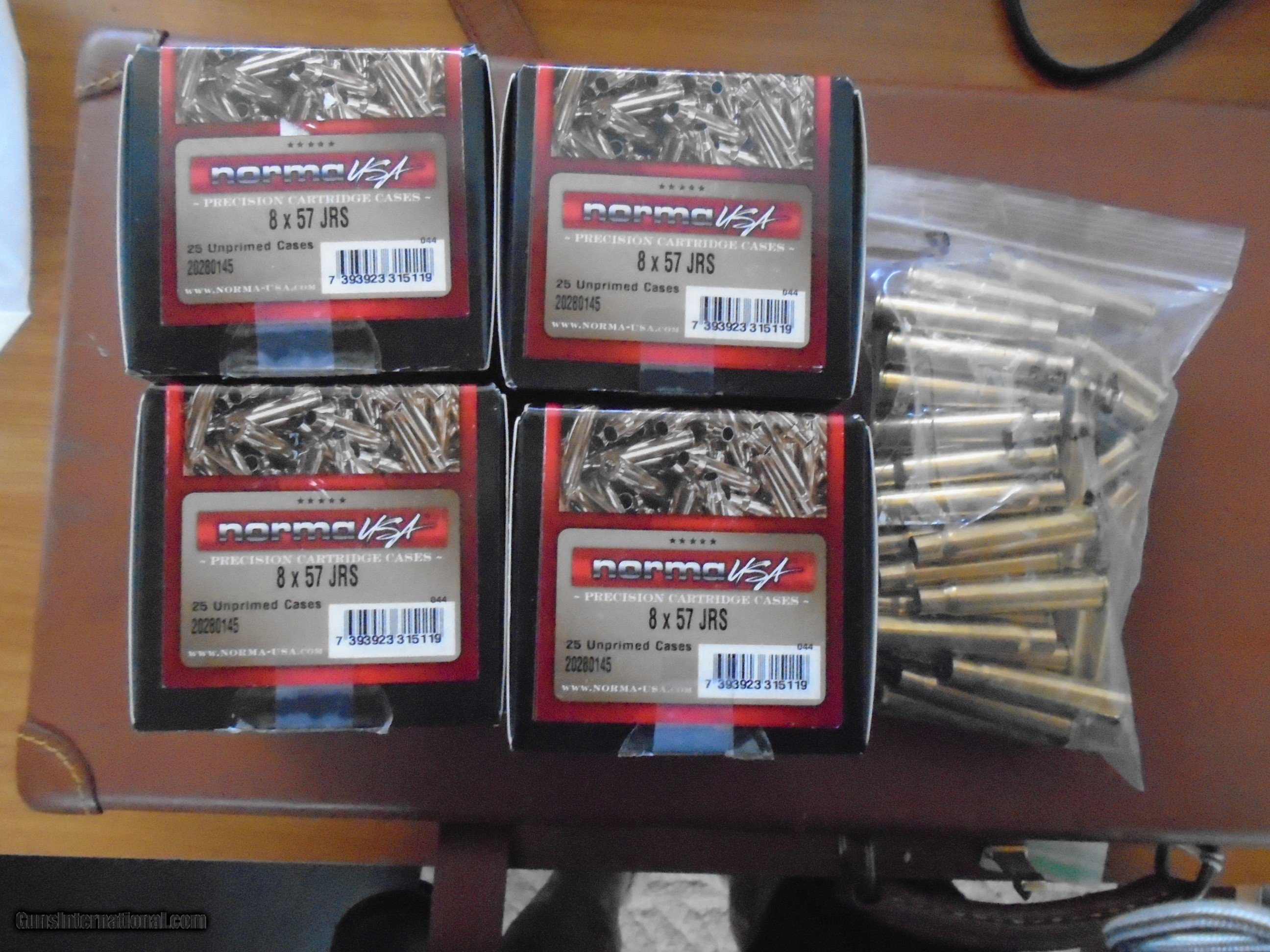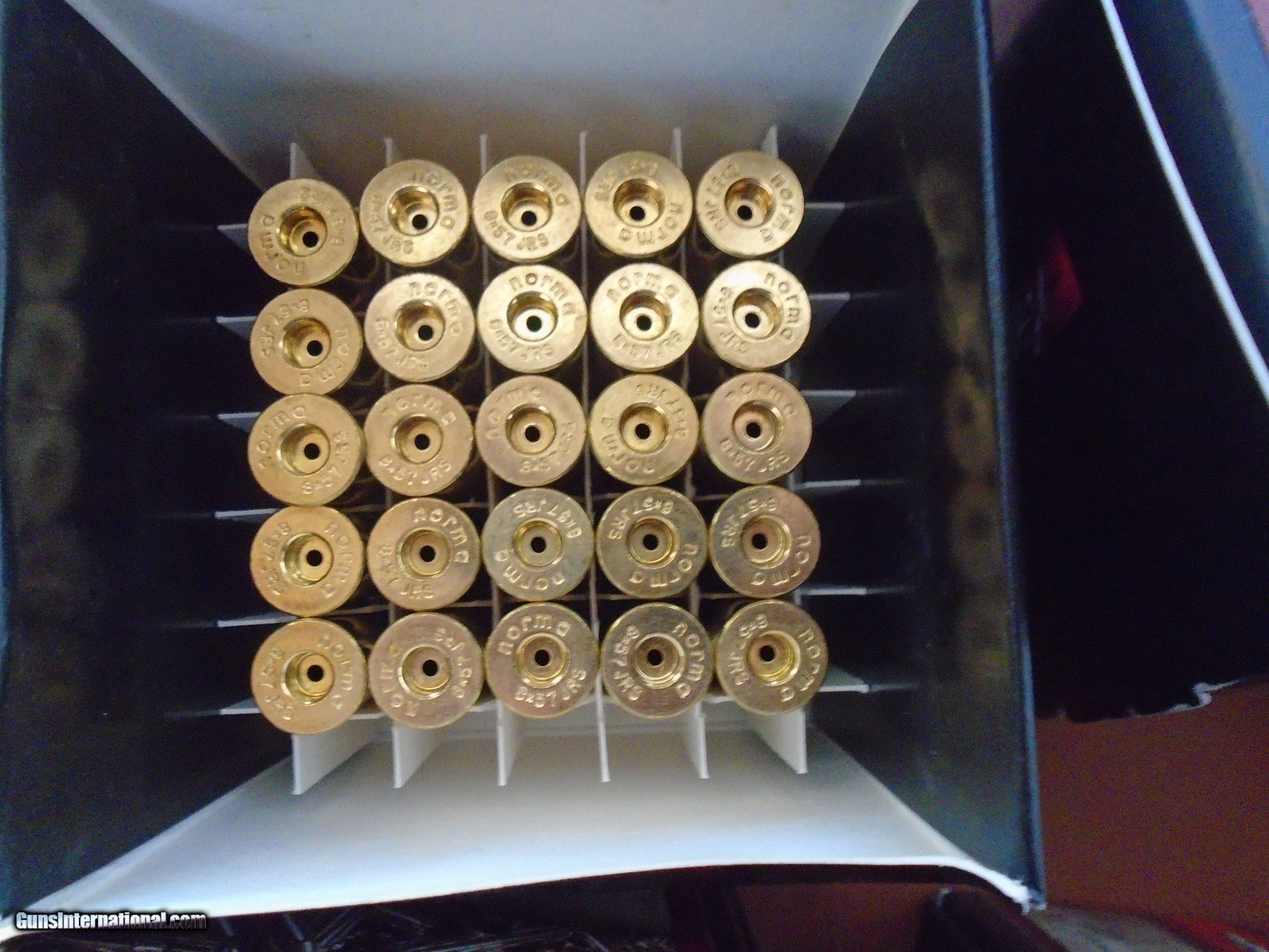 Description: Norma new unprimed 8/X57JRS brass. 148ea. 4 ea. 25 round boxes +48 in a bag. These can be used for 8X57JR (318 dia). priced at $37/box of 25 or all or any part + shipping. This is the best brass one can buy. This caliber is normally found in German double rifles and Drillings. SOLD Rifle Caliber: 7.92x57mm Mauser |