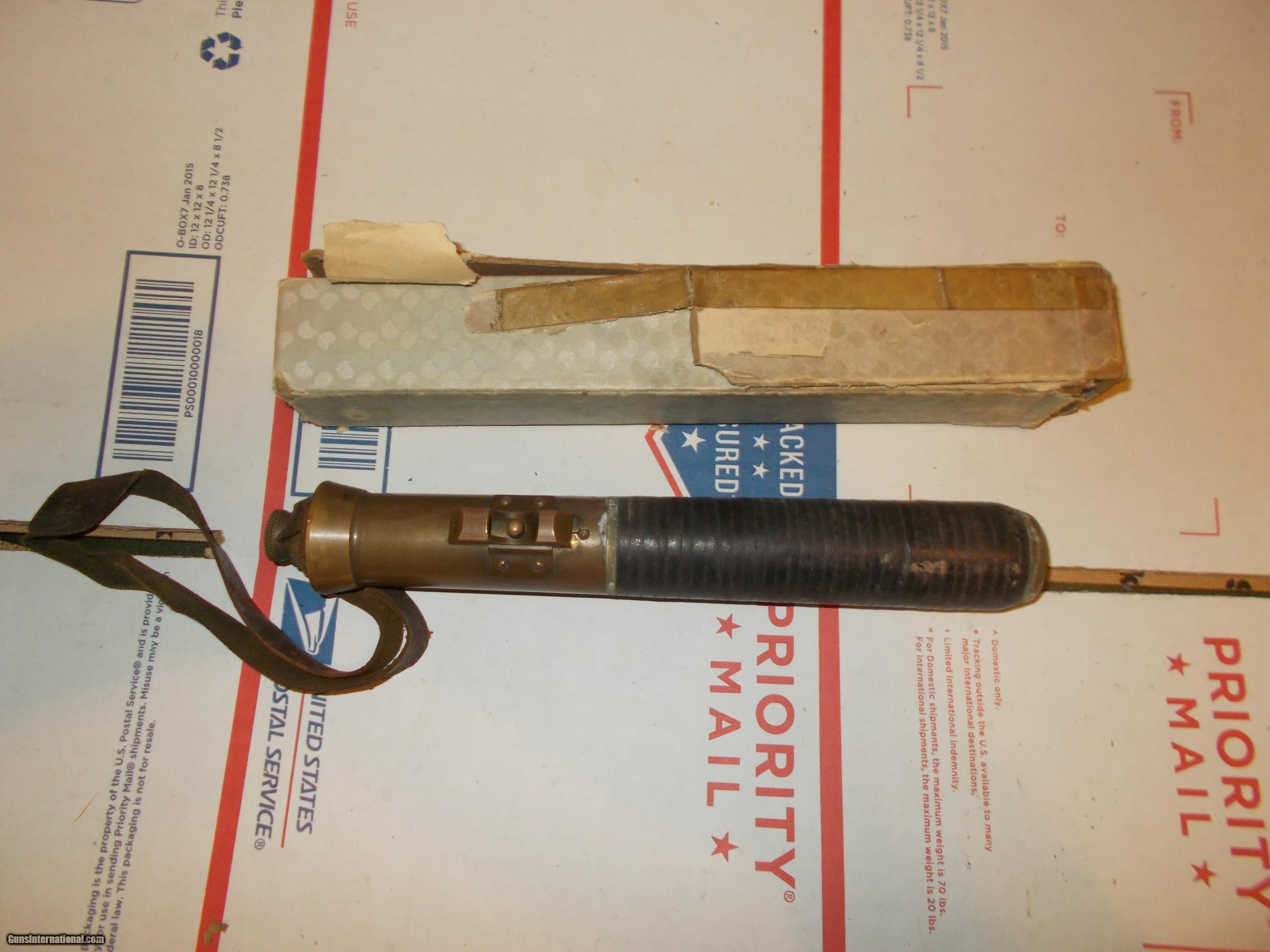 Description: federal laboratories Saltsburg PA tear gas billy club police oddity functions fine pull knob in the back-back this cocks it push button to fire saftey hood slides fine has scuffs on leather (box torn parts missing) 225.++shipping ups ground missing parts are the box corners billy club complete SOLD |