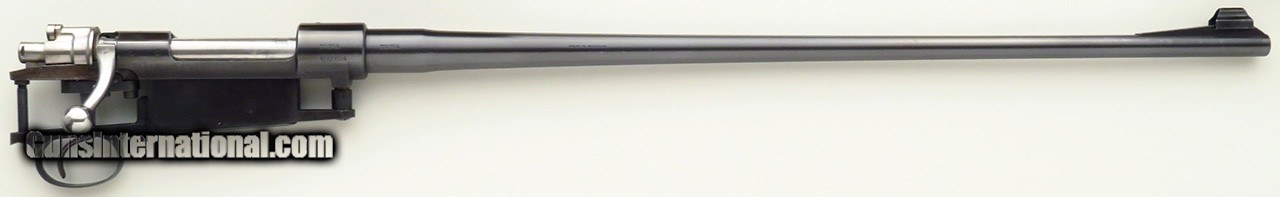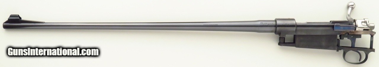 Description: FN Mauser 98 .30-06 complete barreled action. Made in Belgium during 1954, serial 29394 (3x: barrel, action, bolt handle) has a 24-inch chrome vanadium steel sporter barrel (.585-inch muzzle diameter, hooded ramp front sight with beaded blade, no provision for rear sight mounting), drilled/tapped receiver, chrome bolt with flat checkered knob, two-position safety, niter blue bolt release and steel bottom metal. Weight is 5.2 pounds. CONDITION: The bore is strong and bright. Mechanics are solid. Finish is approximately 97 percent. The price is firm. $750 plus shipping. SOLD Rifle Caliber: .30-06 Springfield |