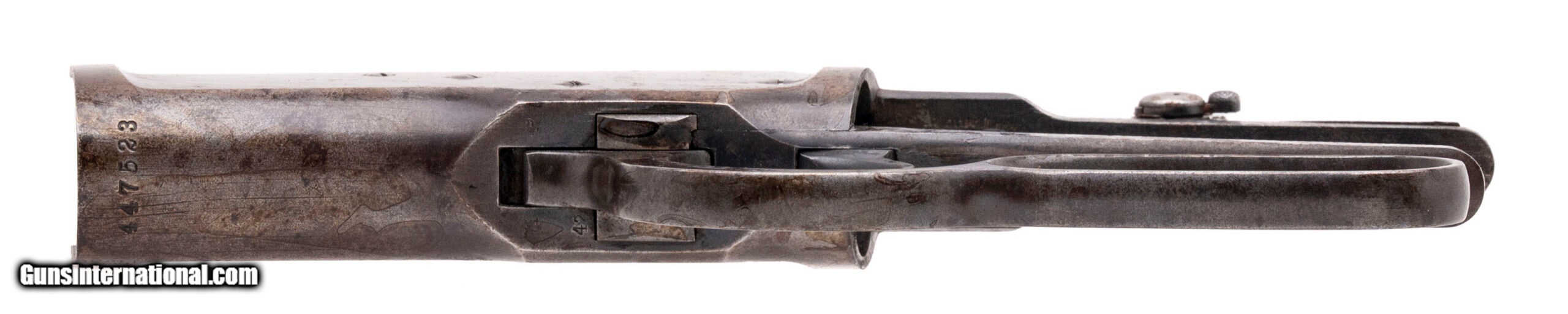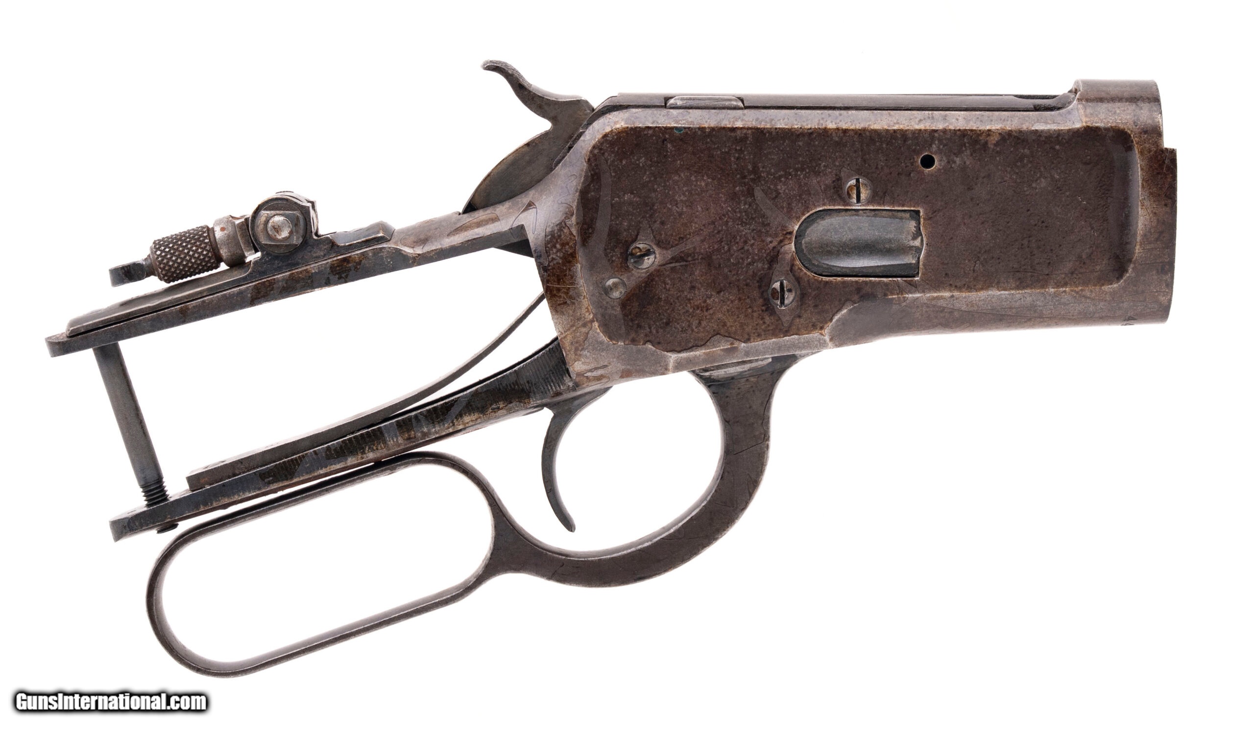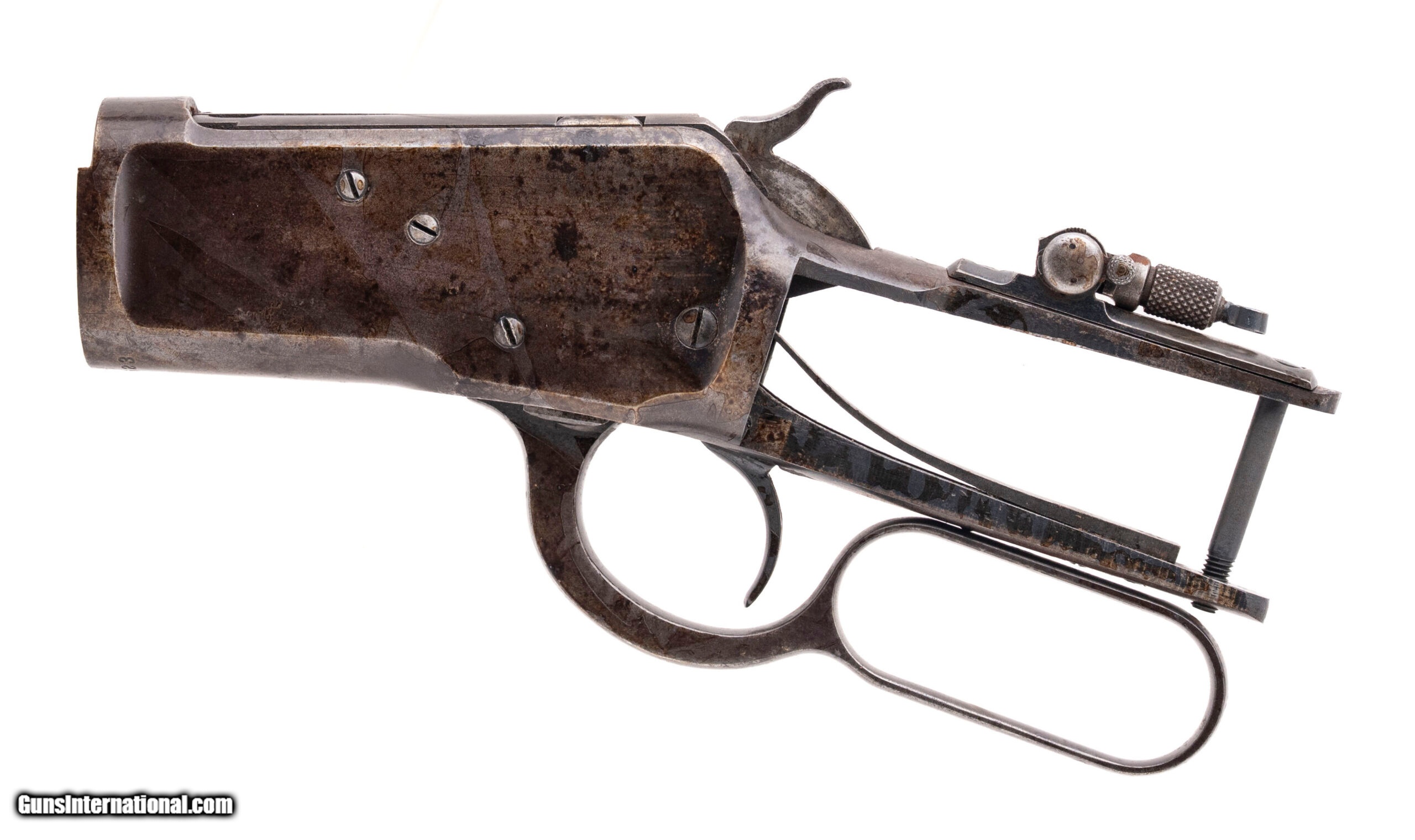 Description: "Serial Number 447523. Made in 1908. Although all internal receiver components are present along with the tang screw, there is no barrel, no magazine, and no furniture. Original factory finish has aged into a dull brownish patina. Equipped with a folding peep sight assembly that bolted to the rear tang. SOLD |