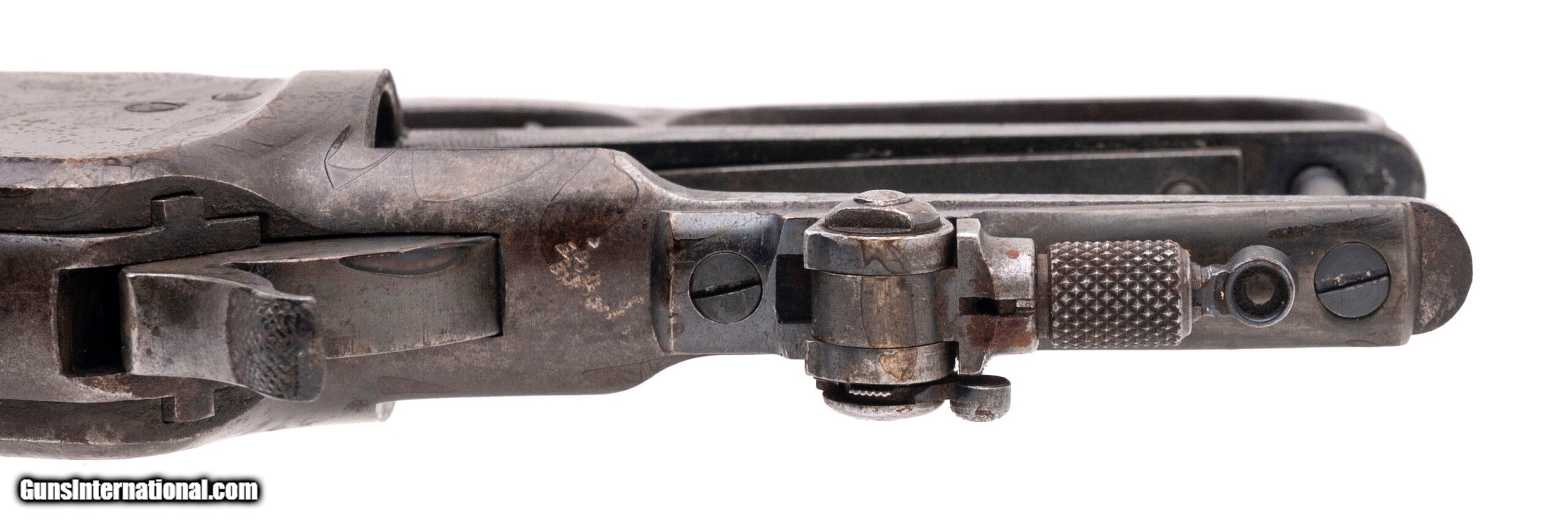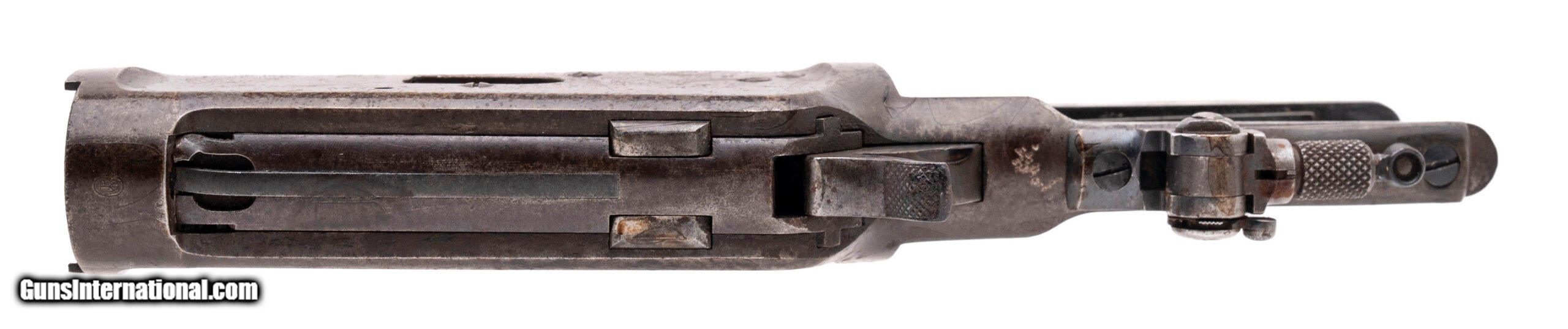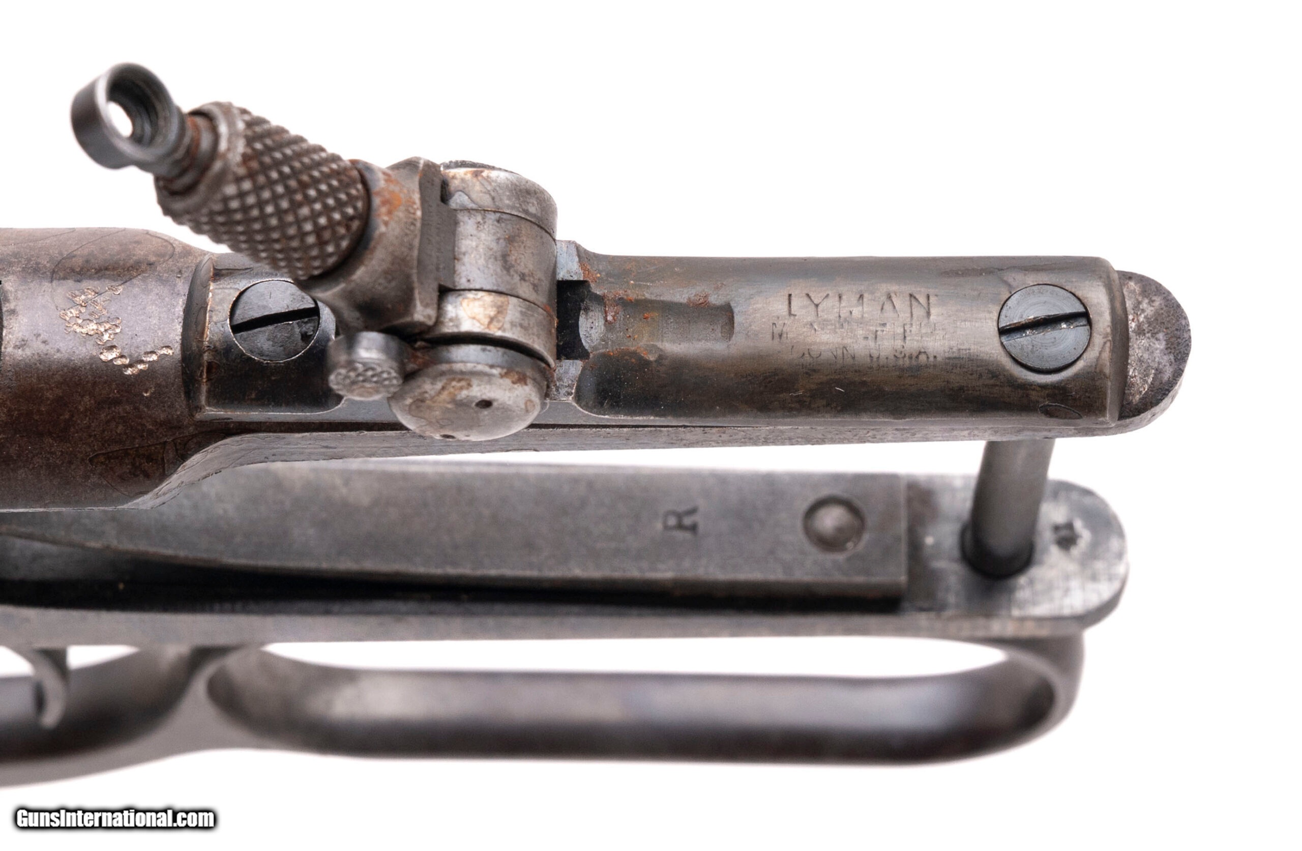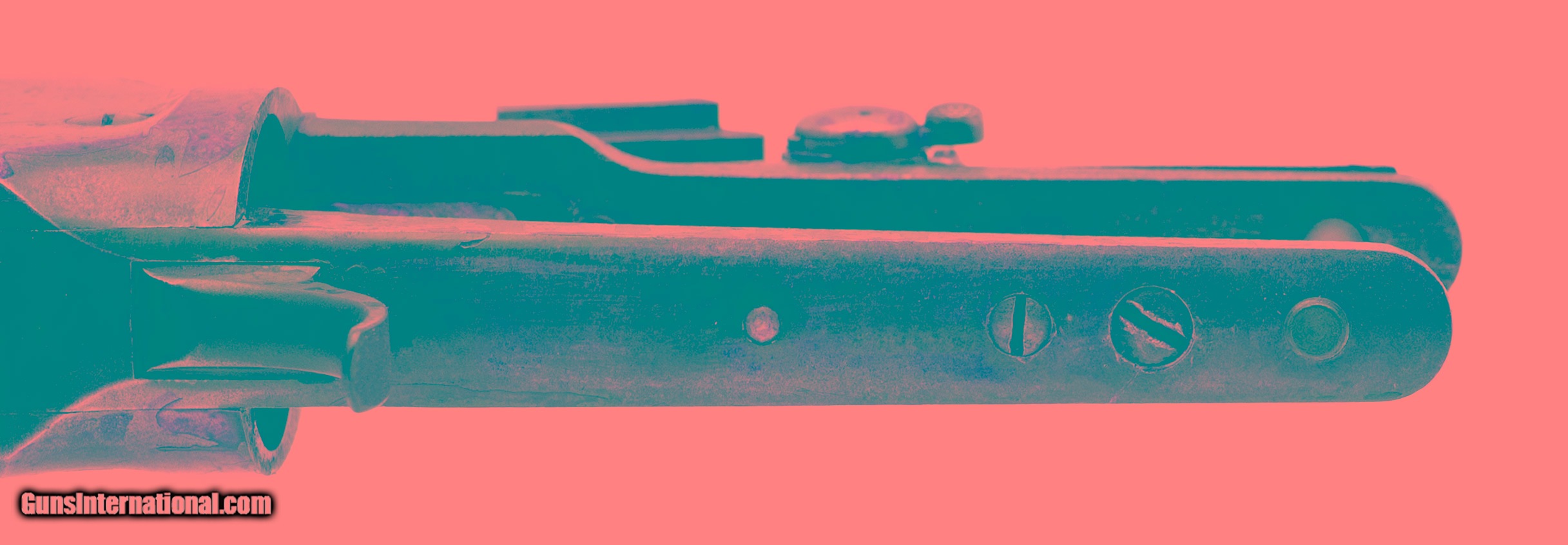 Description: "Serial Number 447523. Made in 1908. Although all internal receiver components are present along with the tang screw, there is no barrel, no magazine, and no furniture. Original factory finish has aged into a dull brownish patina. Equipped with a folding peep sight assembly that bolted to the rear tang. SOLD |