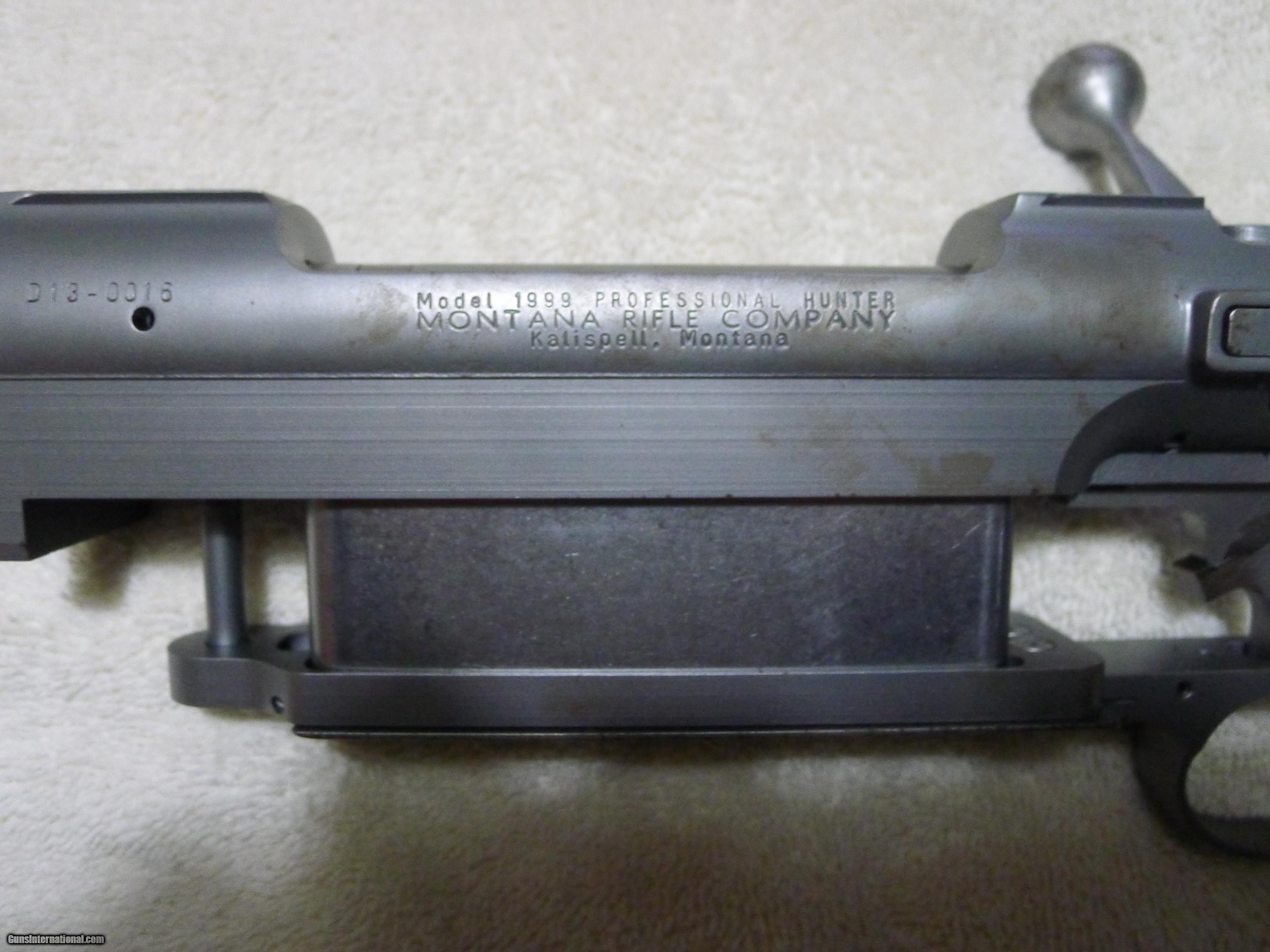 Description: This is a 1999 Montana Super action. This is the model PROFESSIOAL HUNTER ACTION. Serial #D13-0016.The action is chrome moly, with a bolt face for the 416 Rigby. The action is long enough for all the big calibers including the 505 Gibbs and any of the big A SQUARE cartridges. This is one of the initial subscription receivers when Montana needed a minimum of 500 orders to start production. I intended to my make a 450 Rigby but due to a devastating accident I can no longer shoot any heavy calibers. This action is equivalent to the super large Granite Hill actions. It has a 3 position Model 70 style safety, a Model 70 style trigger, a straddle floor plate. The action weighs app. 4 pounds.Magazine length 3 7/8 " See all photographs included in the photos are the original paper work from M ontana and the shipping box they shipped the action to me in. If needed I can supply more pictures. Buyer pays shipping. USPS Priority mail,Item will be insured for the sales amount an accurate shipping fee will be determined at end of sale. a close estimate will be $45.00. QUESTIONS ASK BEFORE . Note use email address to reach me . I am away from my phone most of the time. SOLD |