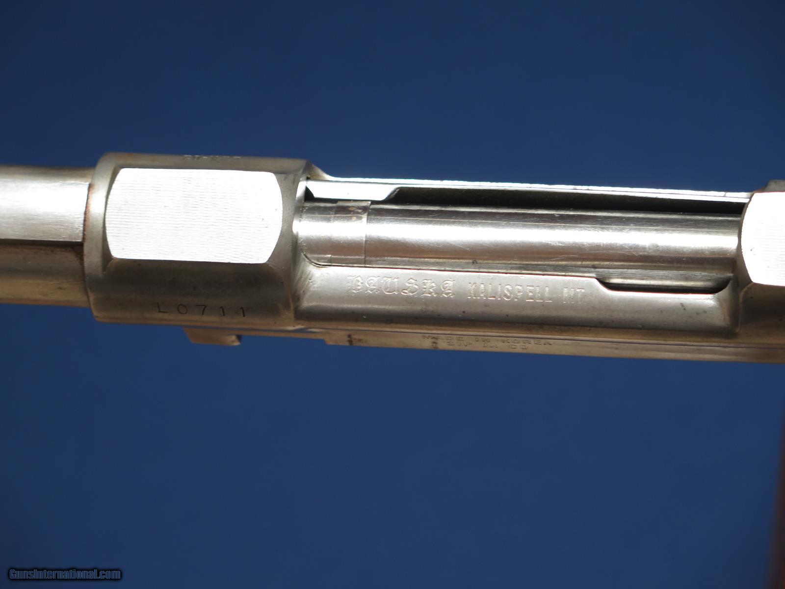 Description: Bauska double square bridge 375 H&H action and barrel. Kalispell Mt. Korea mfg. With Emil 24 in 1/2 oct and 1/2 round solid rib barrel. 3 fold down and 1 standing rear sights. Muzzle brake and front sight. In the white. Excellent. SOLD |