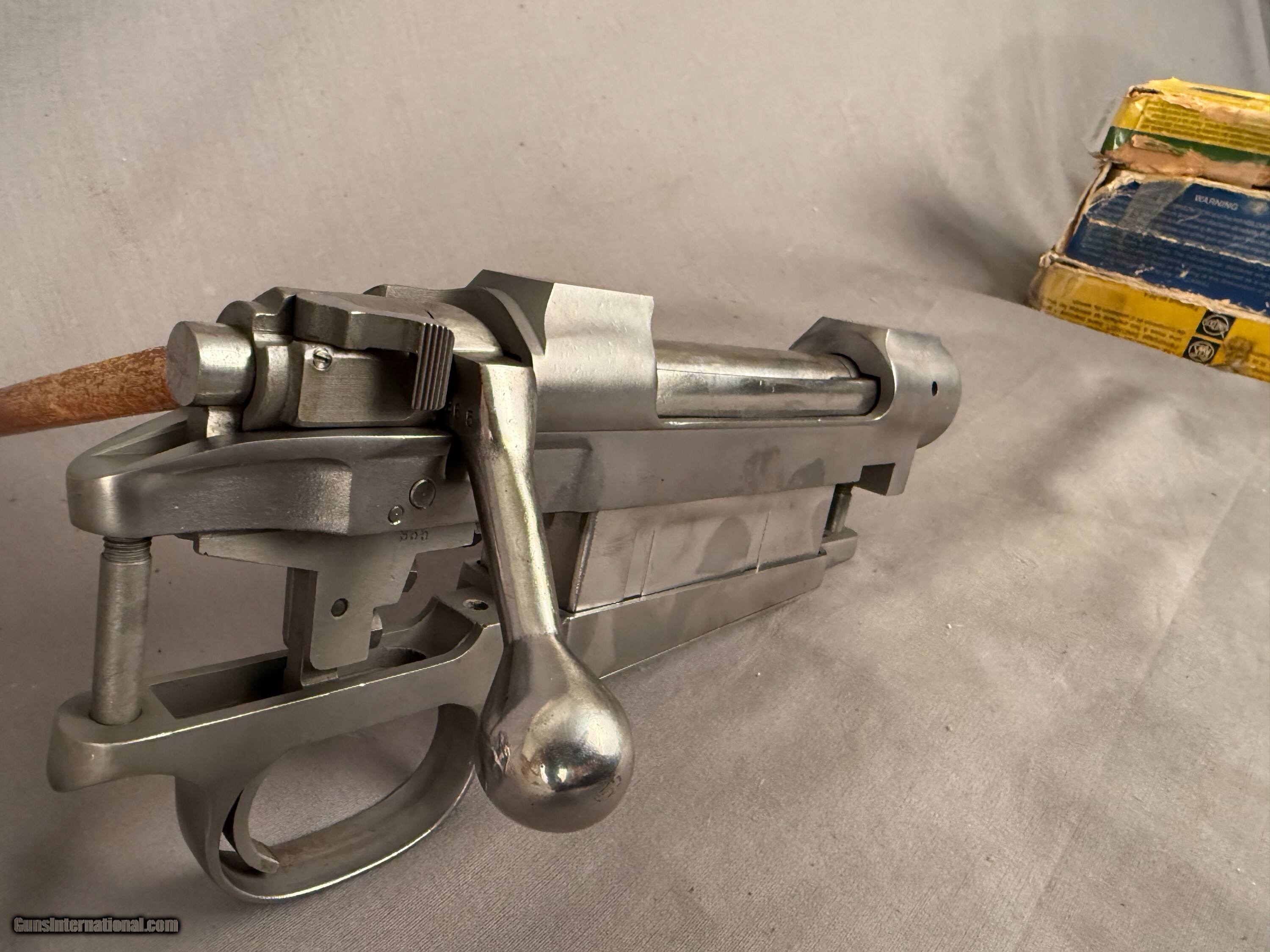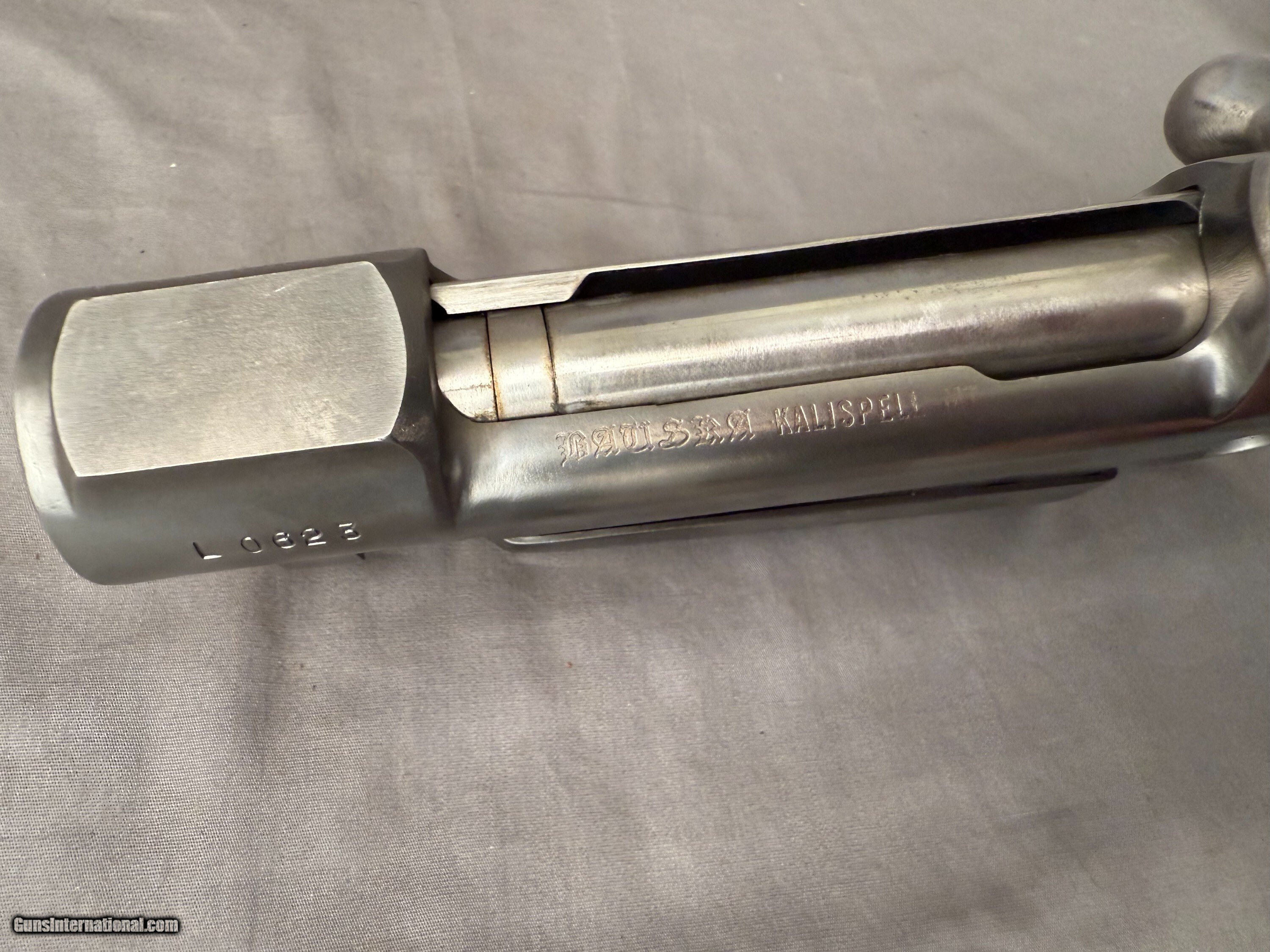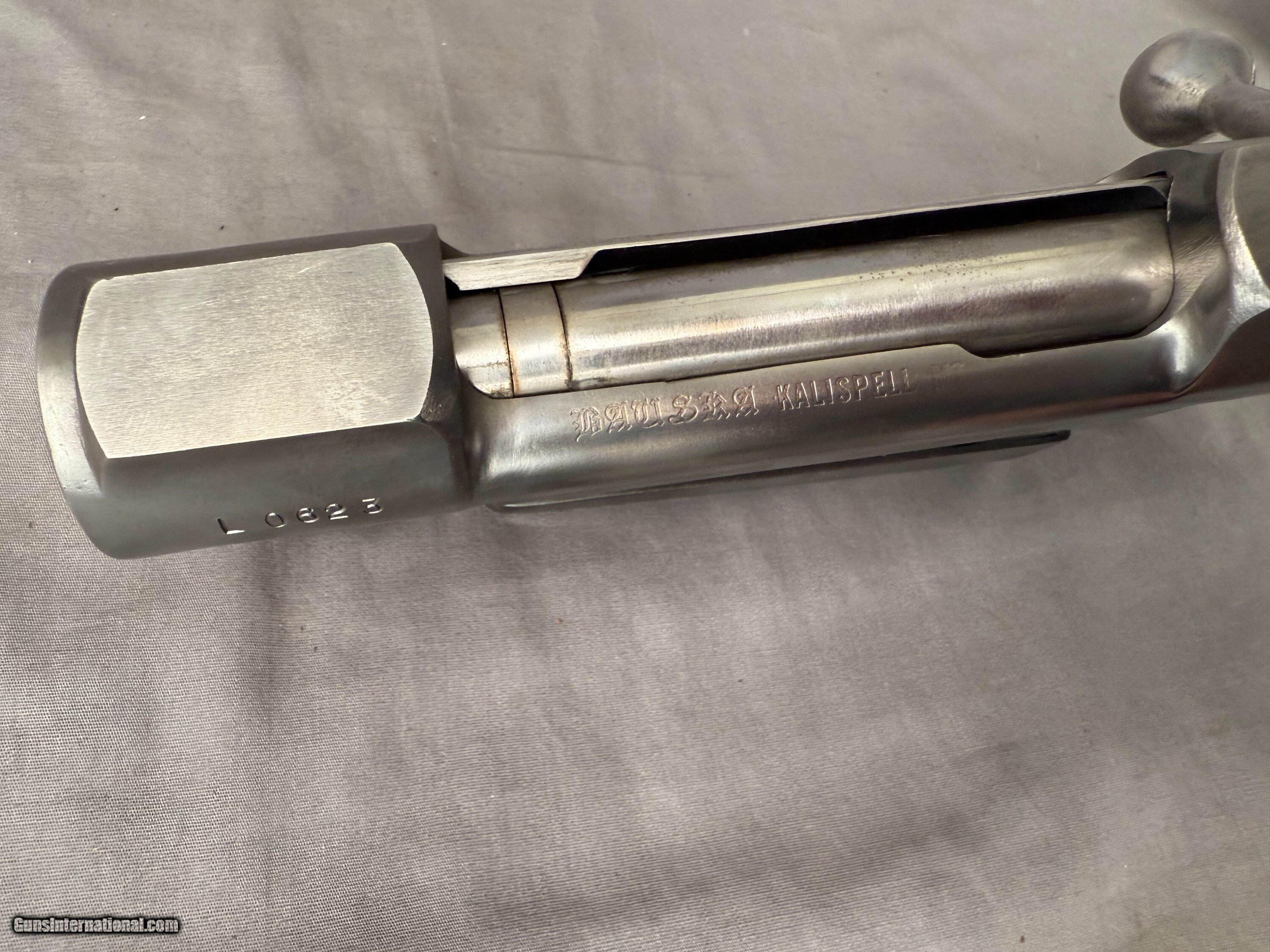 Description: Bauska BBK-02 Square Bridge Magnum Mauser Long Action. (Standard MAGNUM BOLT FACE) Description: Square Bridge magnum Mauser action with three possision safety, third locking lug, low bolt for scope compatability. Right hand model with solid left wall, intrigal "C" ring, Barrel shank threads are 12' pitch "V" threads.Guard screw spacing is 8 1/4". Action lenth is 9 3/16". Timney trigger and magnum guard opening. Weighs 3 pounds 6 ounces. Drop bottom magnum box and follower, hinged straddle style floor plate with push button release. Magzine box is 3.860' long. New in box. These are no longer made and hard to find. Price: $1,200.00 Contact Seller |
