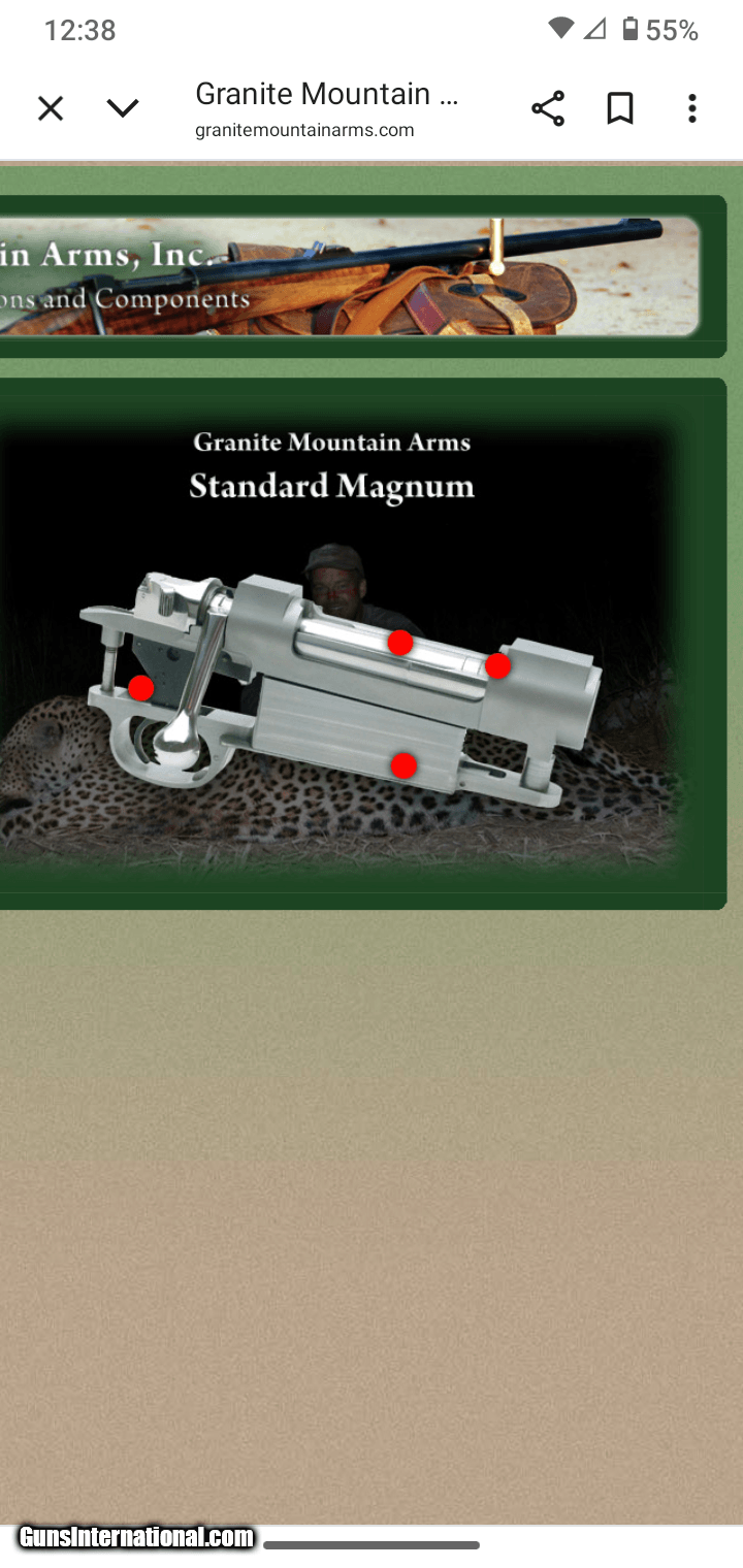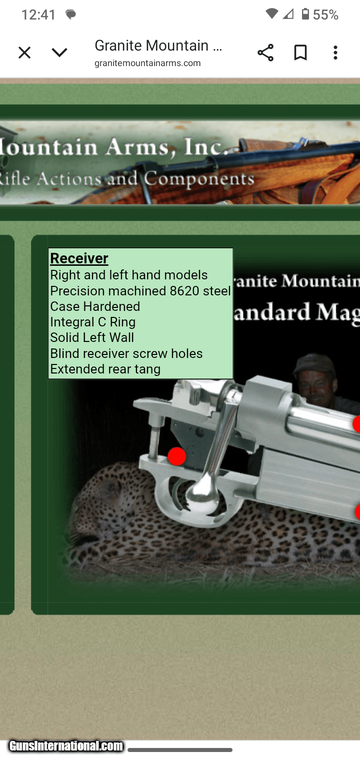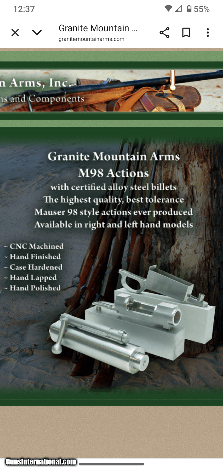 Description: Granite Mountain Arms Standard Magnum Left Hand M98 Action,Fits 375 H&H, 416 Rem. Size cartridges, Square Bridges cut for Talley QD scope rings. ,Spare parts ,Trigger, Trigger Pin,Shell Follower and Spring, Firing Pin and Spring, Bolt Stop , Ejector ,Spring,and Pin,Guard Screws, Extractor and Collar. Action and parts are all New ,One owner. SOLD Rifle Caliber: .375 H&H Magnum |