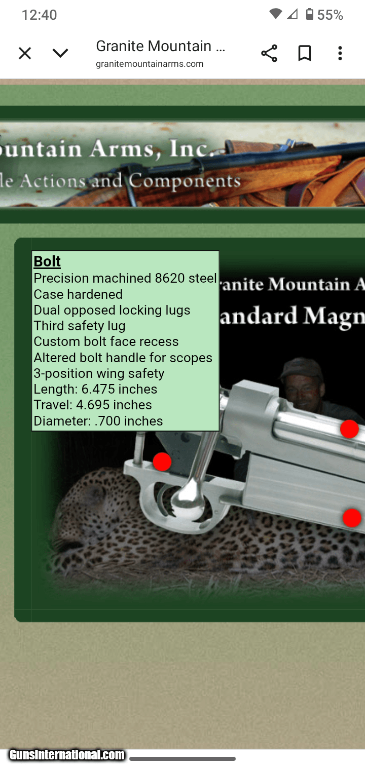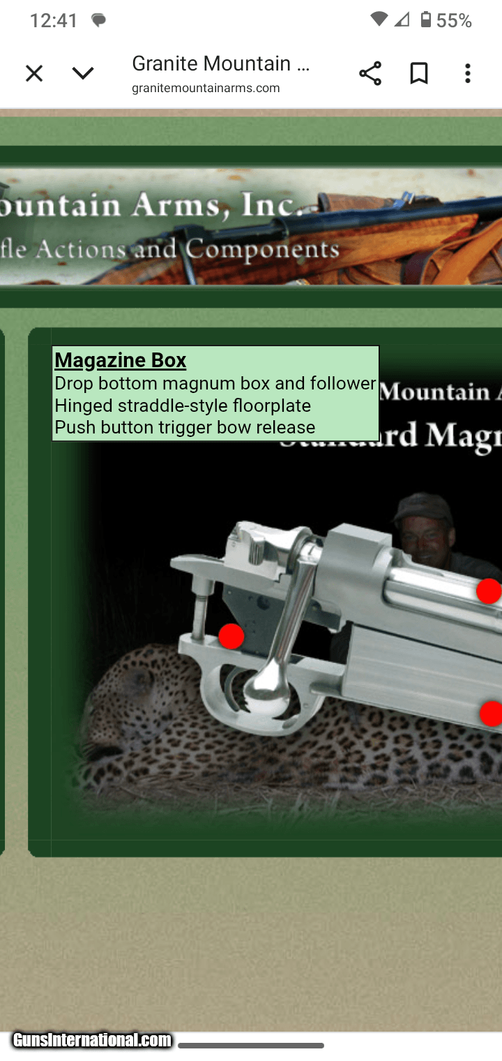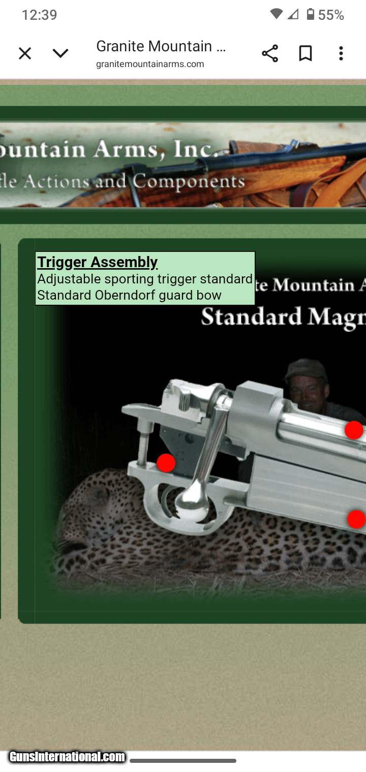 Description: Granite Mountain Arms Standard Magnum Left Hand M98 Action,Fits 375 H&H, 416 Rem. Size cartridges, Square Bridges cut for Talley QD scope rings. ,Spare parts ,Trigger, Trigger Pin,Shell Follower and Spring, Firing Pin and Spring, Bolt Stop , Ejector ,Spring,and Pin,Guard Screws, Extractor and Collar. Action and parts are all New ,One owner. SOLD Rifle Caliber: .375 H&H Magnum |