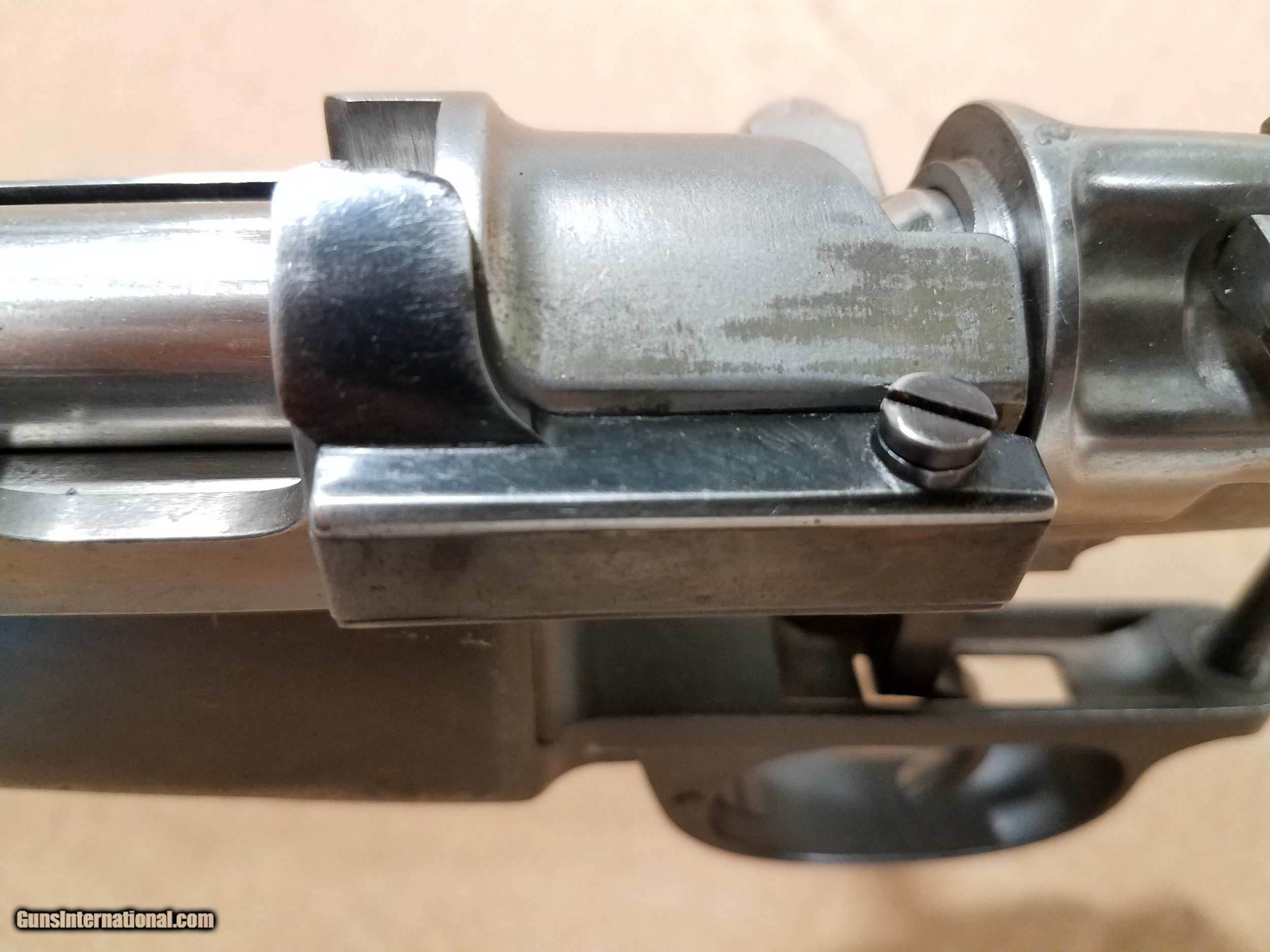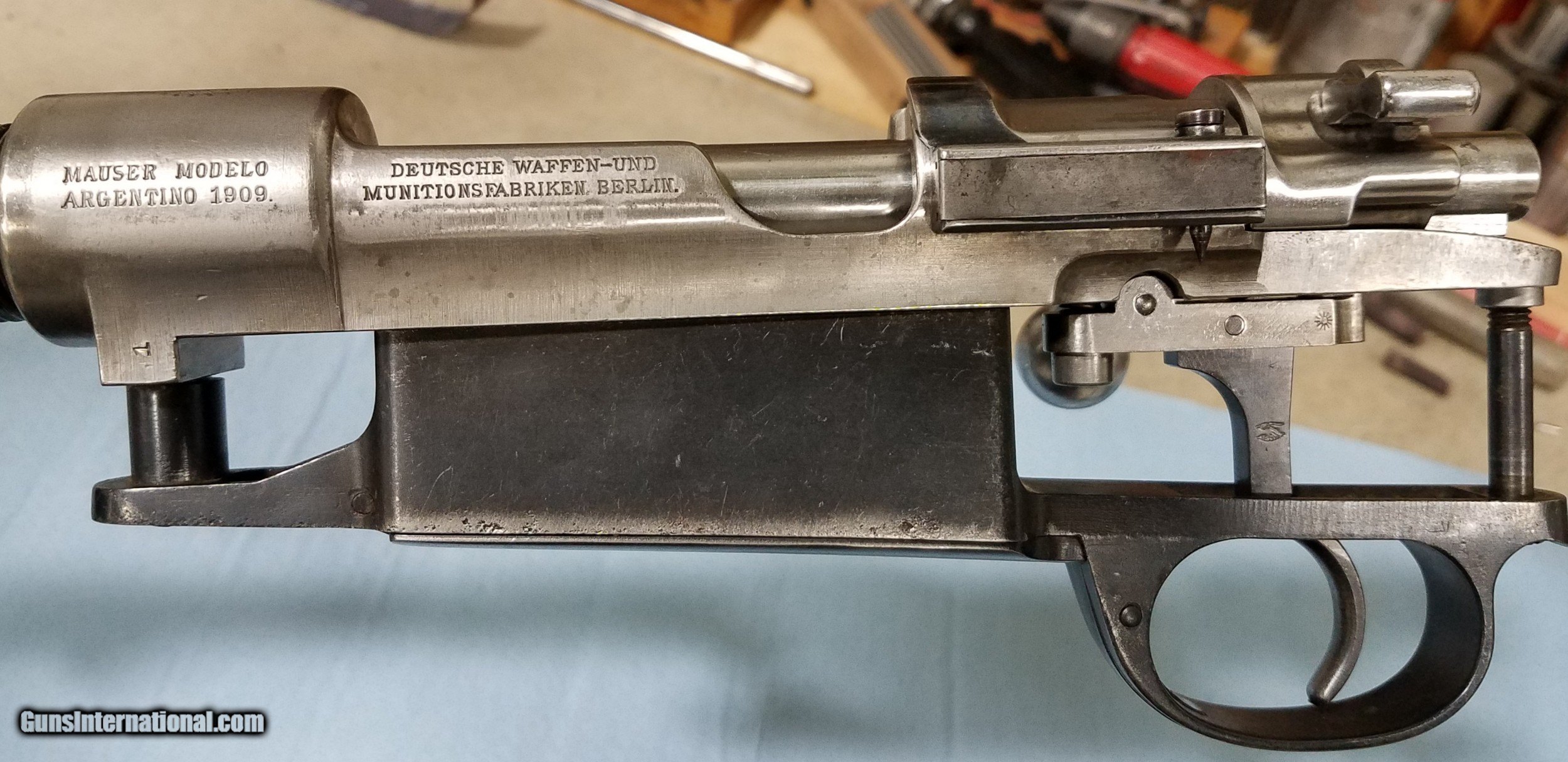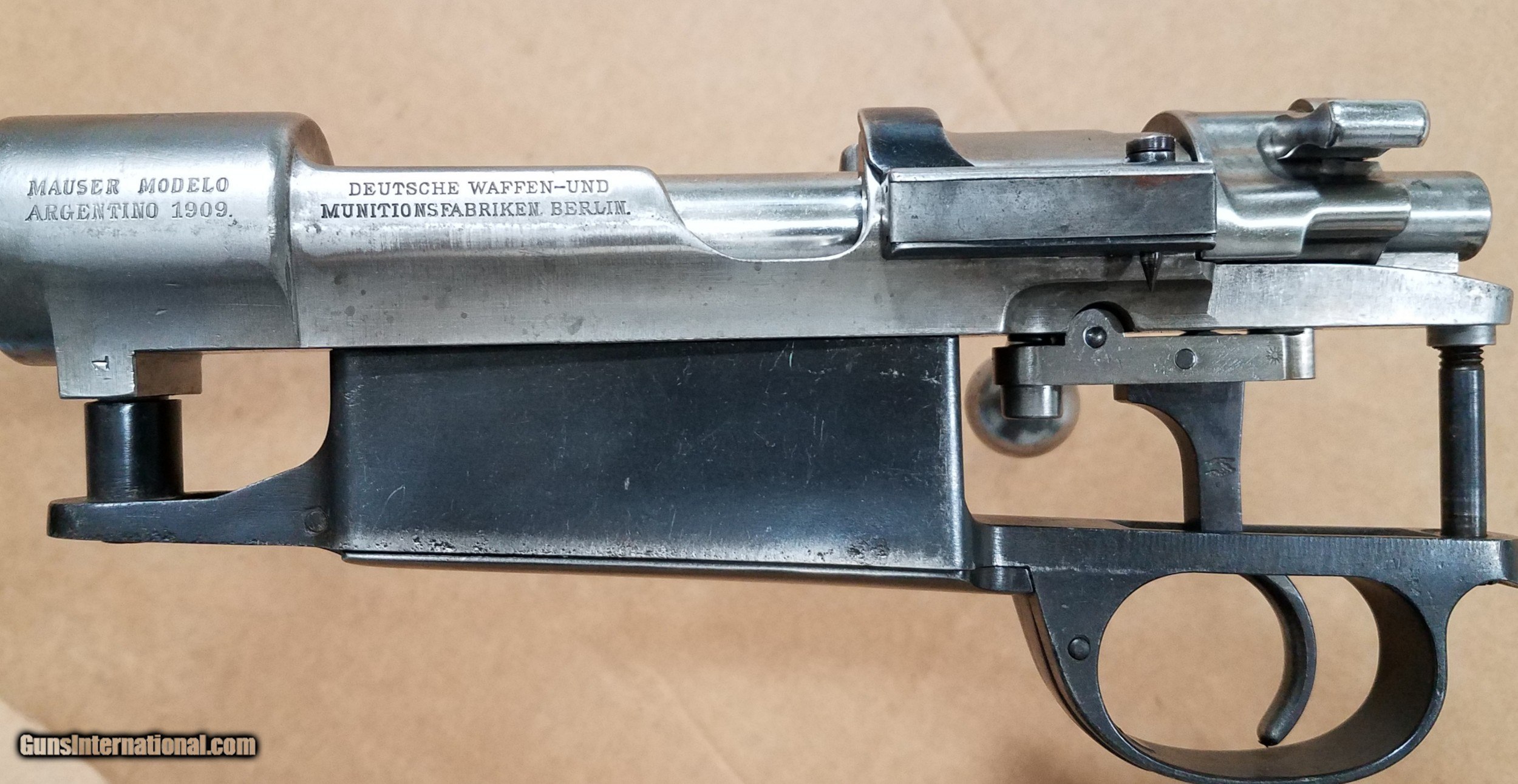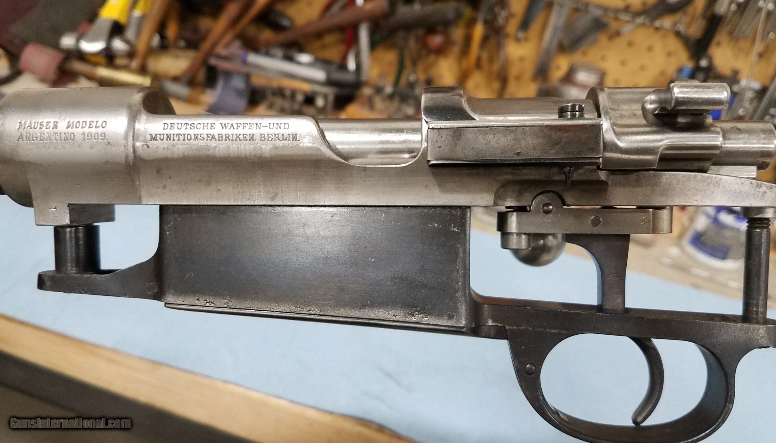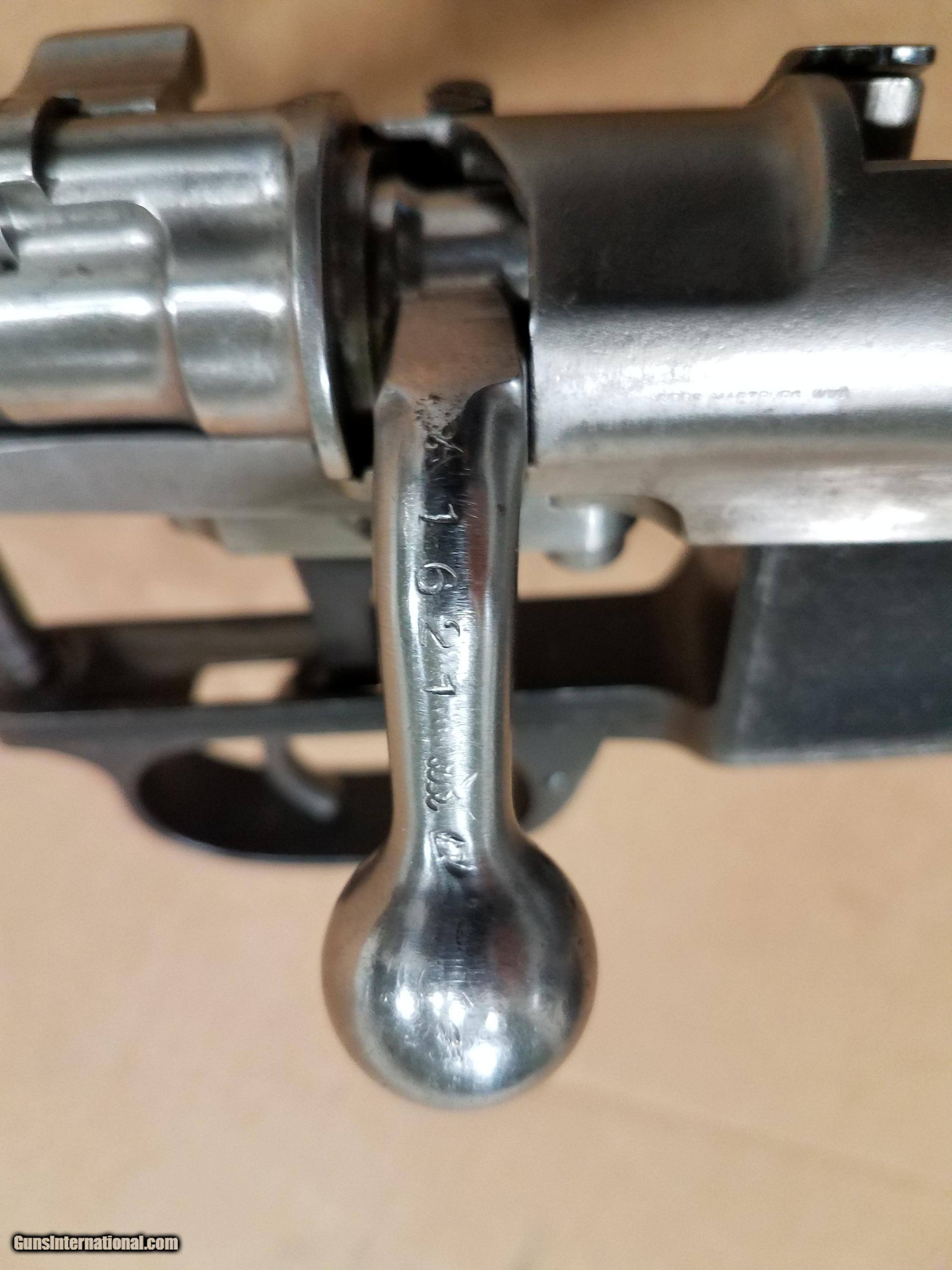 Description: A very nice early series German made 1909 Argentine action. Bolt is non matching but is in excellent condition. This action is ready for a new bolt handle, use the original bottom metal or buy a new piece from Swift /Blackburn. Convert the original safety of buy a new 3position. I LOVE THESE ACTIONS ! I've used them for calibers 257 Roberts to 500 Jeffery. Yes, Mausers are alot of work and more expensive for a custom build rather than to use a pre- 64, but I think it's worth the effort. Make no mistake the model 70 is a great action, I just think the Mauser has more character and really shows off a gunsmiths talent when done properly. SOLD |