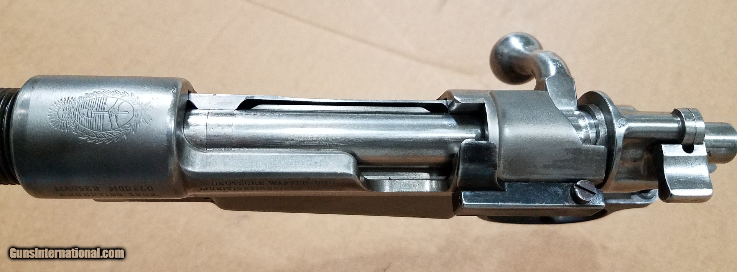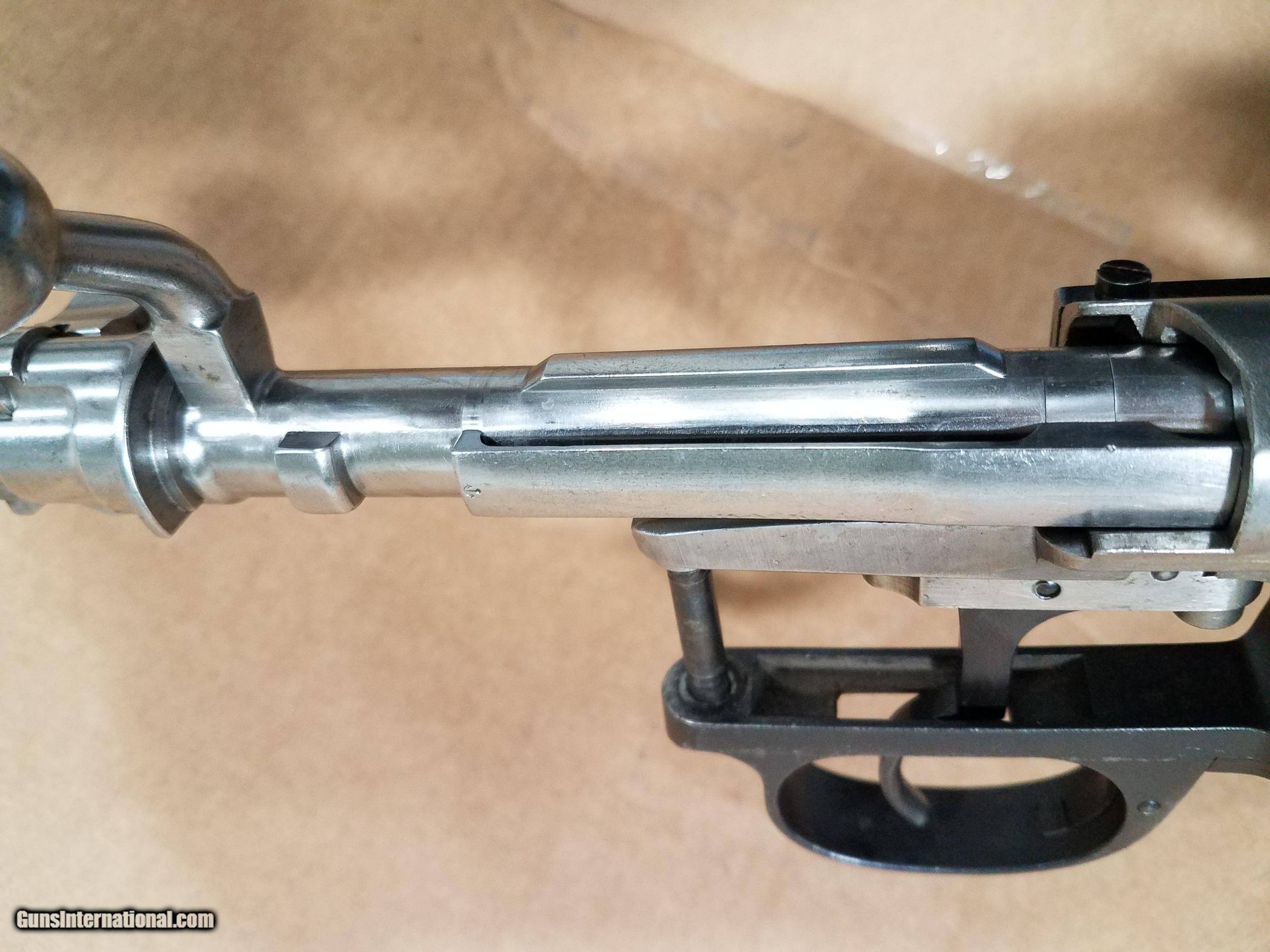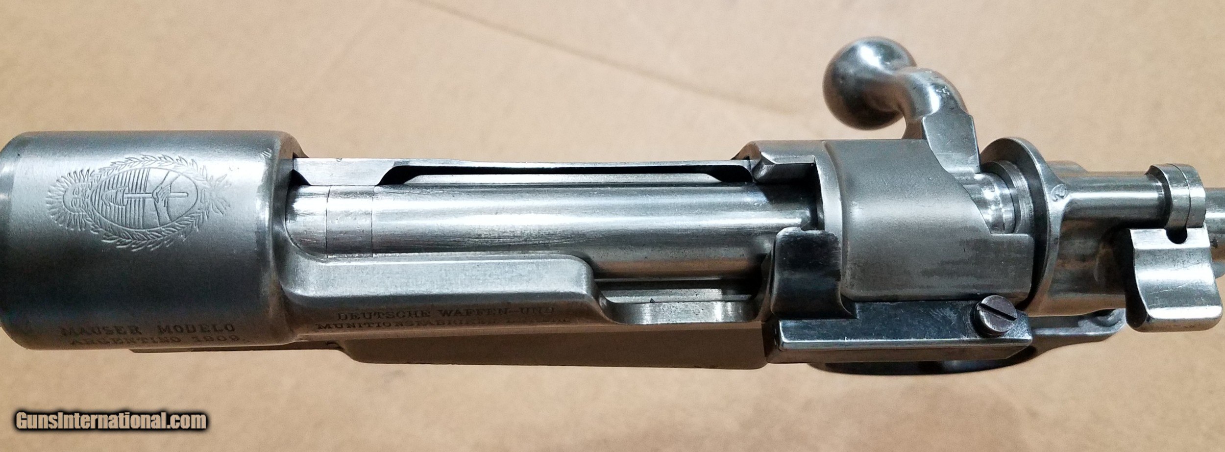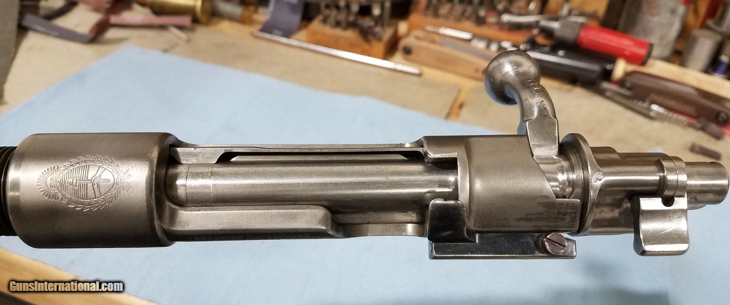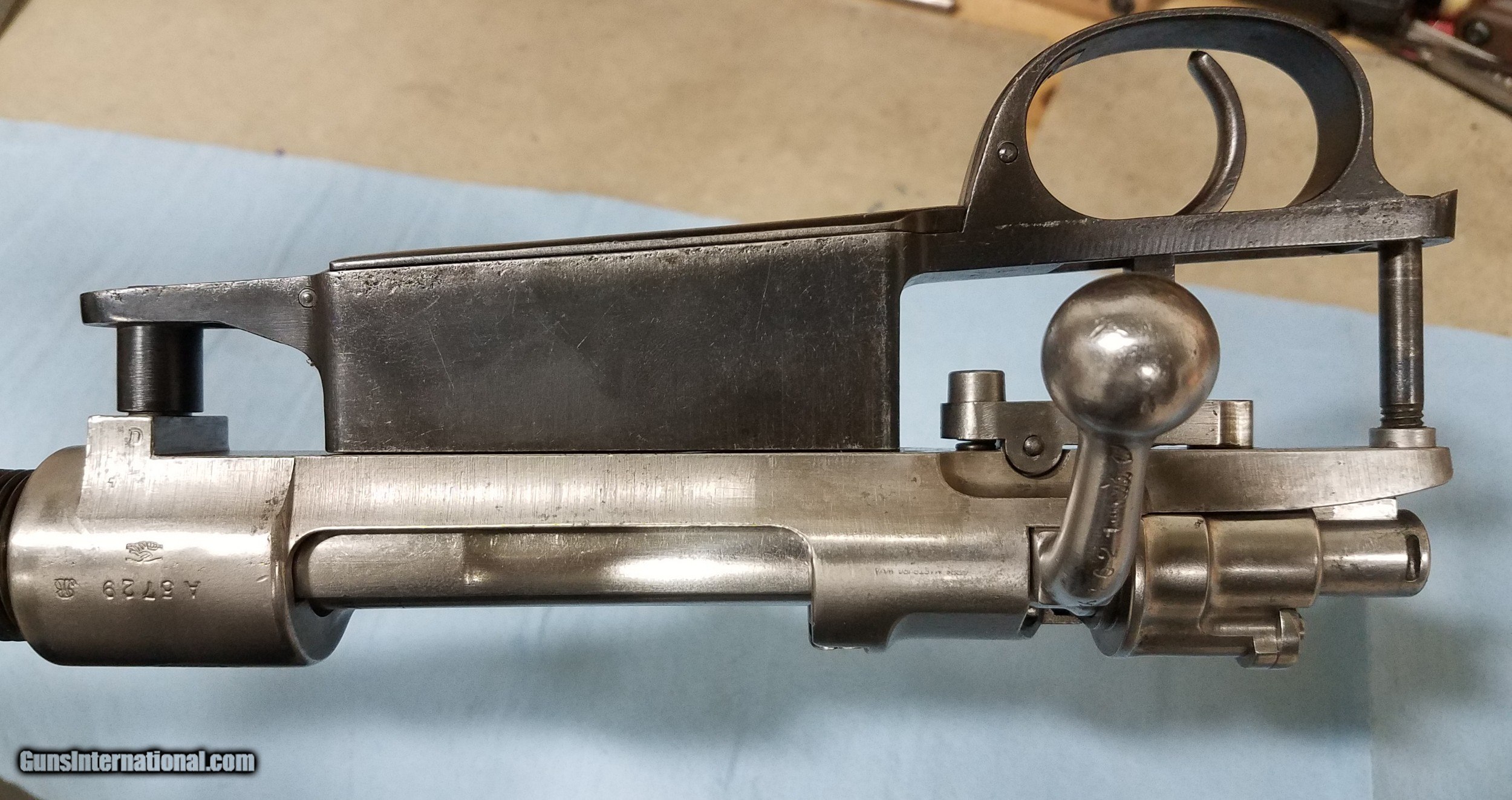 Description: A very nice early series German made 1909 Argentine action. Bolt is non matching but is in excellent condition. This action is ready for a new bolt handle, use the original bottom metal or buy a new piece from Swift /Blackburn. Convert the original safety of buy a new 3position. I LOVE THESE ACTIONS ! I've used them for calibers 257 Roberts to 500 Jeffery. Yes, Mausers are alot of work and more expensive for a custom build rather than to use a pre- 64, but I think it's worth the effort. Make no mistake the model 70 is a great action, I just think the Mauser has more character and really shows off a gunsmiths talent when done properly. SOLD |