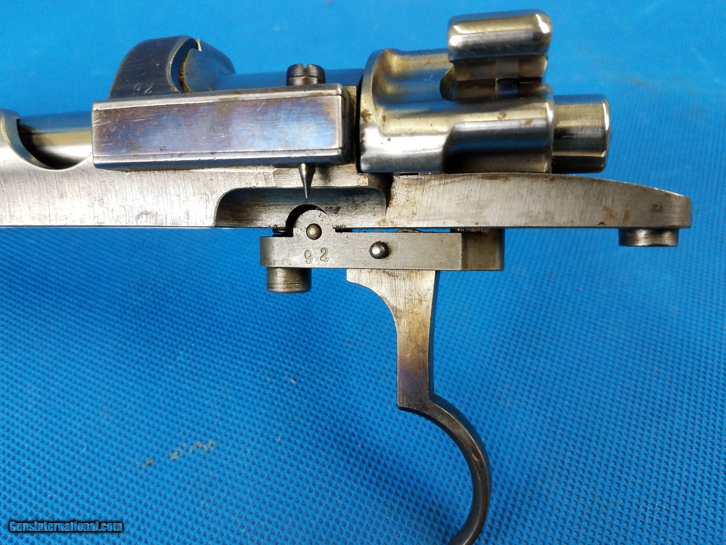 Description: Beautiful 1909 Peruvian Mauser action ( bottom metal not included) These actions are of the highest quality Oberndorf had to offer. Higher standards were demanded for German made military arms than commercial and this action is a perfect example. While they are a perfect action for a 7x57, they can be used for 30-06 length cartridge with some work and new bottom metal. With the longer, large ring, small threads they are a great choice for a take down. The standard .980 threads can be removed and larger, square threads can be cut in. An extremely versatile action for custom rifles. SOLD |